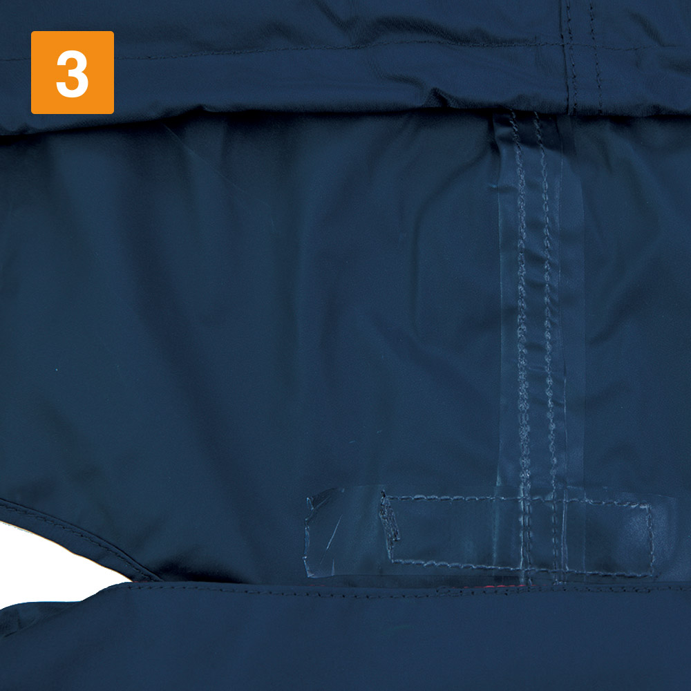 今回、実際にスタッフが着用してみました。ふっくらと全面に入った中綿とPVCコーティングによる、暖かな着心地がとても快適な一着です。寒さや水から体を守るだけでなく、服の中の熱をとどめて逃さないので、一日中暖かくお過ごしいただけます。さらにウエストにはシャーリングが施されており、下からの冷気の流入をシャットアウト。また襟部分にはメッシュを使用し、蒸れがちな首まわりを涼やかに保つ通気性がプラスされています。