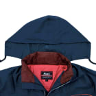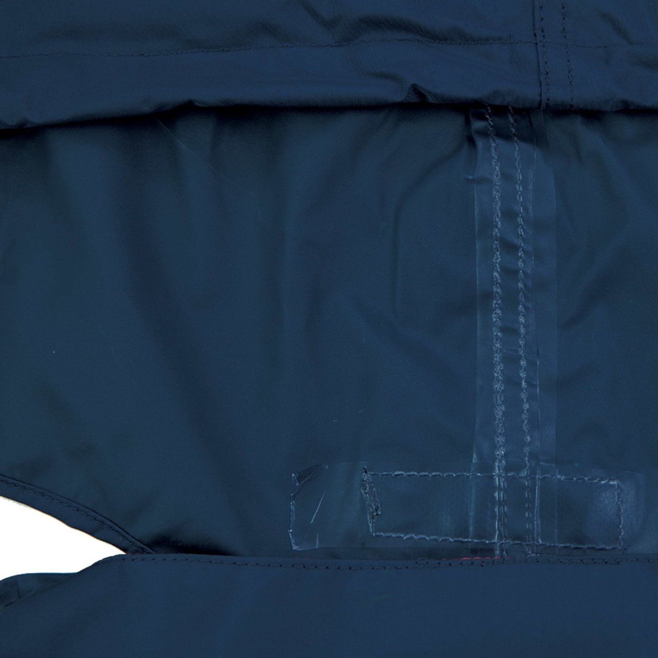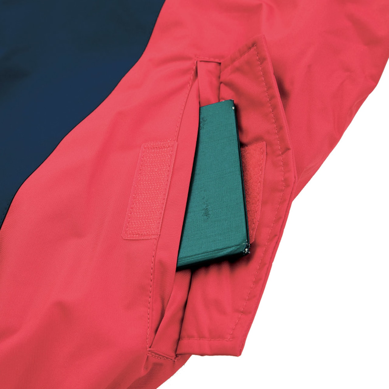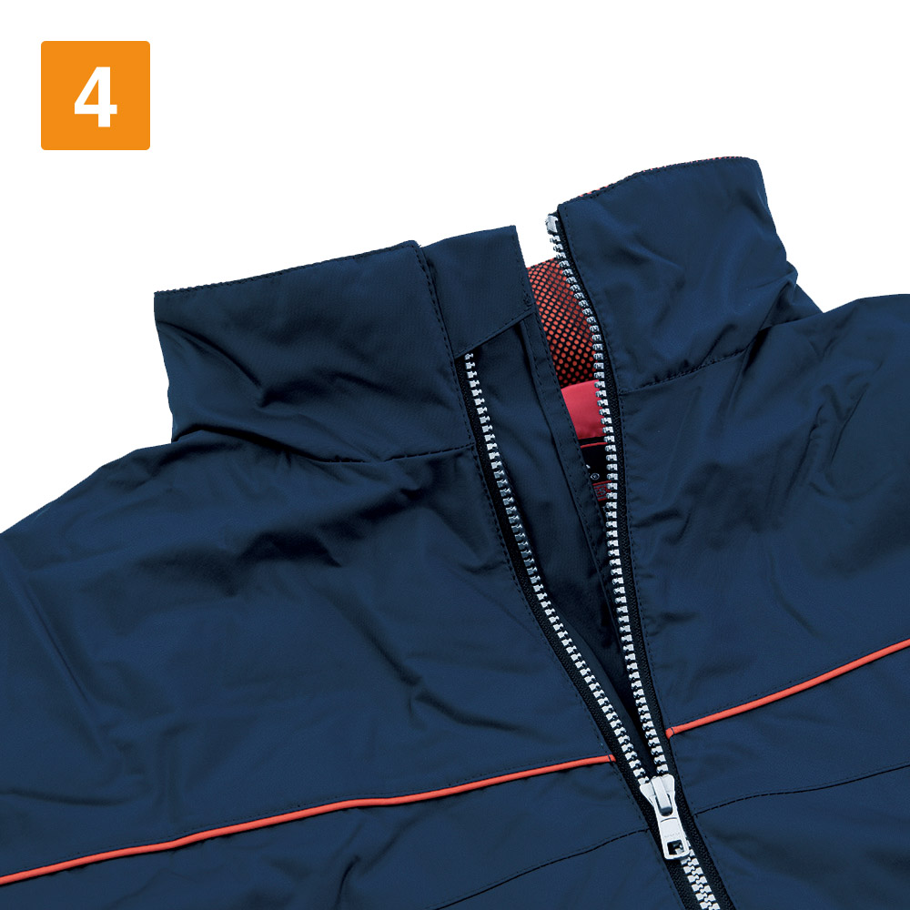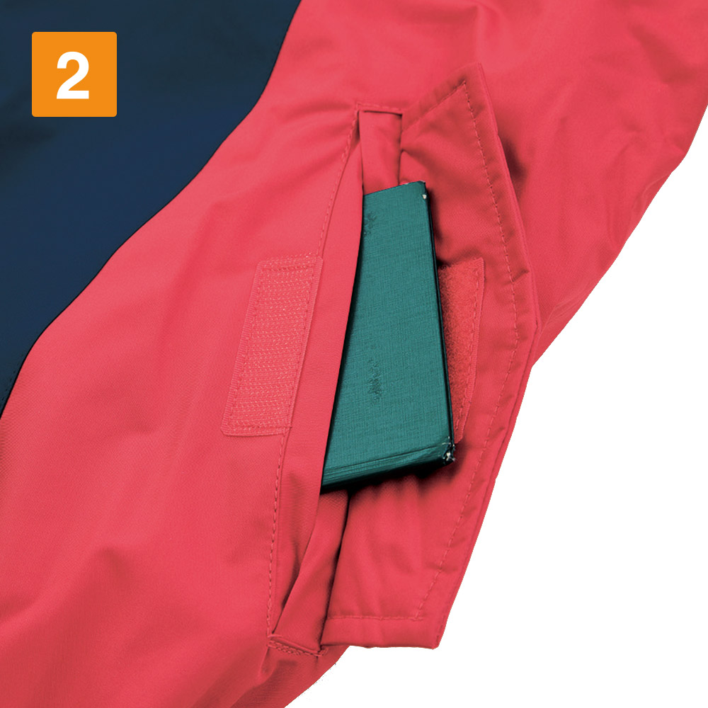 本体生地である高密度ポリエステルタフタは、耐水圧8000mmという超高スペック防水性能を持つまさに全天候型ウェア。突然の雨や雪から豪雨まで耐え抜くタフな素材です。さらに生地にはPVCコーティングをプラスすることで、耐水性をより強化。ビニール素材でコーティングすることで、風にも強い最強生地が完成しています。また収納ポケットの開口部にはすべてファスナーや逆玉仕様とし、こちらもしっかり水濡れから物を保護してくれます。