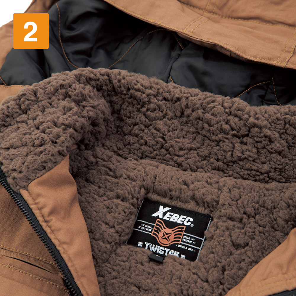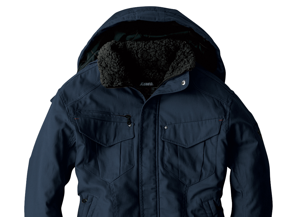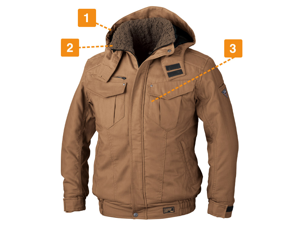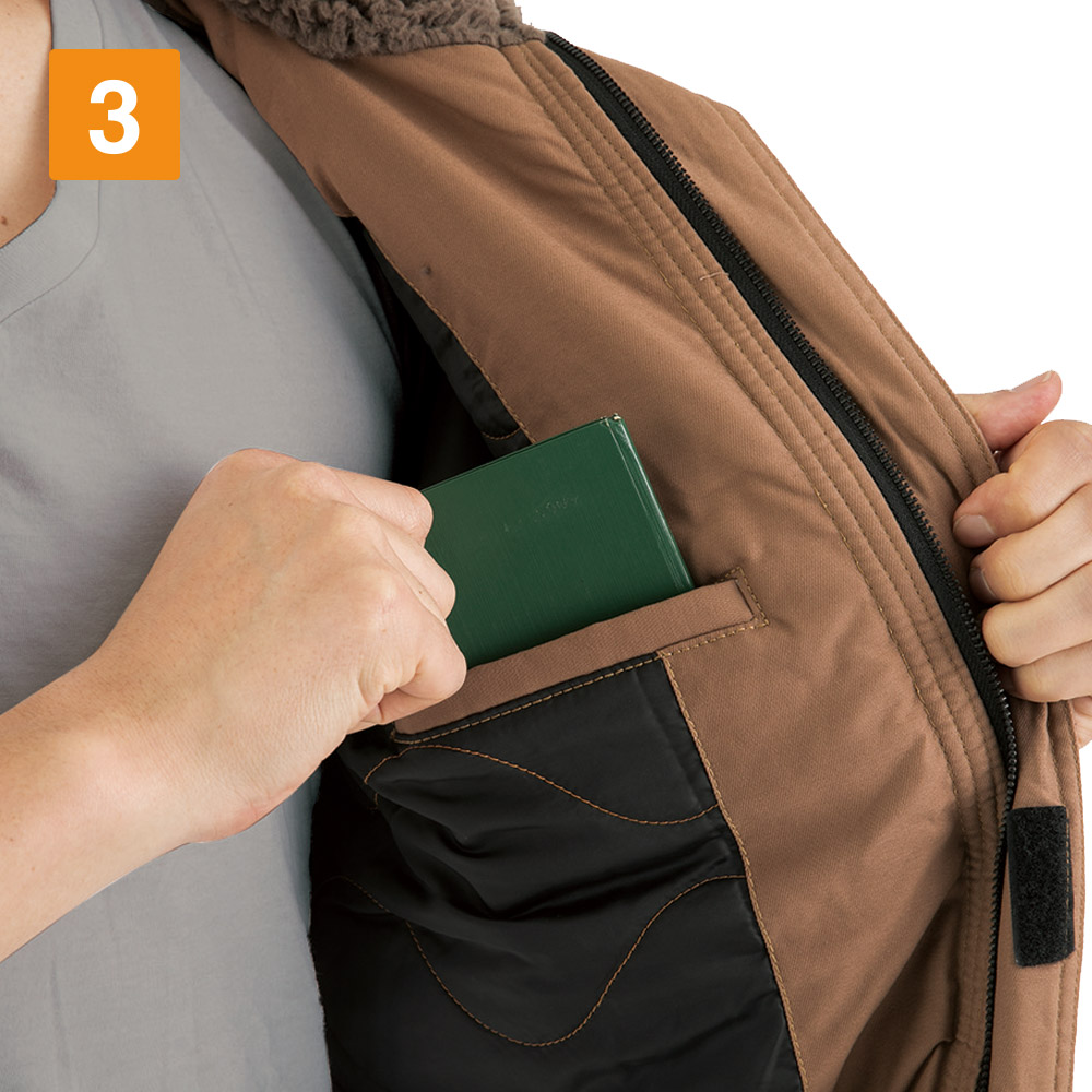 使用されているバックツイル生地は、火や熱に強い綿100%の素材。火気に近い環境でも安全に着用いただけるブルゾンに仕上がっています。さらにファスナーポケットの開口部を玉縁やフラップがカバーするデザインを採用。ポケット内部に火花が入らないので、火花が散る場所でもポケットに入れた物を傷める心配がありません。また生地内部には中綿が全面に配置されており、寒い場所でも暖かな着心地を実現。襟内側にはボアがあしらわれているので、首まわりをあたたかくカバーしてくれます。