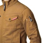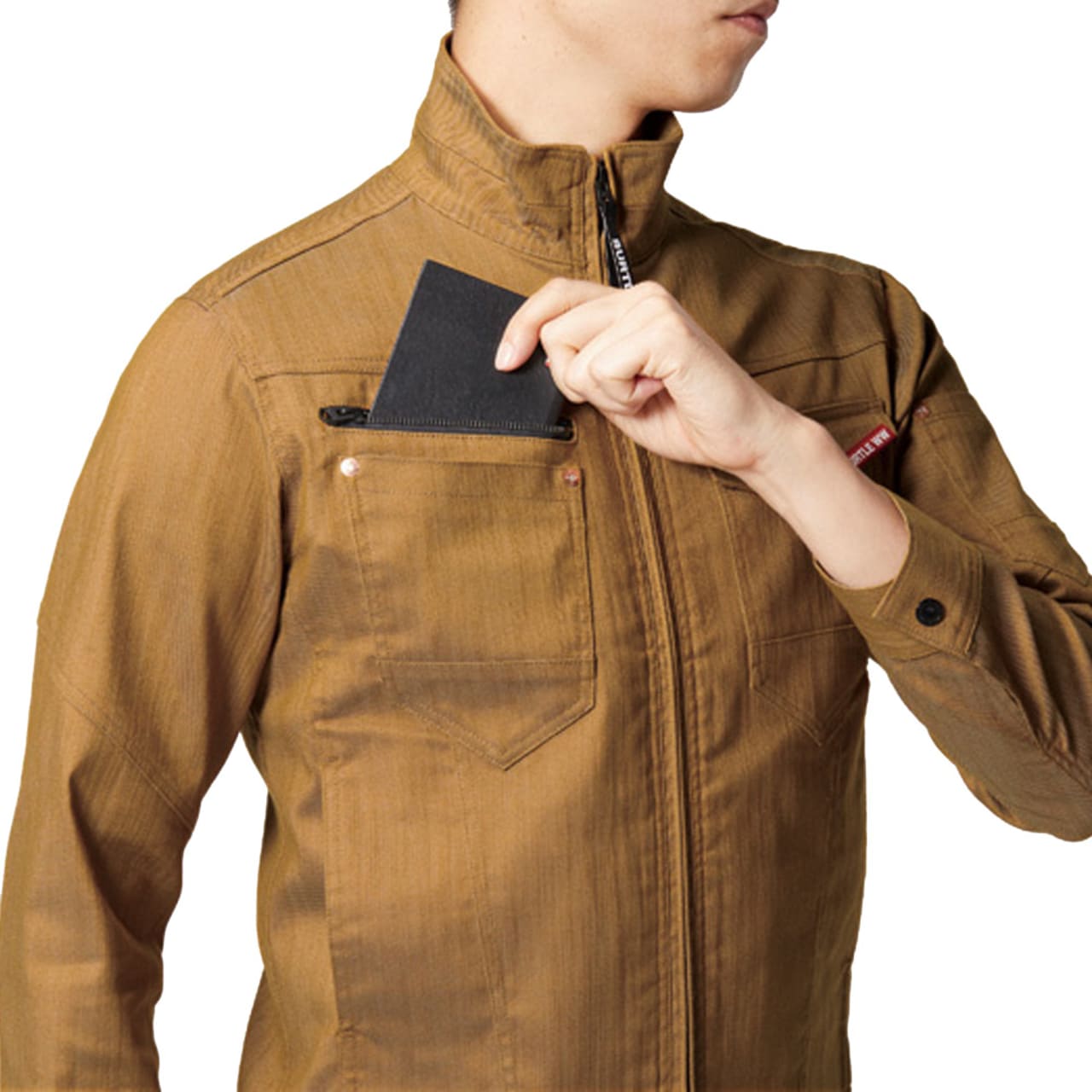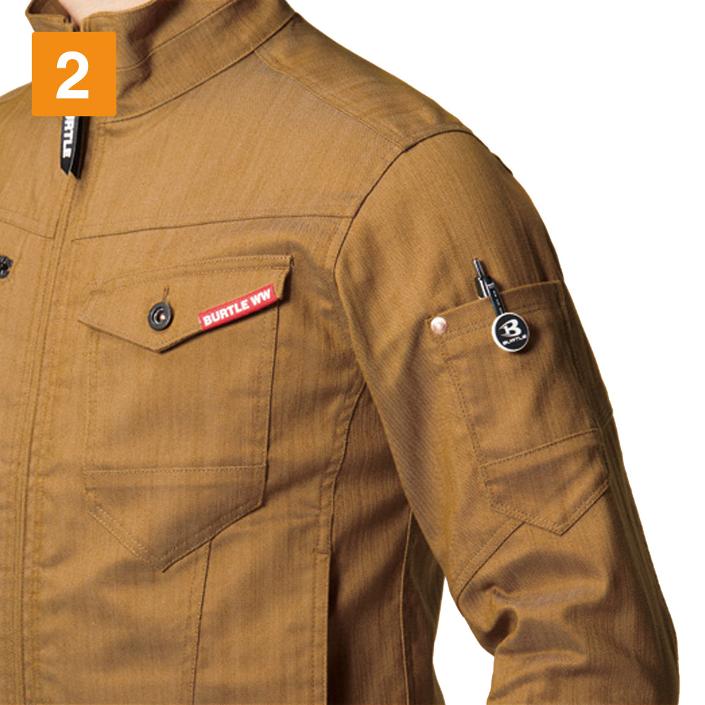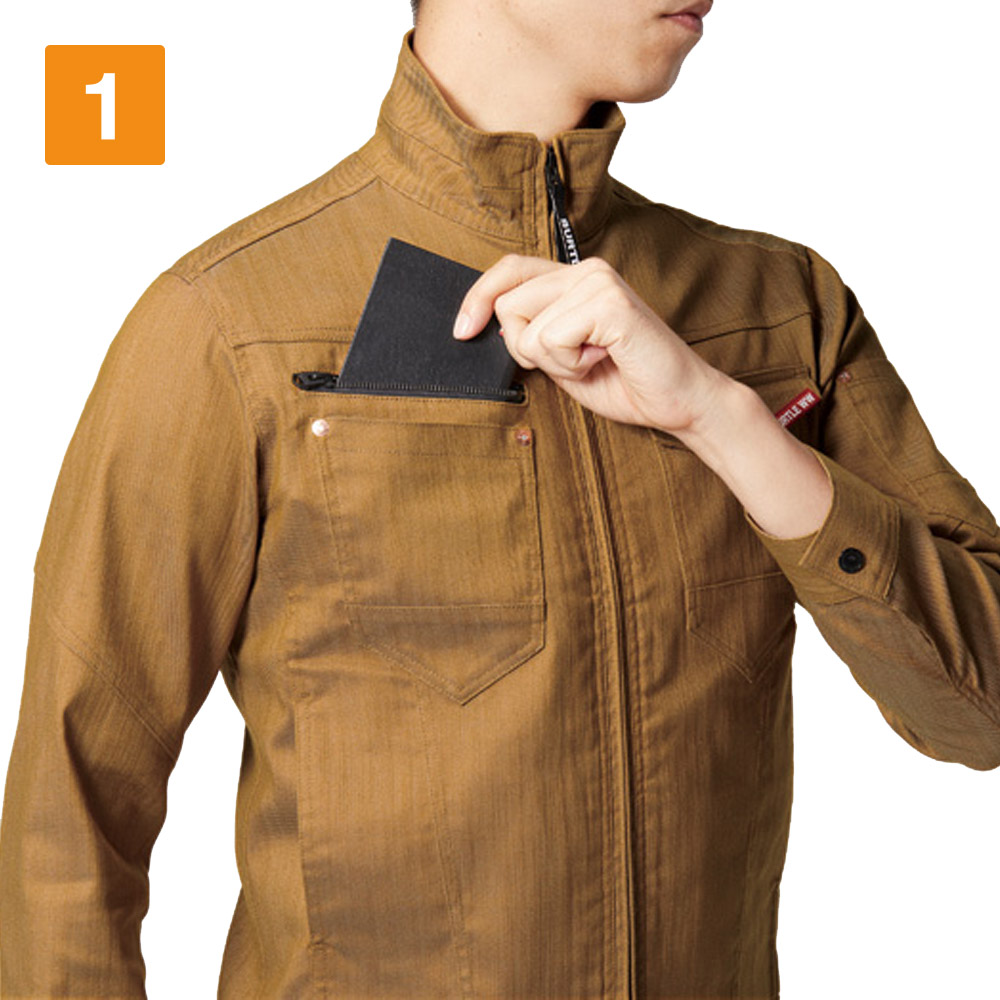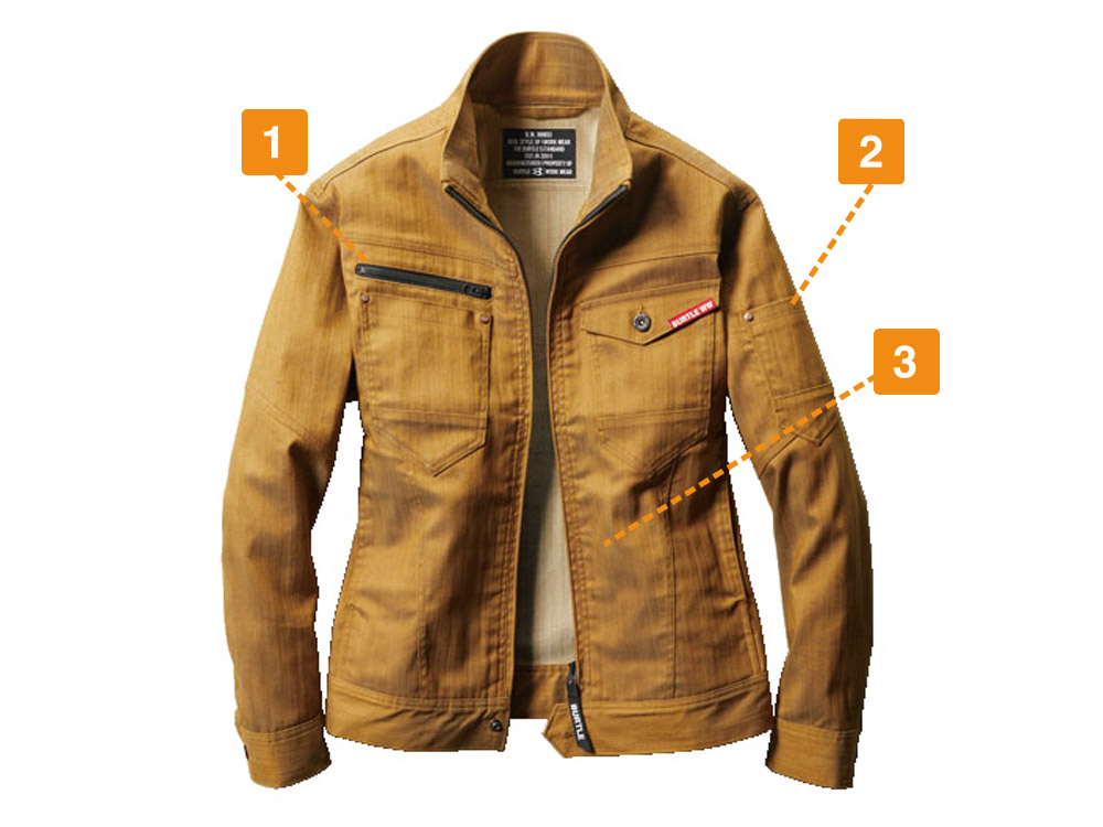 おしゃれな普段着のような生地感や遠くからのシルエットはもちろん、近くで見る細やかなデザインが人気のジャケットです。スタッフ内でも、かっこいいデザインアクセントがとても好評でした。ヴィンテージデニム的な質感に、胸の赤いロゴテープやファスナーテープ使いがセンスのよいアクセントに。また見た目を単調にさせないステッチ使いがクール。さりげなく存在感をプラスしています。ストレッチ生地を使用し充分な機動力を備えているので、タックなどのディテールをなくしとことん無駄を省いているのもポイントです。