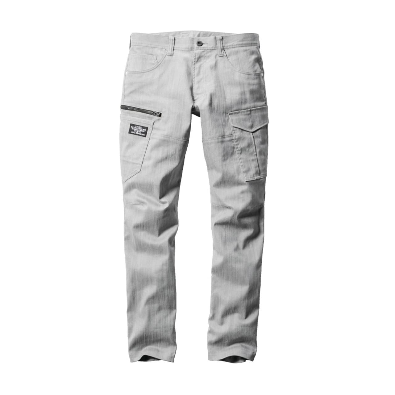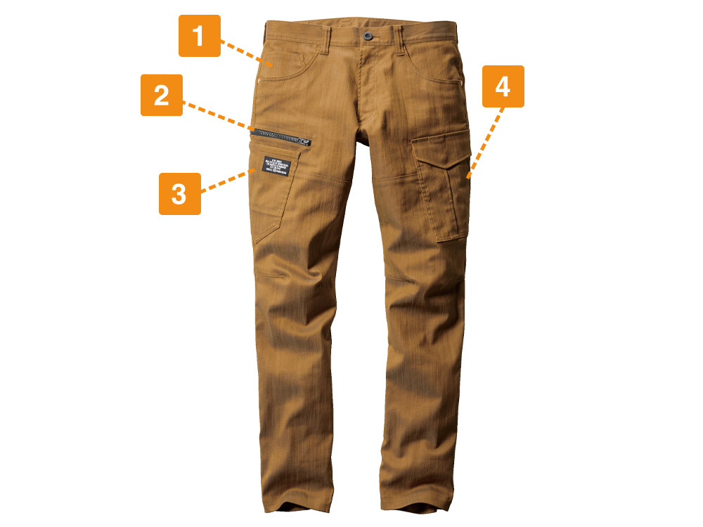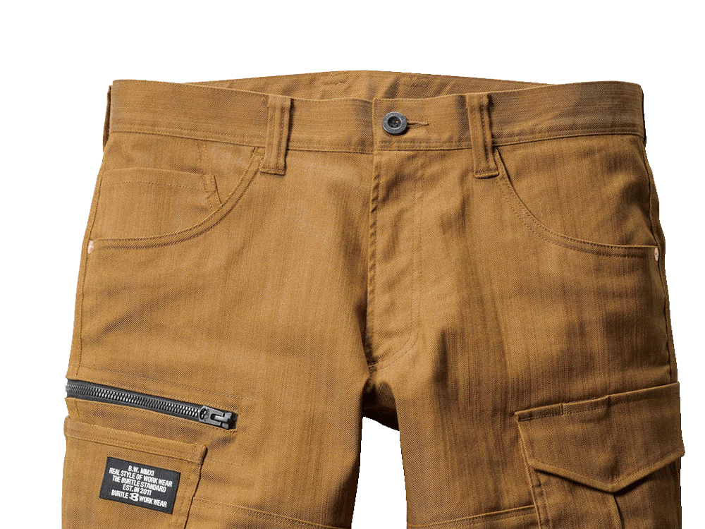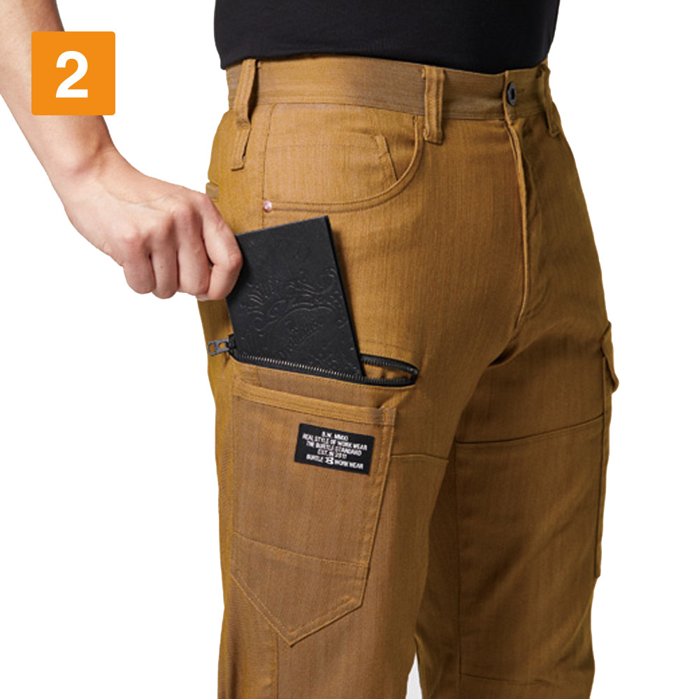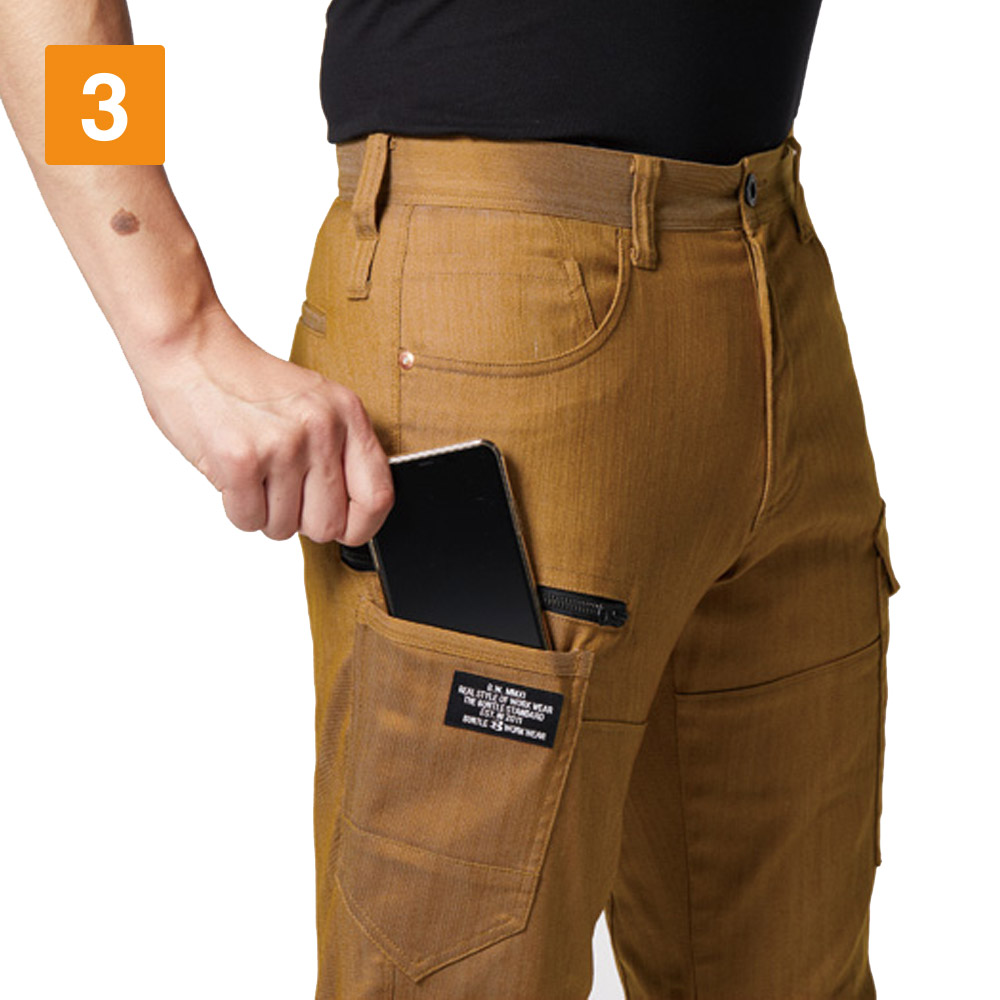 パンツに使用されているのは、ムラ糸を使用し片染めを施した交織ストレッチツイル生地。まるでヴィンテージデニムのような質感が、こなれた雰囲気を演出します。生地は綿を50%含むため、着用を重ねることで風合いが増していくのもポイント。自分だけの一着に育てていく楽しみがある一着です。タックやシャーリングのないタイトシルエットながら、360°に伸縮する伸長率17%のストレッチ性能により、動きやすさは抜群。体に沿う立体的な生地組み立ても相まって、現場での高い機動性を実現しています。