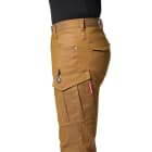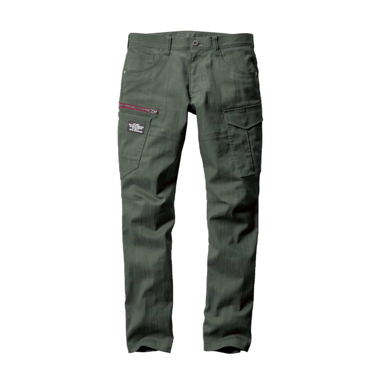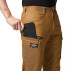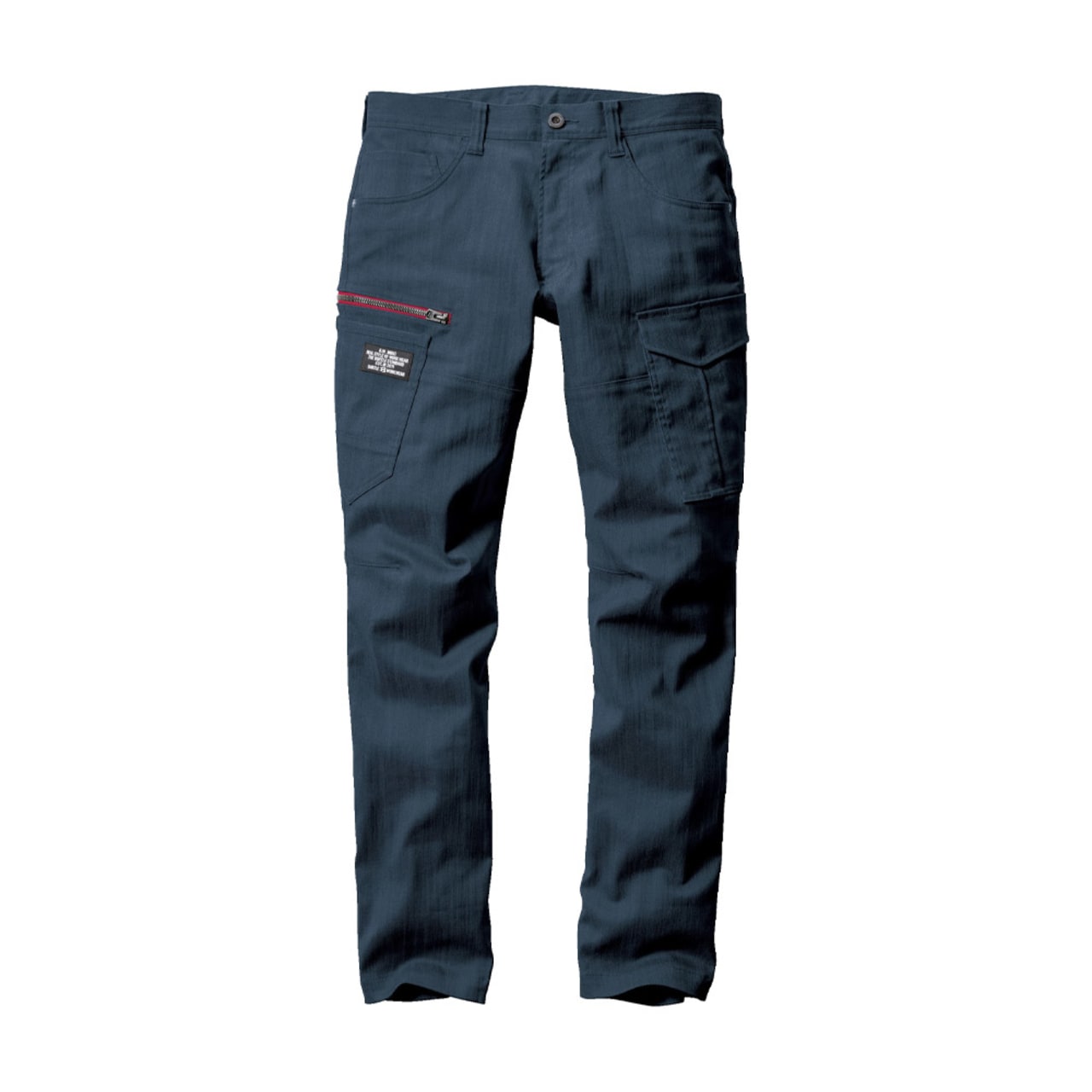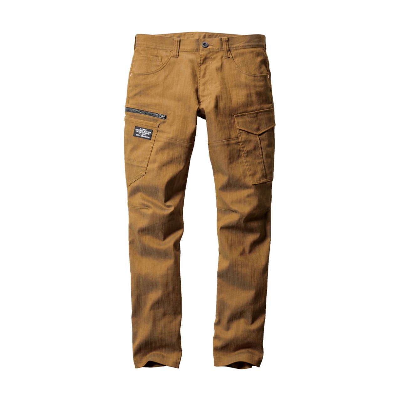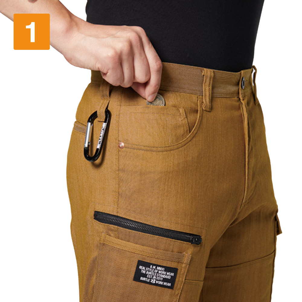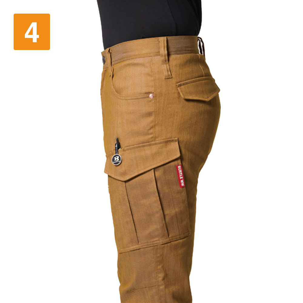 パンツに使用されているのは、ムラ糸を使用し片染めを施した交織ストレッチツイル生地。まるでヴィンテージデニムのような質感が、こなれた雰囲気を演出します。生地は綿を50%含むため、着用を重ねることで風合いが増していくのもポイント。自分だけの一着に育てていく楽しみがある一着です。タックやシャーリングのないタイトシルエットながら、360°に伸縮する伸長率17%のストレッチ性能により、動きやすさは抜群。体に沿う立体的な生地組み立ても相まって、現場での高い機動性を実現しています。