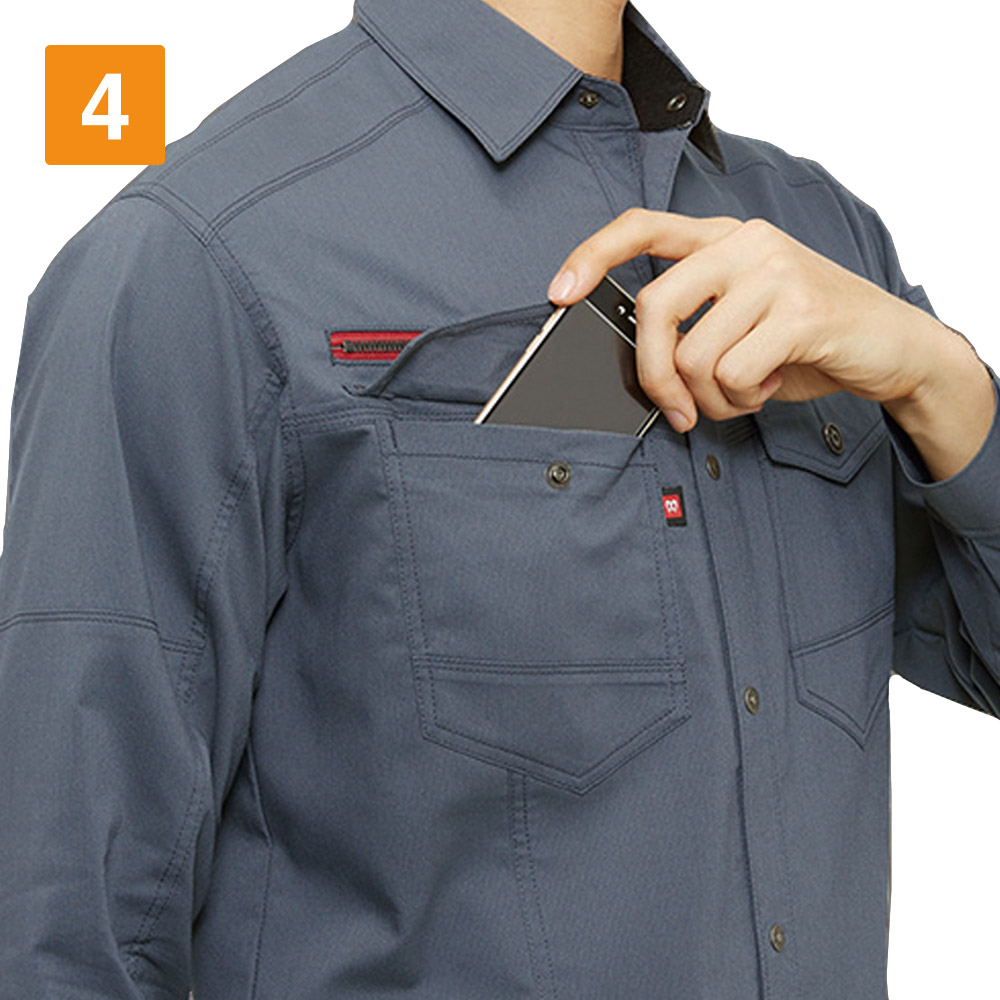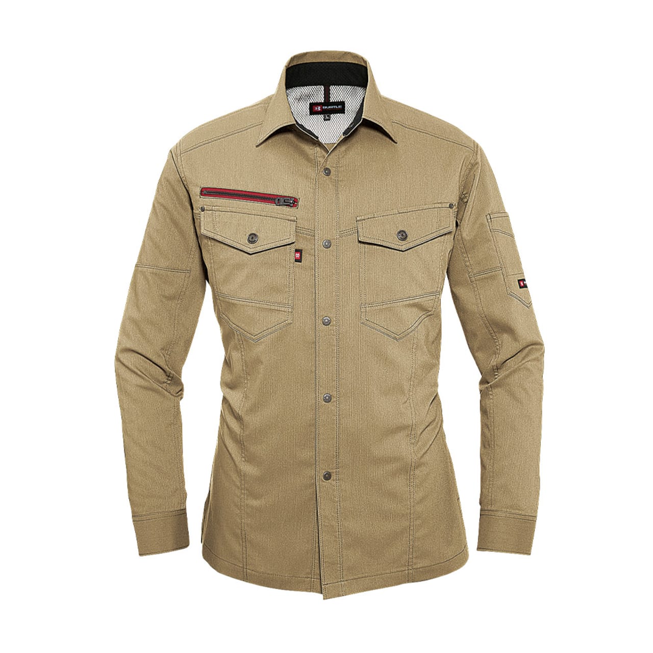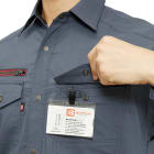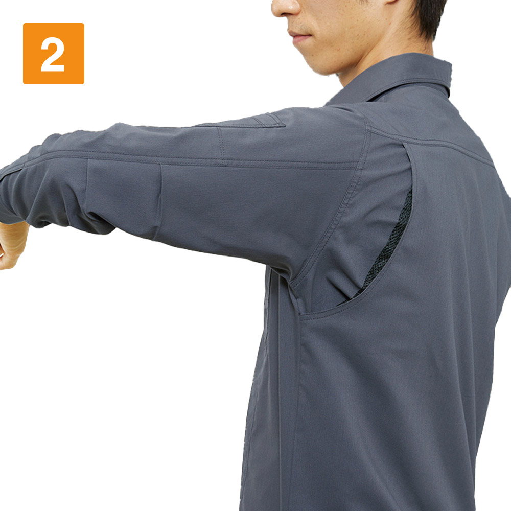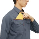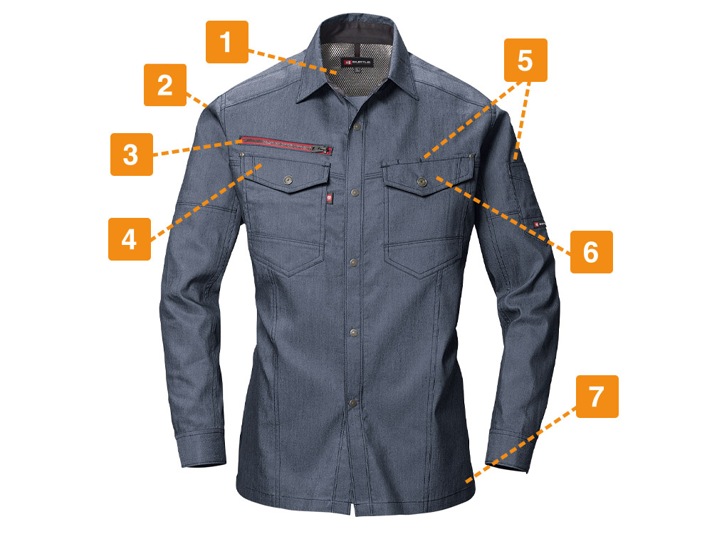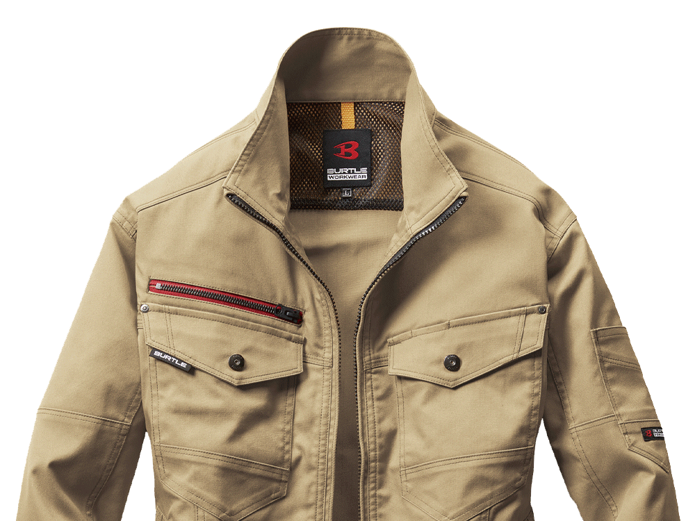 細身でスタイリッシュなデザインが特徴のジャケットです。作業着のダボっとした感じはなく清潔感があり、オシャレに着こなしたい方にオススメです。試着してみたところ、軽さ・動きやすさも申し分なく、長時間着ていても疲れにくいように感じました。深さのある胸ポケットの使い勝手が良く、スマートフォンをスムーズに出し入れできてとても便利です。丈夫な素材で、シワもできにくいため、長くご使用いただけます。 名入れを入れるなら左ソデにオリジナル刺繍がおすすめでございます。