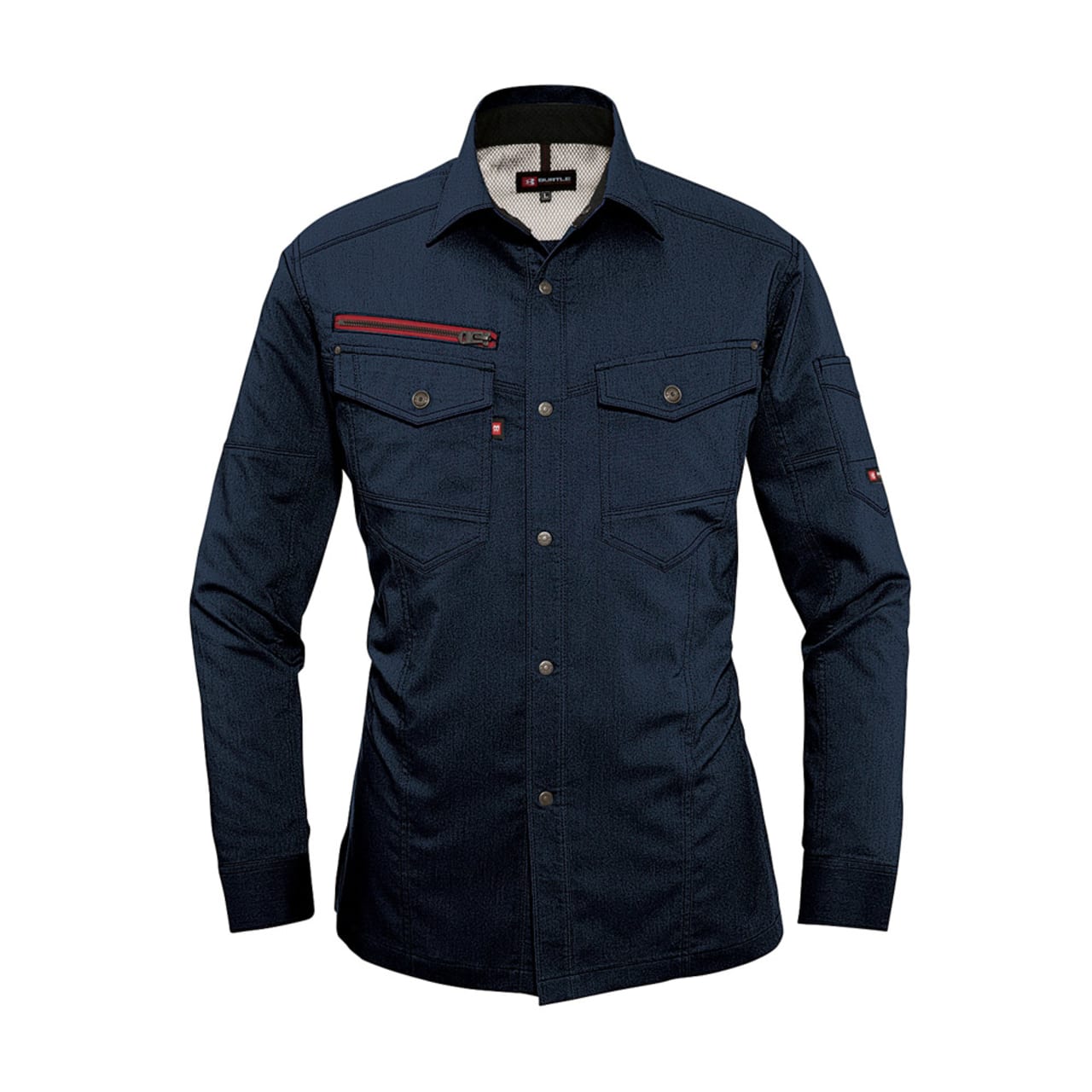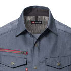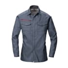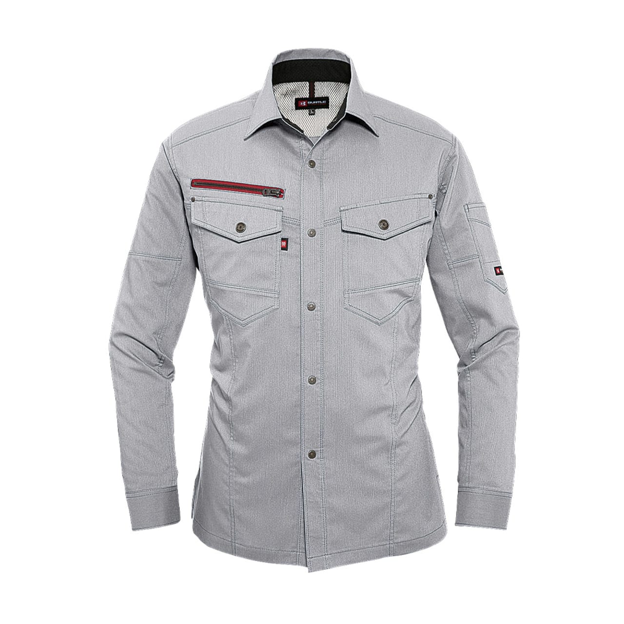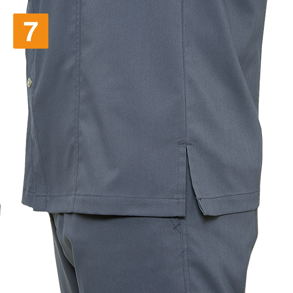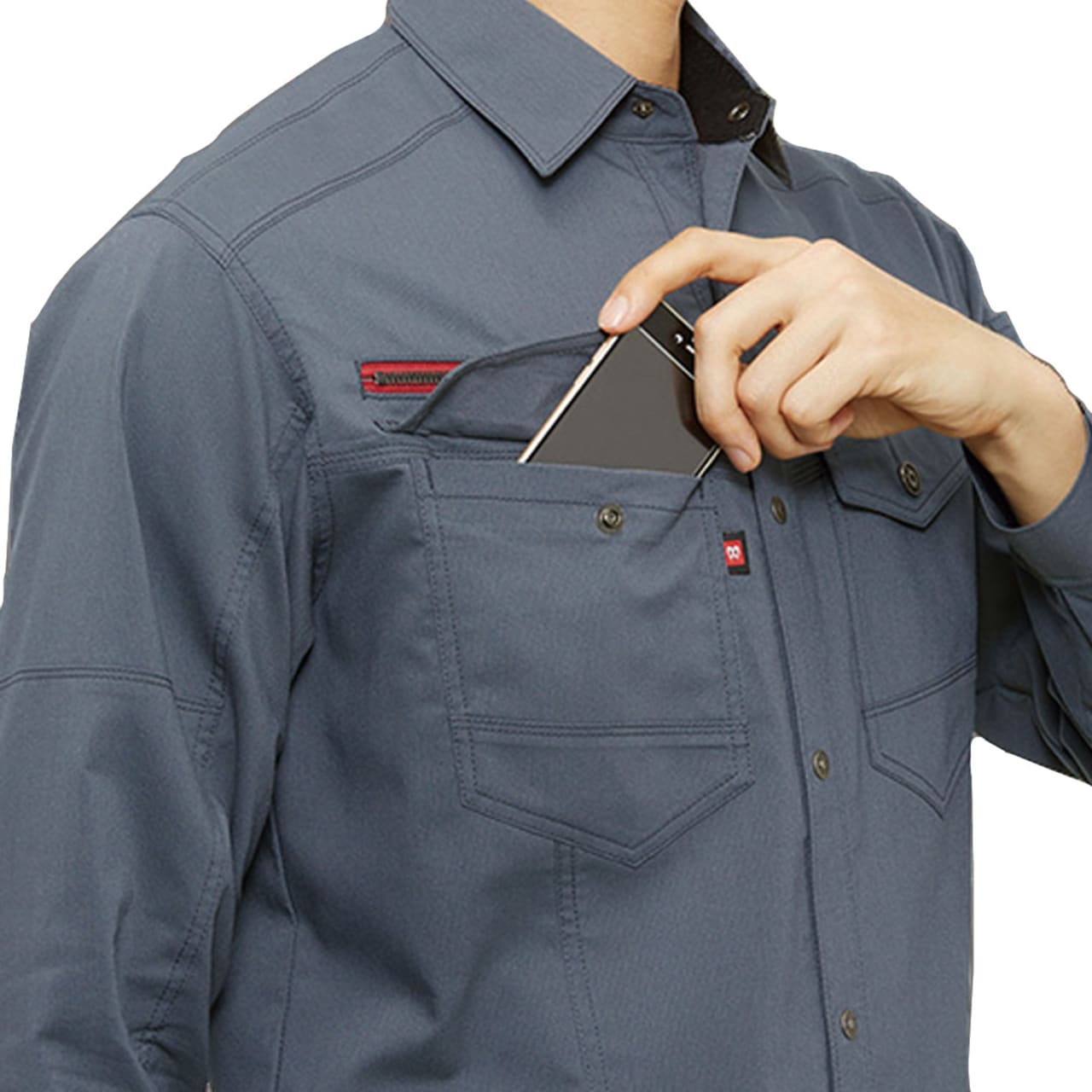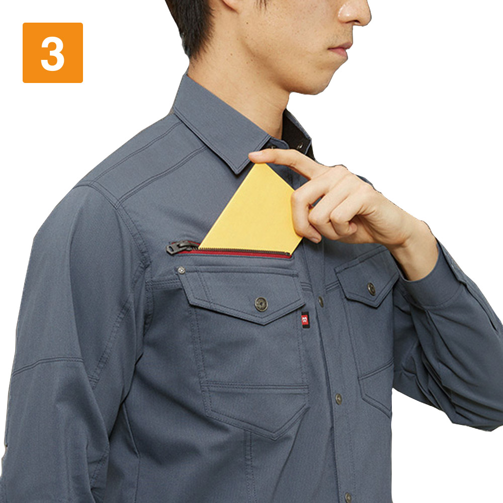 細身でスタイリッシュなデザインが特徴のジャケットです。作業着のダボっとした感じはなく清潔感があり、オシャレに着こなしたい方にオススメです。試着してみたところ、軽さ・動きやすさも申し分なく、長時間着ていても疲れにくいように感じました。深さのある胸ポケットの使い勝手が良く、スマートフォンをスムーズに出し入れできてとても便利です。丈夫な素材で、シワもできにくいため、長くご使用いただけます。 名入れを入れるなら左ソデにオリジナル刺繍がおすすめでございます。
