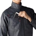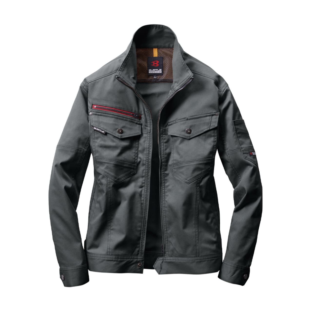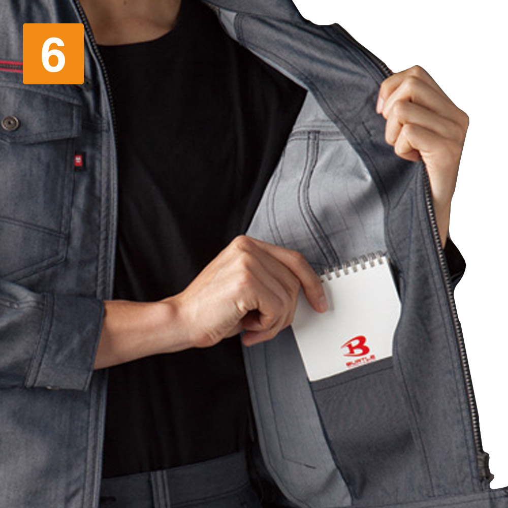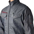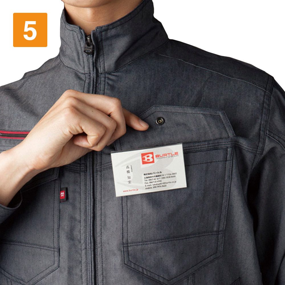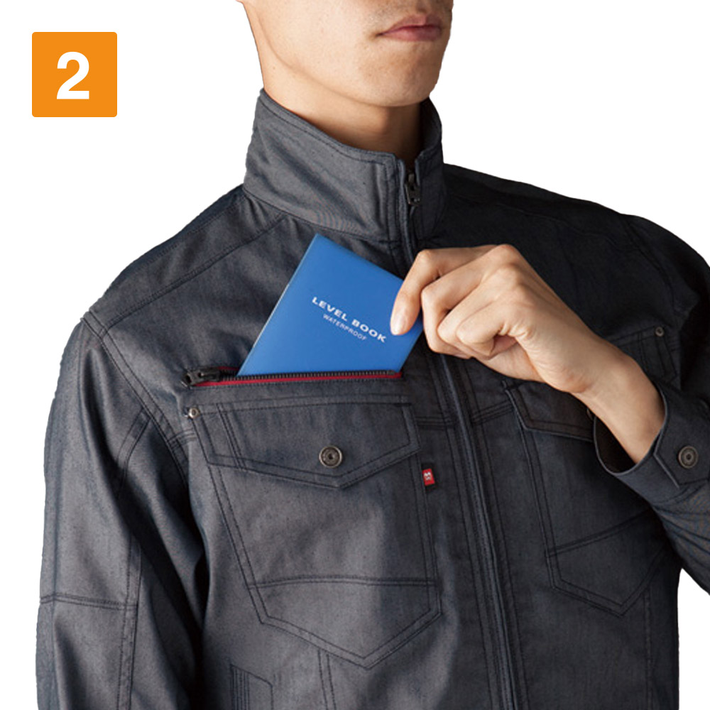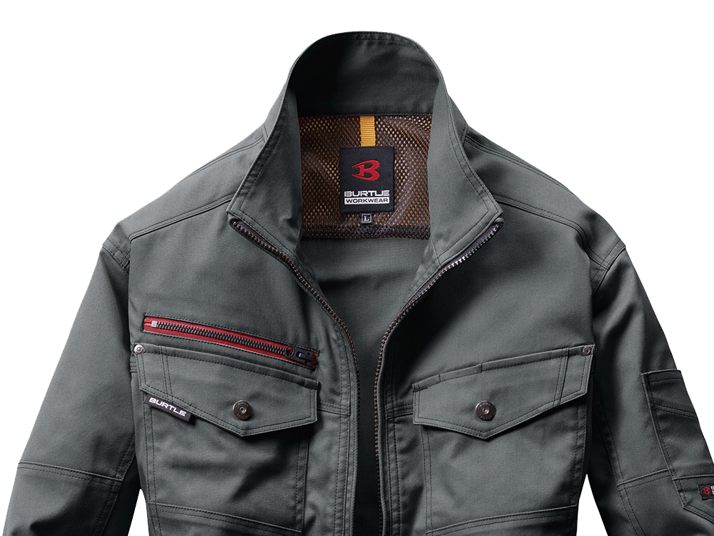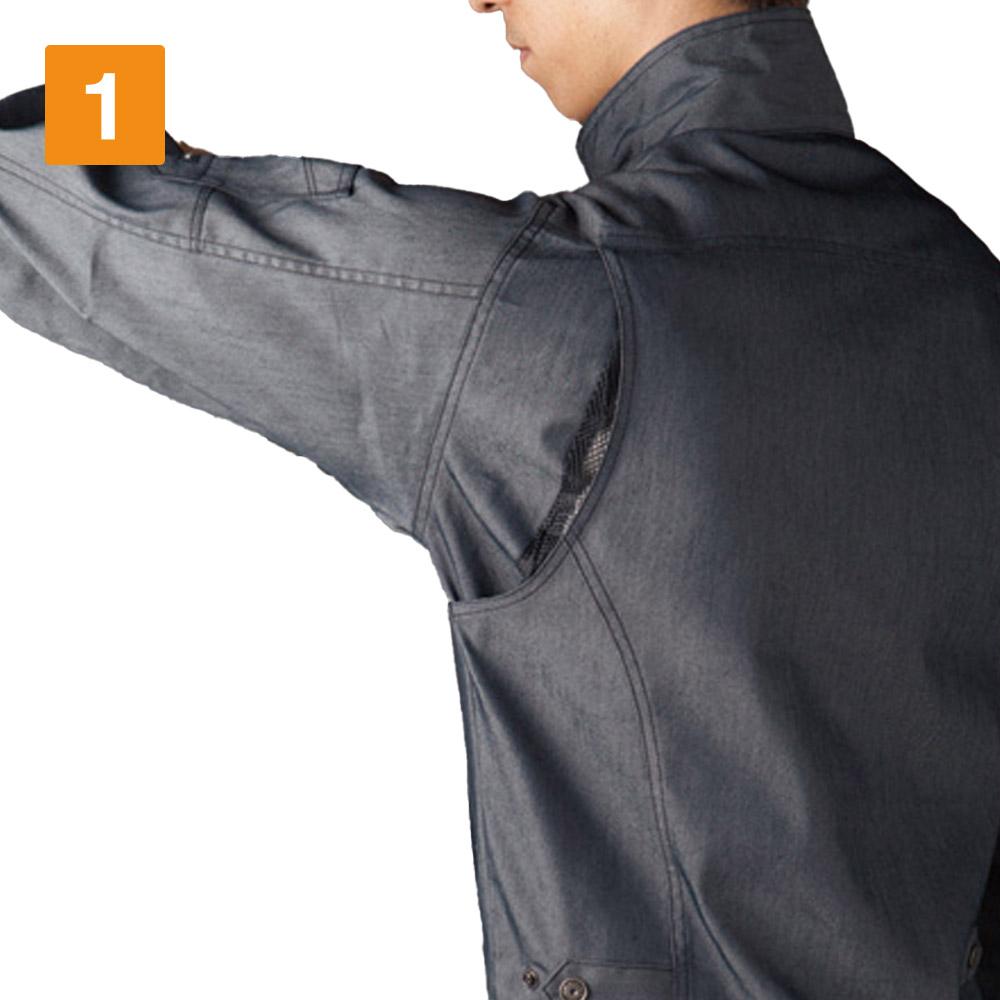 ジャケットの素材として使用されているストレッチ素材は、伸長率17%の高い伸縮性が魅力です。腕を伸ばしたり屈み込んだりといった、活動的なワークシーンでも、作業しやすくなっています。背中の両サイドには切れ込みを入れ、腕の上げ下ろしを自在にする「ノーフォーク」を採用。素材自体にも吸汗速乾性があり、さらにノーフォーク部分をメッシュにしているため、上半身に汗をかいても蒸れにくい構造に。通気性にも考慮したジャケットだから、忙しい現場での作業も、体に負担をかけにくいです。こちらのアイテムには、刺繍ワッペンを製作し取り付け、又は、オリジナル直接刺繍がおすすめです。