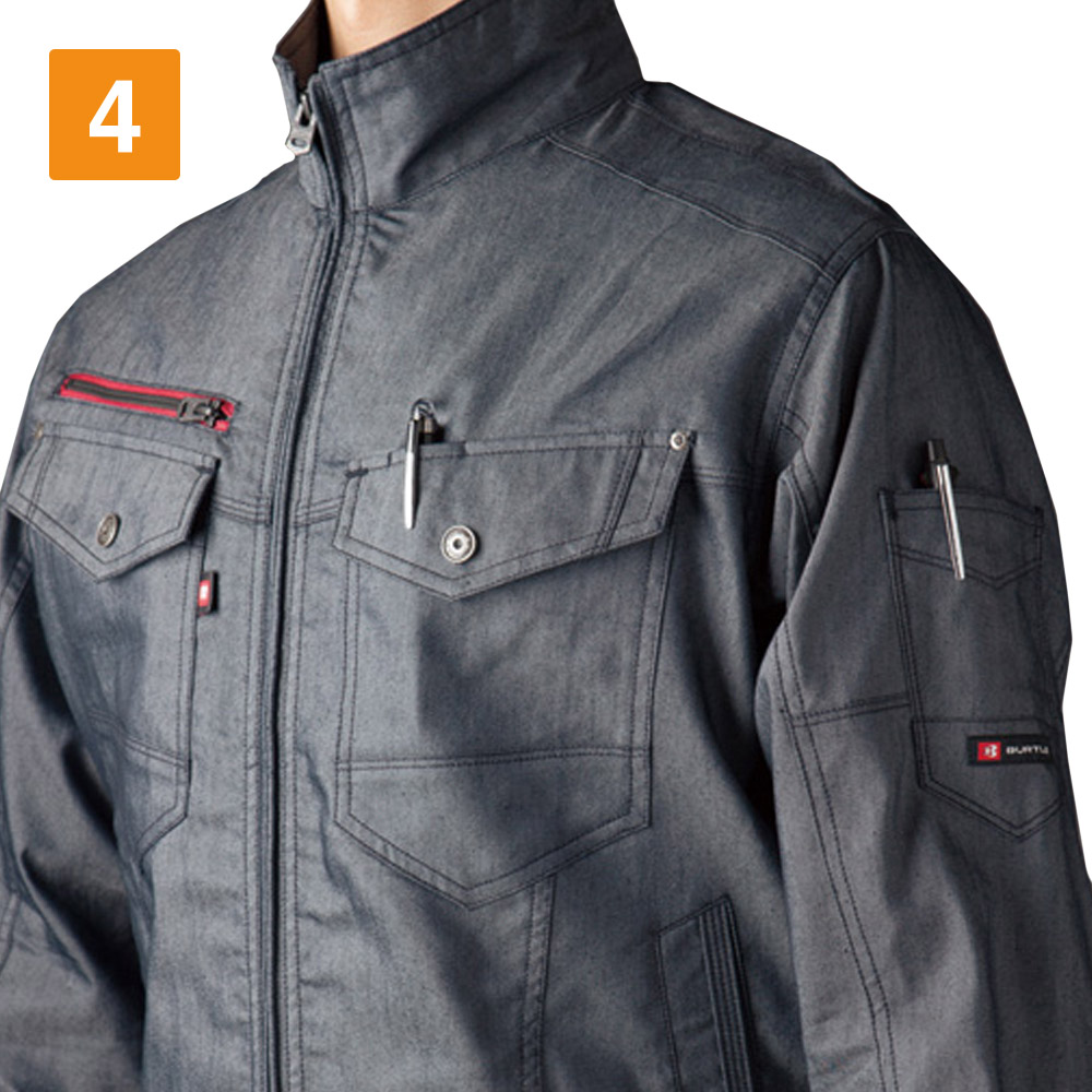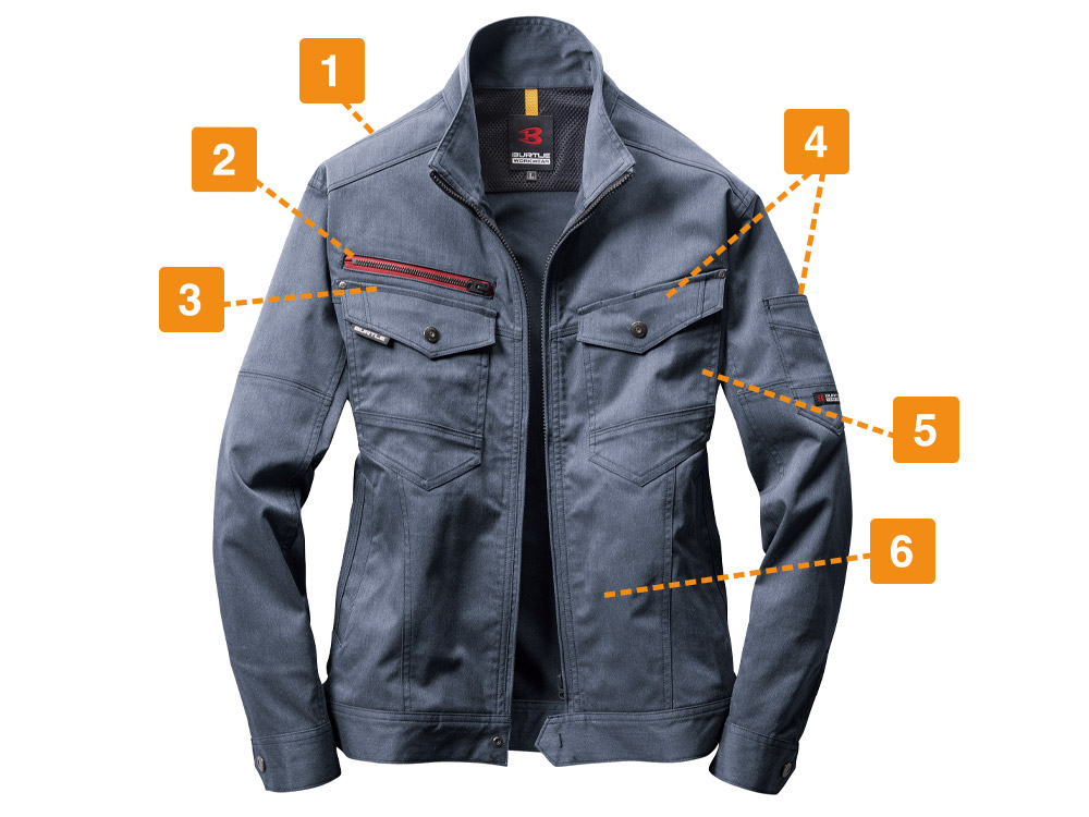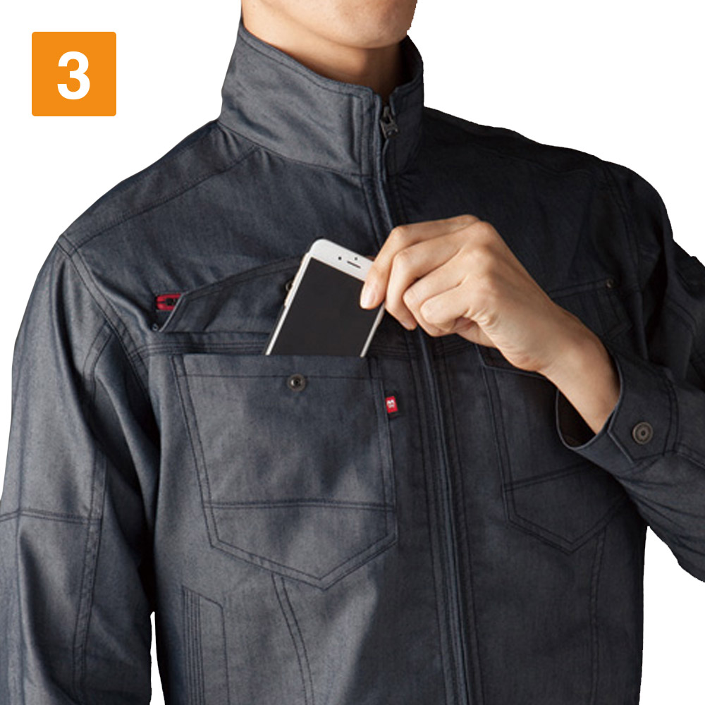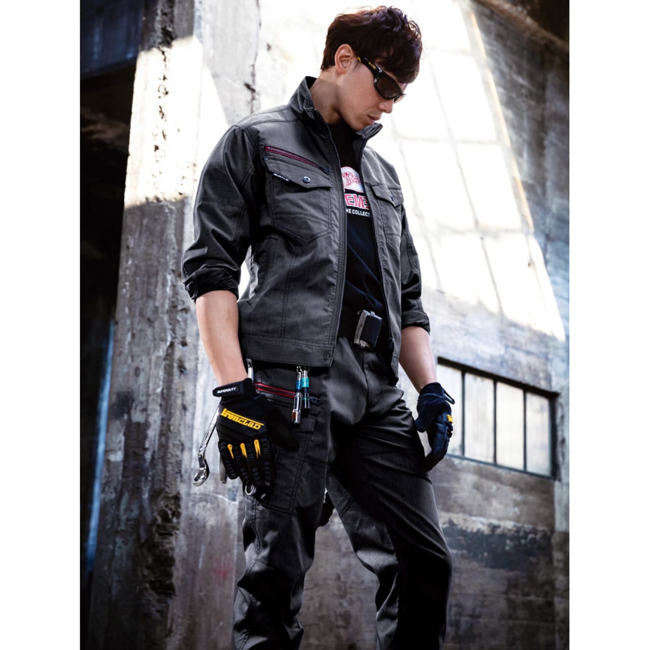 男女とも引き締まった細身のシルエットは、作業着ながらデザイン性にも工夫が施されています。襟元はフルジップ仕様で防寒対策にも。伸び縮みする素材や、通気性を考慮した構造など、細かな部分にもこだわった設計は、屋外でも屋内でも快適に着用できる工夫が施されています。こちらのジャケットは7042、7043シリーズのカーゴパンツとあわせて着用することが可能です。インディゴやカーキ、シルバーなど全5色のカラー展開。現場の雰囲気や特色に合わせて自由にお選びいただけます。