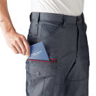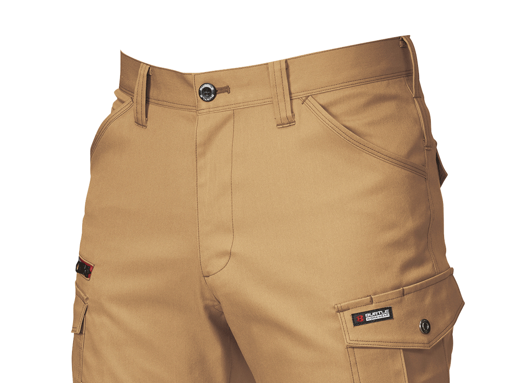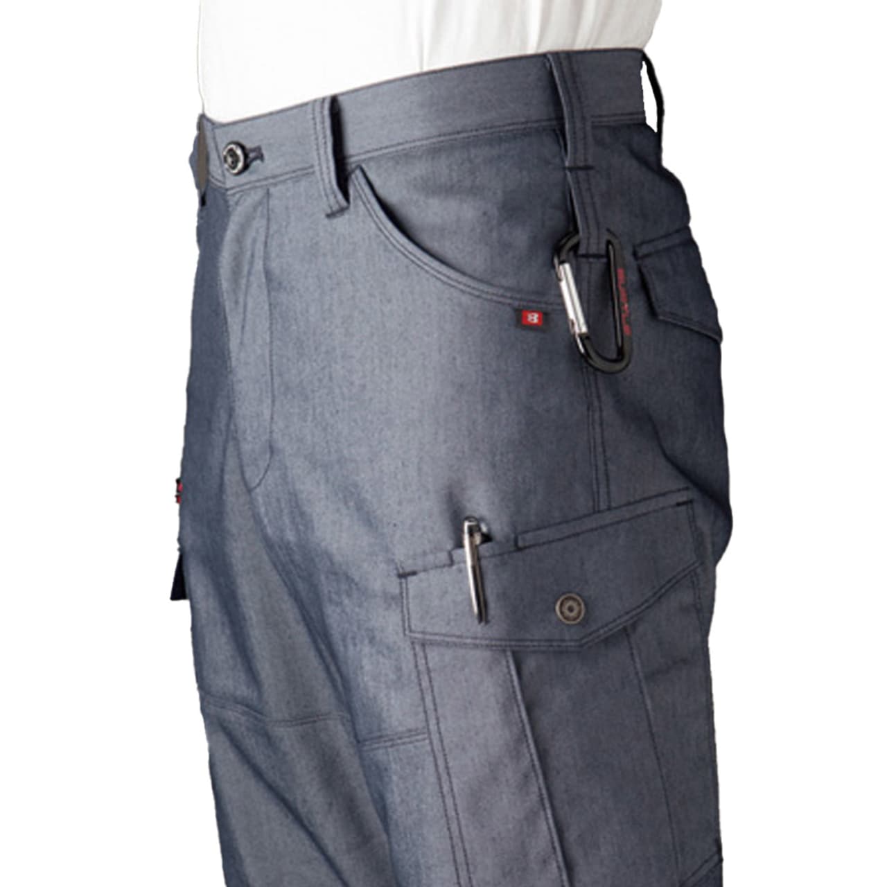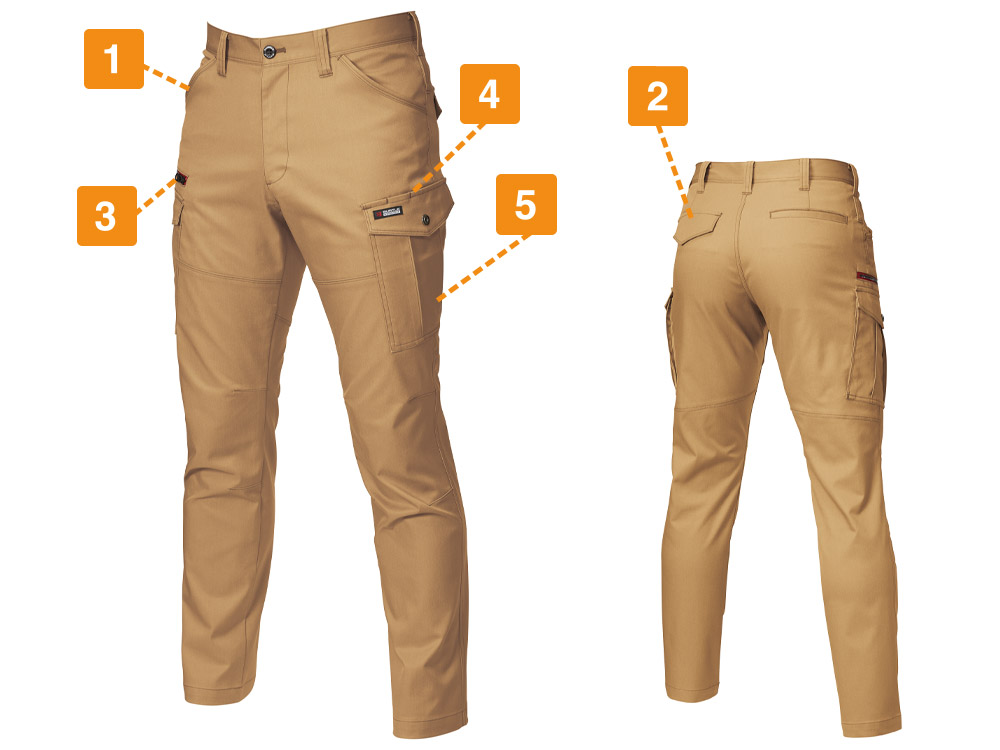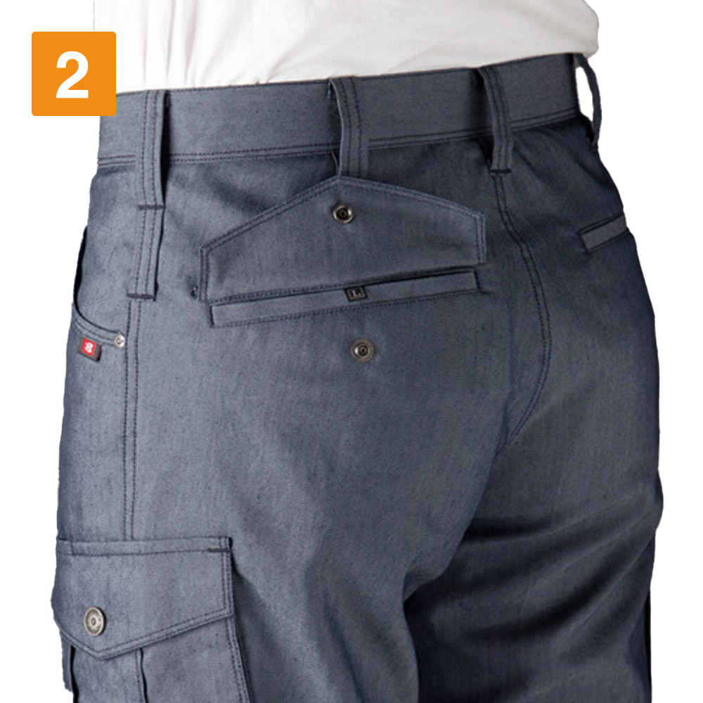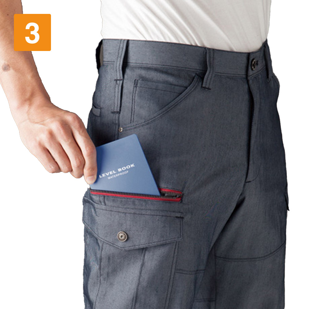 伸長率17%の伸び縮みする、ストレッチ素材を使用したカーゴパンツ。屈伸動作もスムーズに行えるため、屈んだり立ち上がったりする機会の多い、運搬業務のユニフォームにもおすすめです。ポケットも多数搭載しており、なかでも注目は深さ23cmのレベルブックが収納できる深めの右ポケット。長財布をしまうのにも重宝するので、休憩時間など、ちょっと買い物へ出かける際にも便利。ポケットを利用すれば、両手をあけて作業することも可能。かさばりがちな筆記用具を、サッと取り出してメモをとることができる、便利なペン差しもついています。