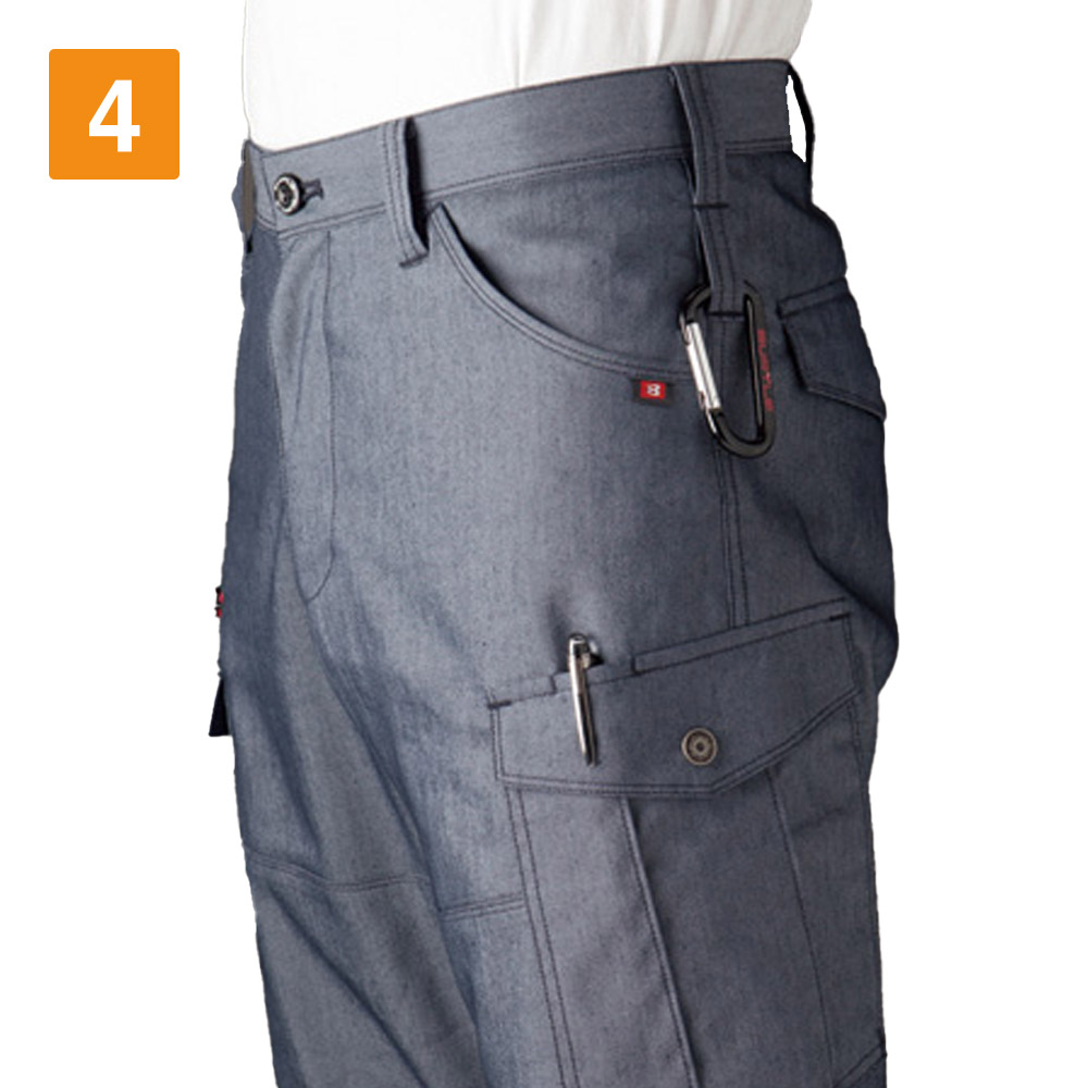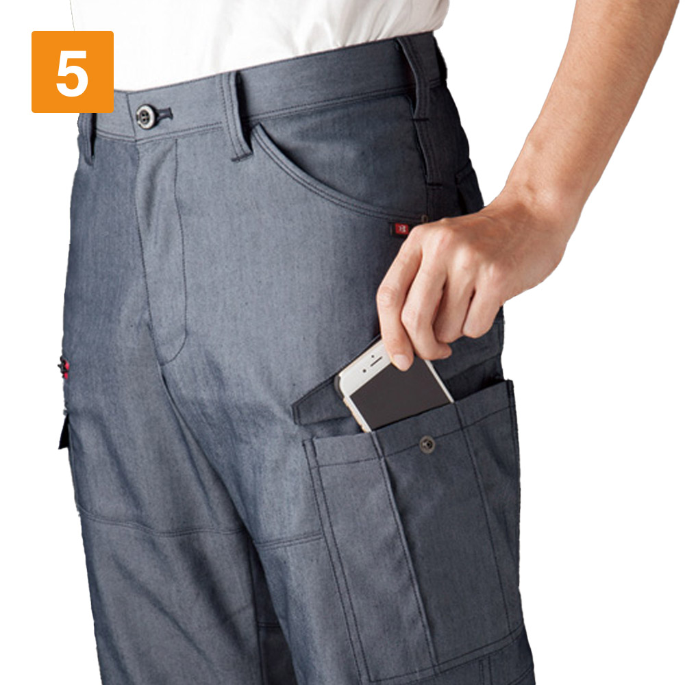 多数のポケットや両脇のループといった機能性と、動きやすさが魅力のカーゴパンツです。吸水速乾性があるので、作業中に汗をかいても比較的乾きやすいのが魅力。また静電ケア設計を施し、作業中の静電気の発生を防ぎます。よく伸び縮みするストレッチ素材を使用しているため、膝の屈伸や伸長もスムーズ。運搬や移動の多い職場でも、動きやすいのでストレスを感じにくいのも嬉しいポイントです。各所に搭載されたポケットを利用すれば、かさばる小道具を締まっておけるので便利です。