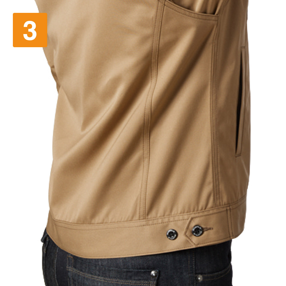着用時のスマートなシルエット、全体の垢抜けた雰囲気はもちろん、着心地と動きやすさを支える設計がスタッフ内でも好評でした。背中にはアームノーフォークが施されているので、上体の動きがとにかくスムーズ。前屈の際もつっぱり感がないので、ストレスを感じません。また、ノーフォークの一部にメッシュ素材を使用することで通気性をプラス。汗をかいても蒸れた空気を外に逃がしてくれます。またデザインアクセントとして、胸のレッドカラーのロゴテープや、ブラックカラーのファスナーが全体をぴりっと引き締め、単調な印象を回避しています。