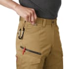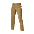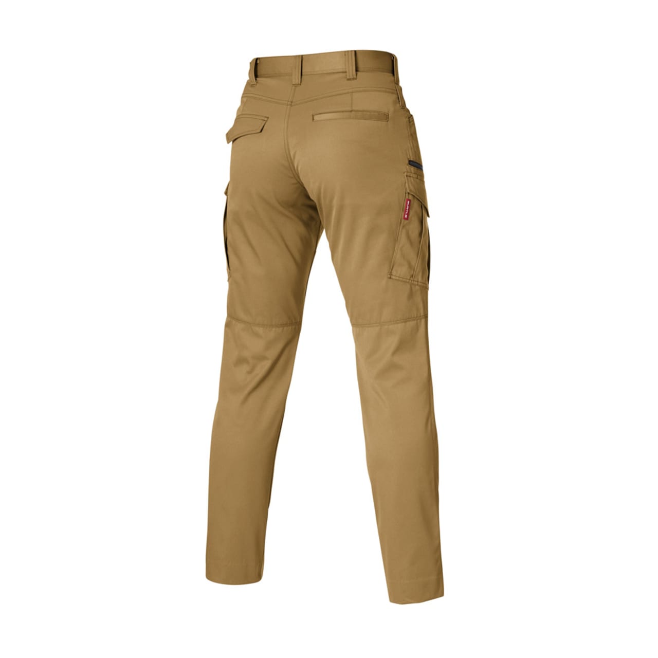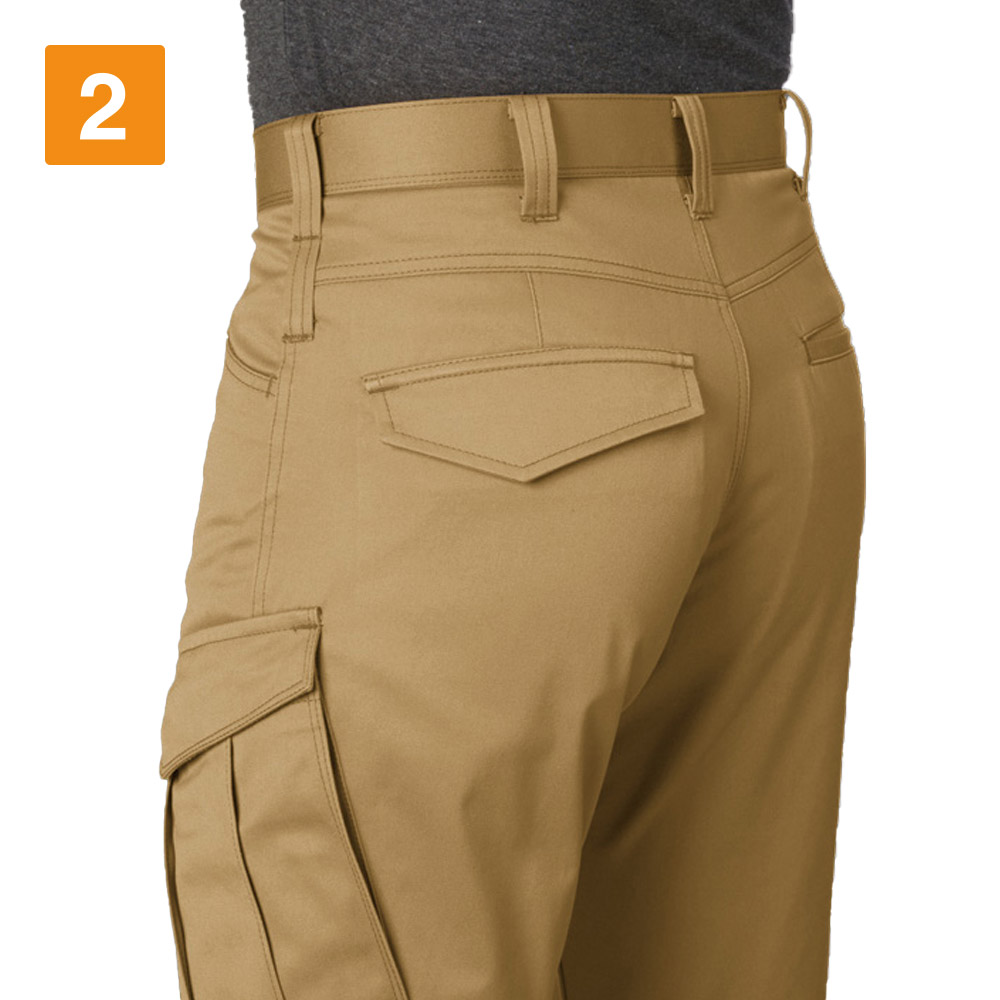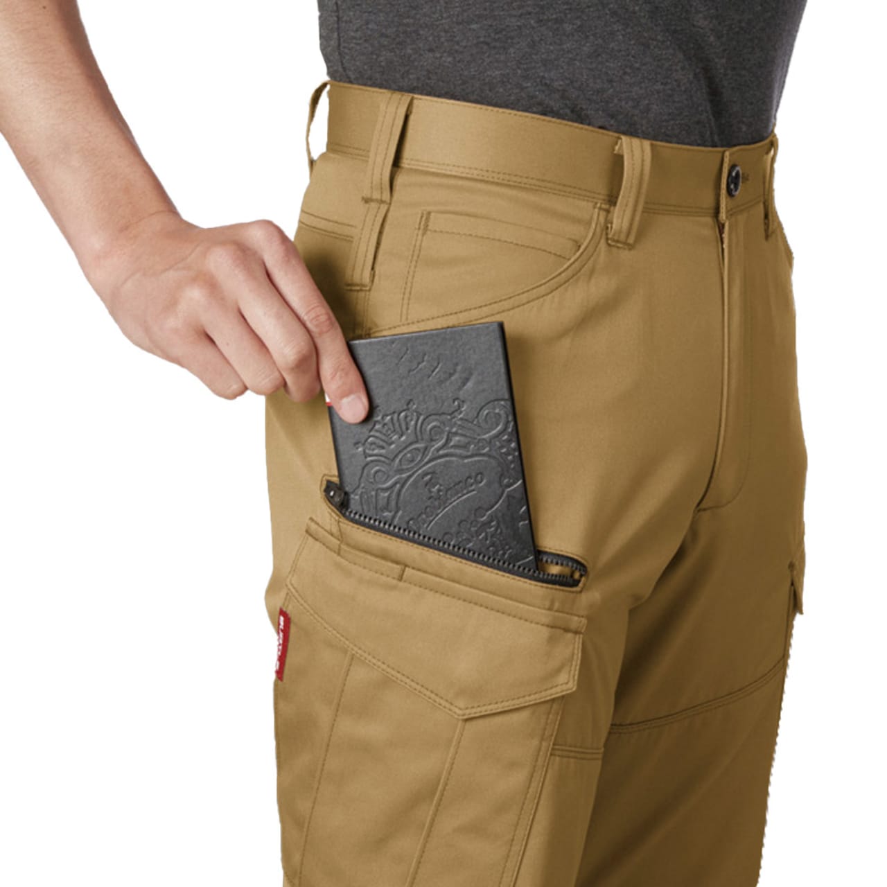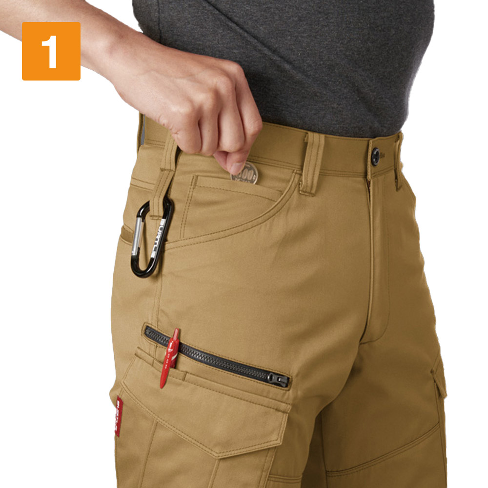 裾に向かって、ややテーパーのついたスマートなシルエットが、スタッフ内でも大好評でした。実際に着用してみると、ライトチノの軽やかな着心地がとても快適!夏場の作業でもストレスを感じにくい一着に仕上がっています。またそのデザインディテールがかっこいいのもポイント。特徴的なカーゴポケットのフラップ形状やレッドカラーのロゴテープなど、ひとひねり加えたおしゃれなアクセントが、全体をさらにスタイリッシュにしてくれます。