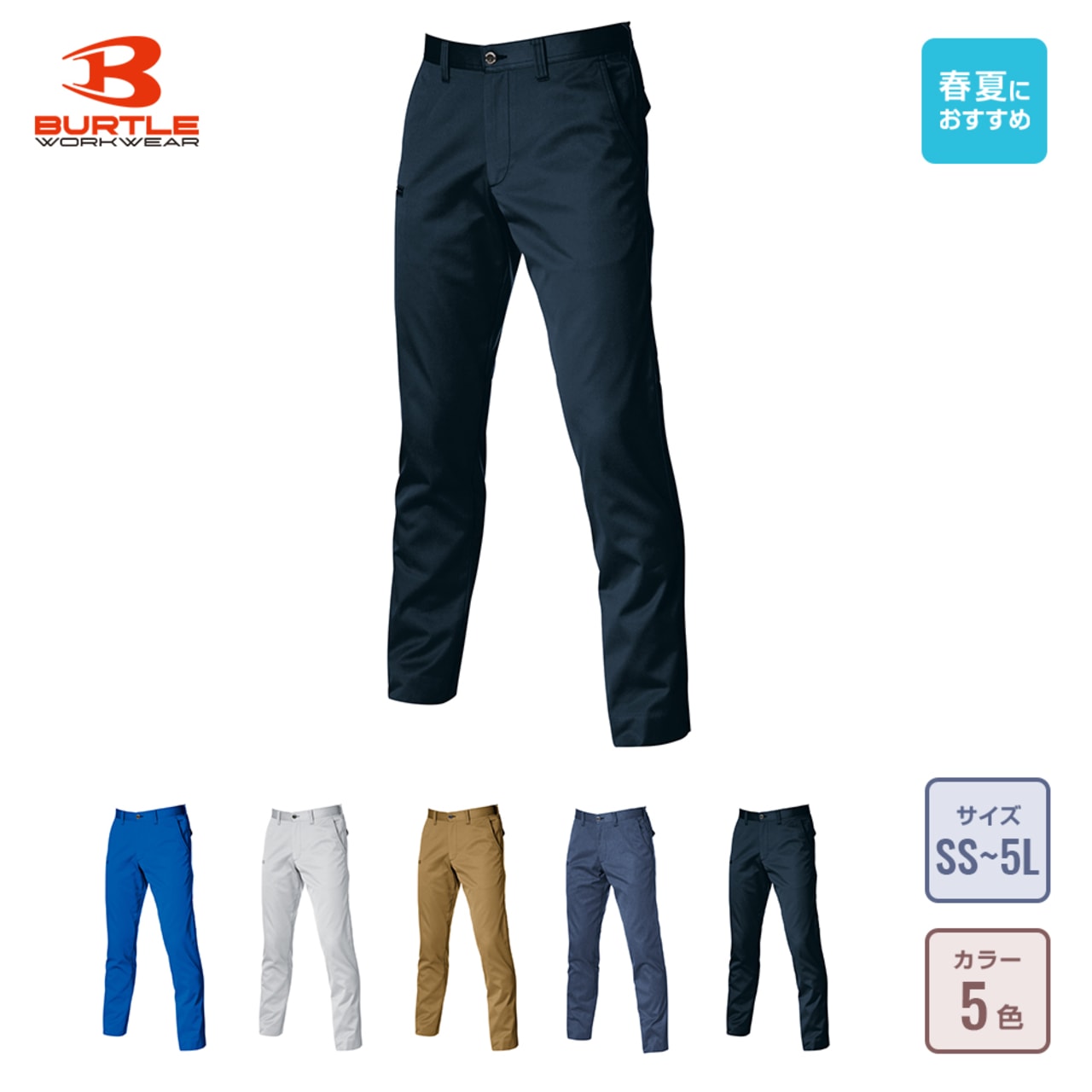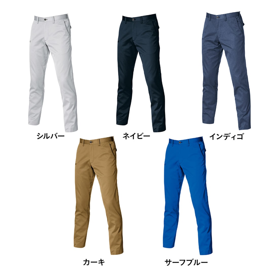 裾に向かってテーパーがとられた、都会的なシルエットが人気のパンツです。爽やかな薄手の生地を使用し、暑い季節も一日中快適に過ごせる一本。ベーシックで余計な装飾を省いたデザインなので、デスクワークから現場作業までシーンを選ばず履いていただけます。カラーはユニフォームとして導入しやすいモノトーンとアースカラーに、あざやかなサーフブルーを加えたラインナップ。どなたが着てもかっこよくきまるので、企業ウェアとしても人気を博しています。