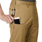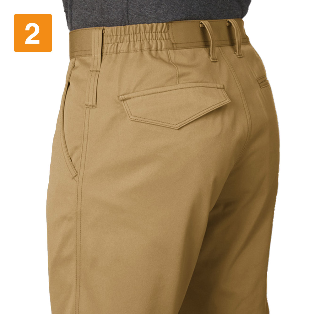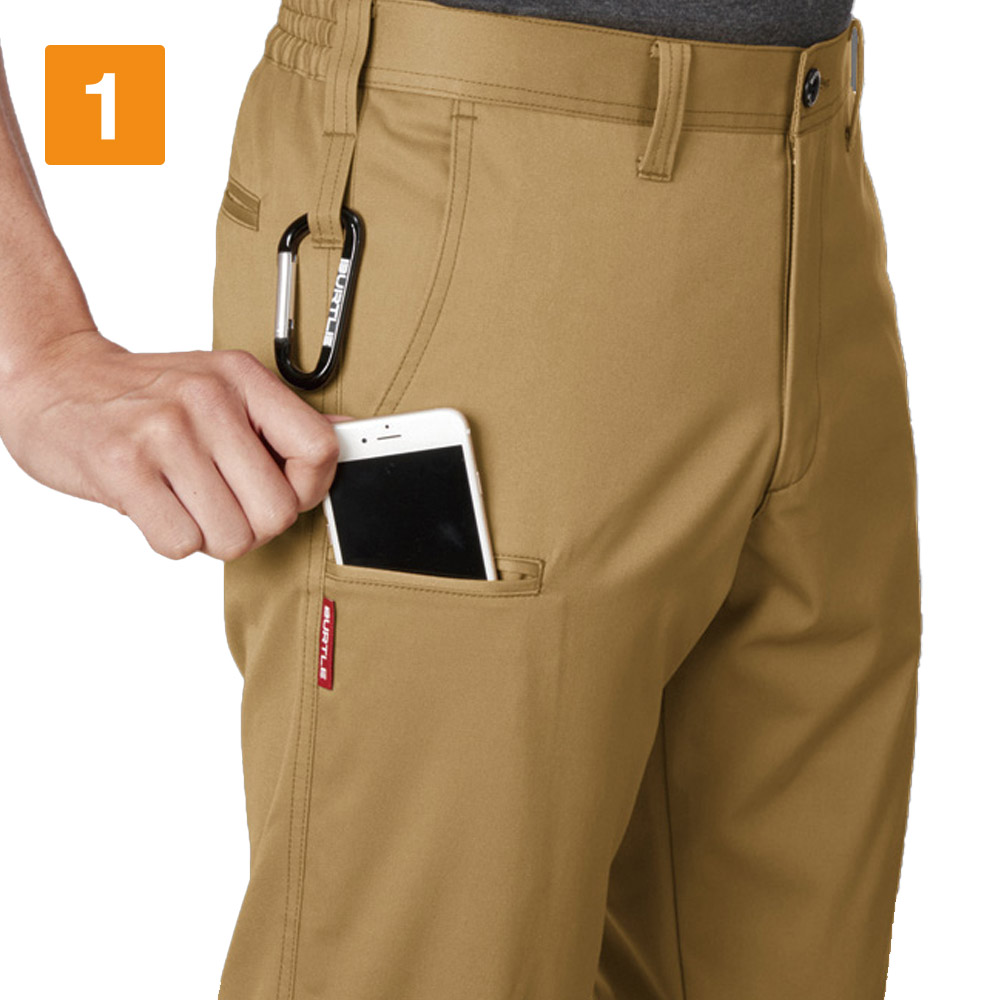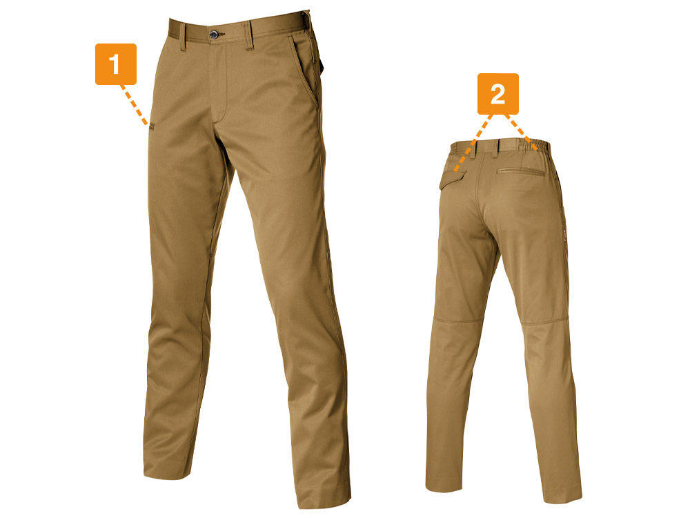 使用されている日本製T/Cライトチノ生地は、丈夫さやなめらかな肌触りにプラス、製品制電 JIS T 8118に適合した高機能生地。静電気の発生が禁忌とされる、特殊な現場でも着用していただけます。また、シンプルながら収納力にも優れており、背面のビスポケットと両脇のポケットに加え、右ももにはスマートフォンを収納できるポケットをさりげなく配置。全体のデザインを邪魔することなく、すっきりと収納できるデザインです。さらに両脇にはキーホルダーやコインケース、カラビナなどを吊り下げておくのにぴったりなツインループも。シンプルながら機能性満載のパンツです。