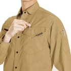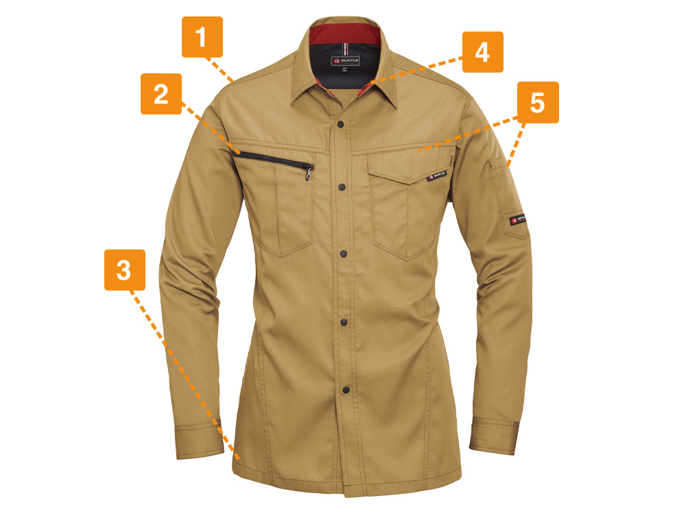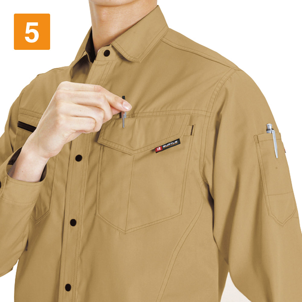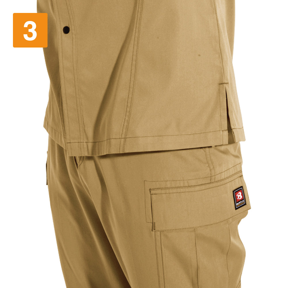 スタッフ内でも根強い人気を持つ一着。着るだけでかっこよく見せてくれるウェアです。また実際に羽織ってみると、その動きやすさや考え抜かれた着心地に驚かされます。脇にスリットが入ることで、つっぱりがちな裾まわりに適度なゆとりをもたらすデザイン。背中にはアームノーフォークが施され、上体の柔軟な動きを可能にするとともに、一部にメッシュを使用することで通気性も抜群。さらに腕にもアームタックがとられ、曲げ伸ばしなどの動きをスムーズにしてくれます。見た目で気分があがり、着心地で作業性があがる、万能シャツに仕上がっています。