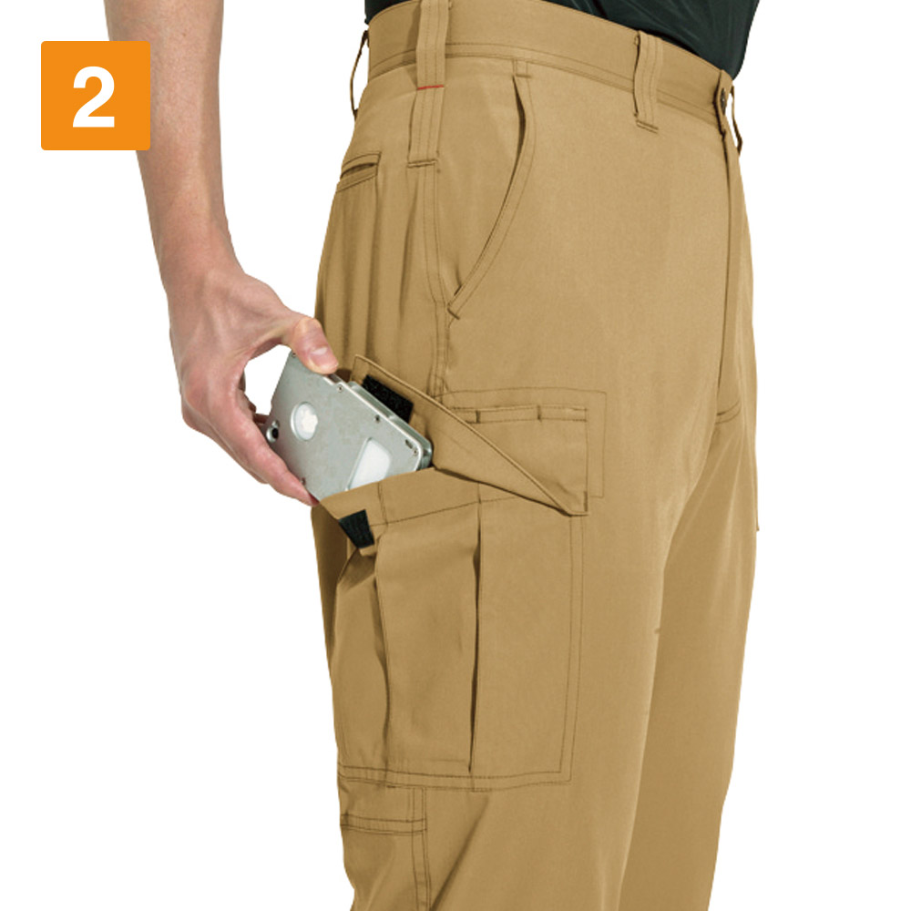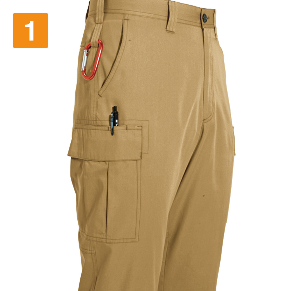 カジュアルさとかっちり感を兼ね備えたワークパンツです。ポイントは裾に向かって少しだけテーパーがついたスマートなライン。実際に着用してみると、ほどよいフィット感でシルエットを美しく見せてくれることがよく分かります。また、カクッとした形状のフラップや真っ直ぐなプリーツのラインなど、要所要所に直線を取り入れたデザインがスタイリッシュ。ロゴのタグやオリジナルのボタンも、全体をあか抜けた印象にしてくれて、シンプルさの中にもこだわりの光る一着に仕上がっています。