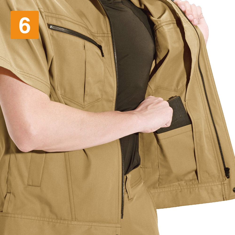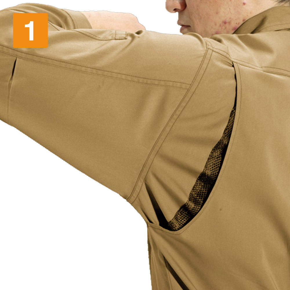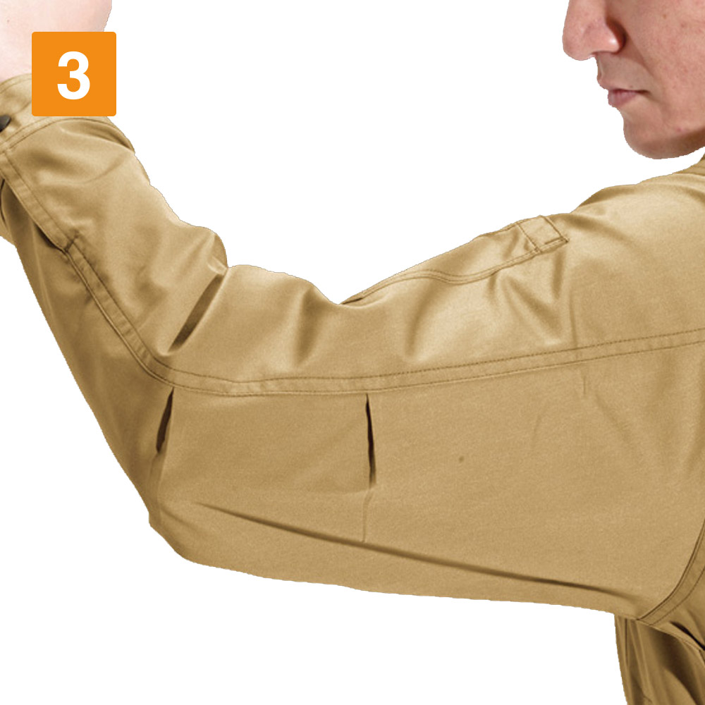 カッコよくスマートなシルエットながら、抜群の動きやすさを誇るのがこのジャケットの特長です。実際に羽織ってみると、その機動性に驚き!背中にとられたアームノーフォークが前屈や腕の上げ下げといった動きを、とことんスムーズにしてくれます。さらに一部にメッシュを使用し、通気性も抜群。夏場の蒸れを外に逃がして服の中はいつも快適です。また袖にはアームタックがとられているので、腕の曲げ伸ばしもラクラク。上体に関する動きの制限を感じない快適な一着。ぜひ一度ご体感ください。