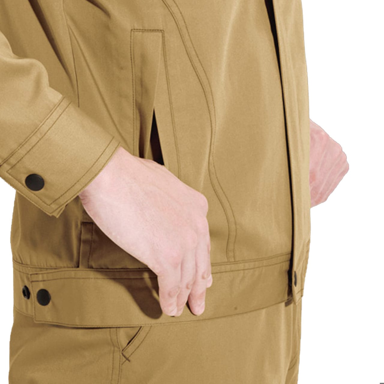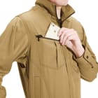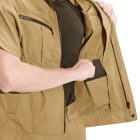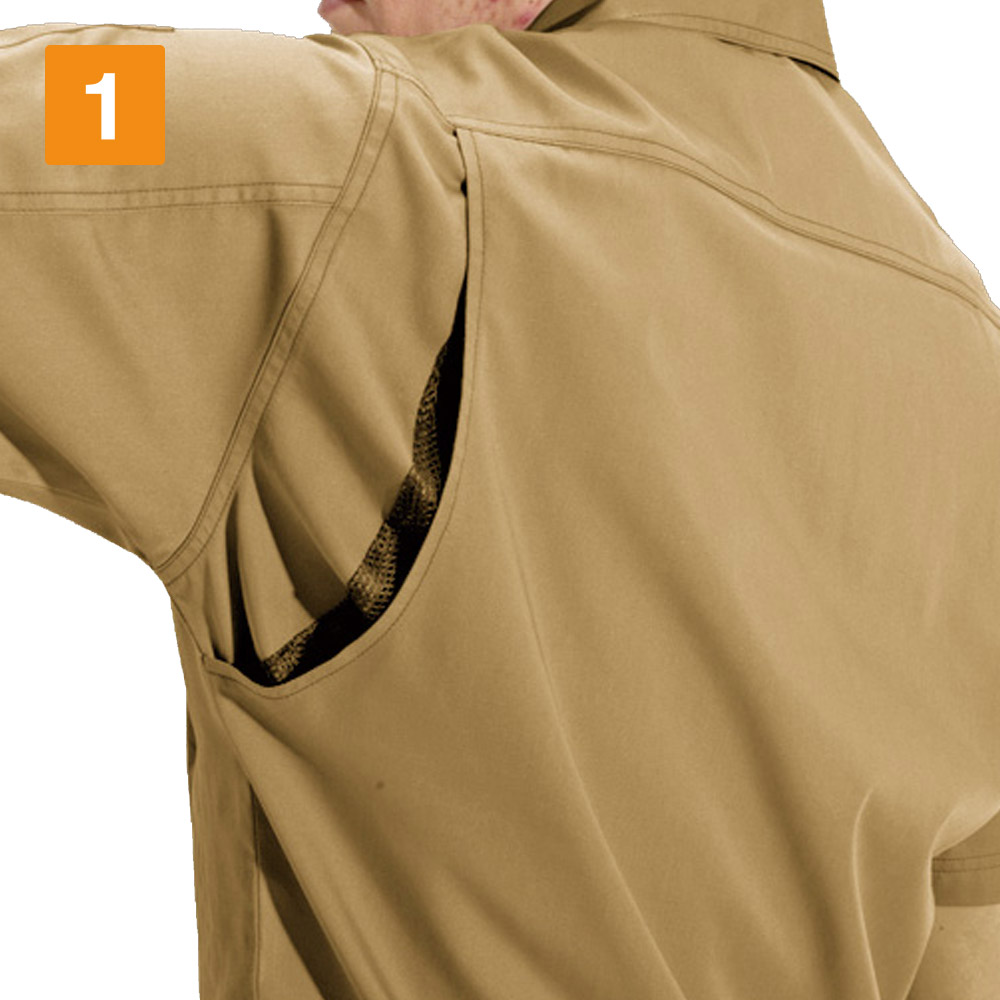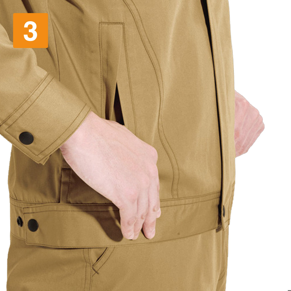 半袖とコンパクトなシルエットがカッコよくまとまったジャケットです。今日は実際に着用して、そのシルエットからは想像のつかない抜群の動きやすさを体感してみました。背中に施されたアームノーフォークで、上半身の動きはとてもスムーズ。肩まわりの可動域に制限がないので、前屈や腕の上げ下げといった動きにストレスを感じません。またスタッフ内で好評だったのは、そのオシャレなディテール。ポケットフラップの形状やそれに沿ったロゴ、裾のワンポイントボタンなど、全体を引き締めるアクセントがワンランク上の一着にしてくれています。