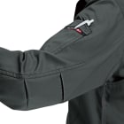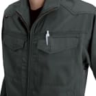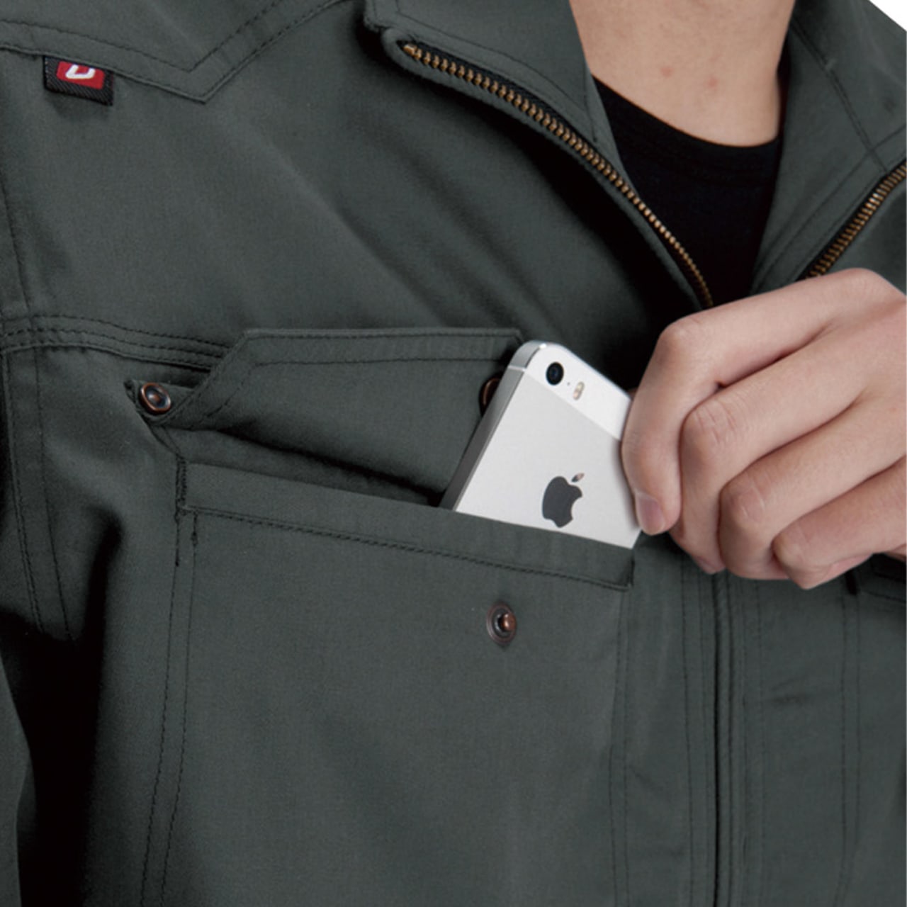 実際に着用してみて、生地に使用されている日本製T/Cソフトツイルの心地よい肌触りに驚きました。綿を含みなめらかさを備えた生地で、さらにナチュラルソフト加工が施されているので、他にはない優しい肌触りが体感できます。一日中着ていてもストレスを感じにくいので、長時間作業される方にもおすすめです。またスタッフの中でも好評だったのが、そのデザインアクセント。本体生地と同色のフロントボタンが悪目立ちせず、逆にロゴテープやステッチを引き立てているなど、緻密な計算を感じるかっこいいデザインが光ります。着ているだけでモチベーションの上がる一着です。