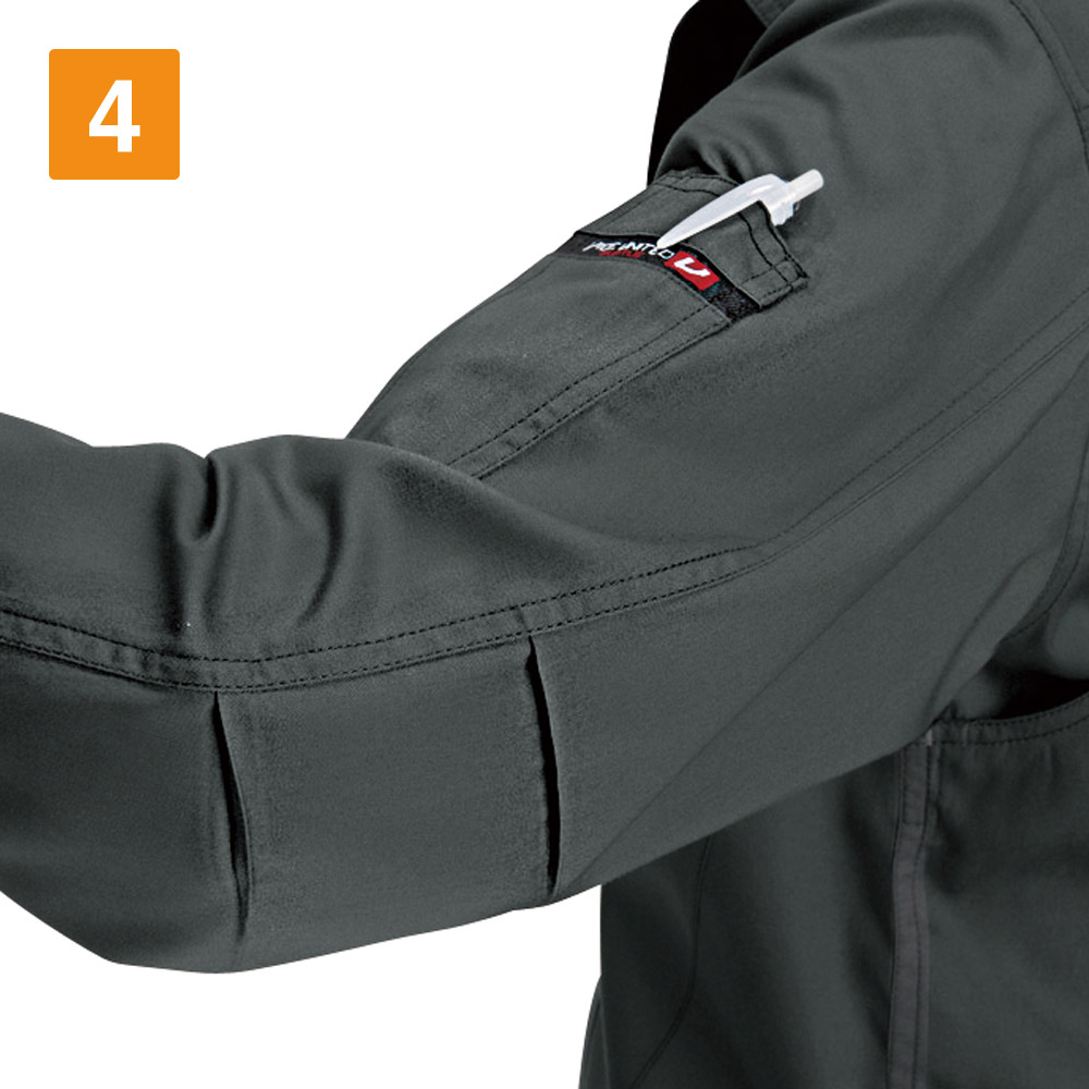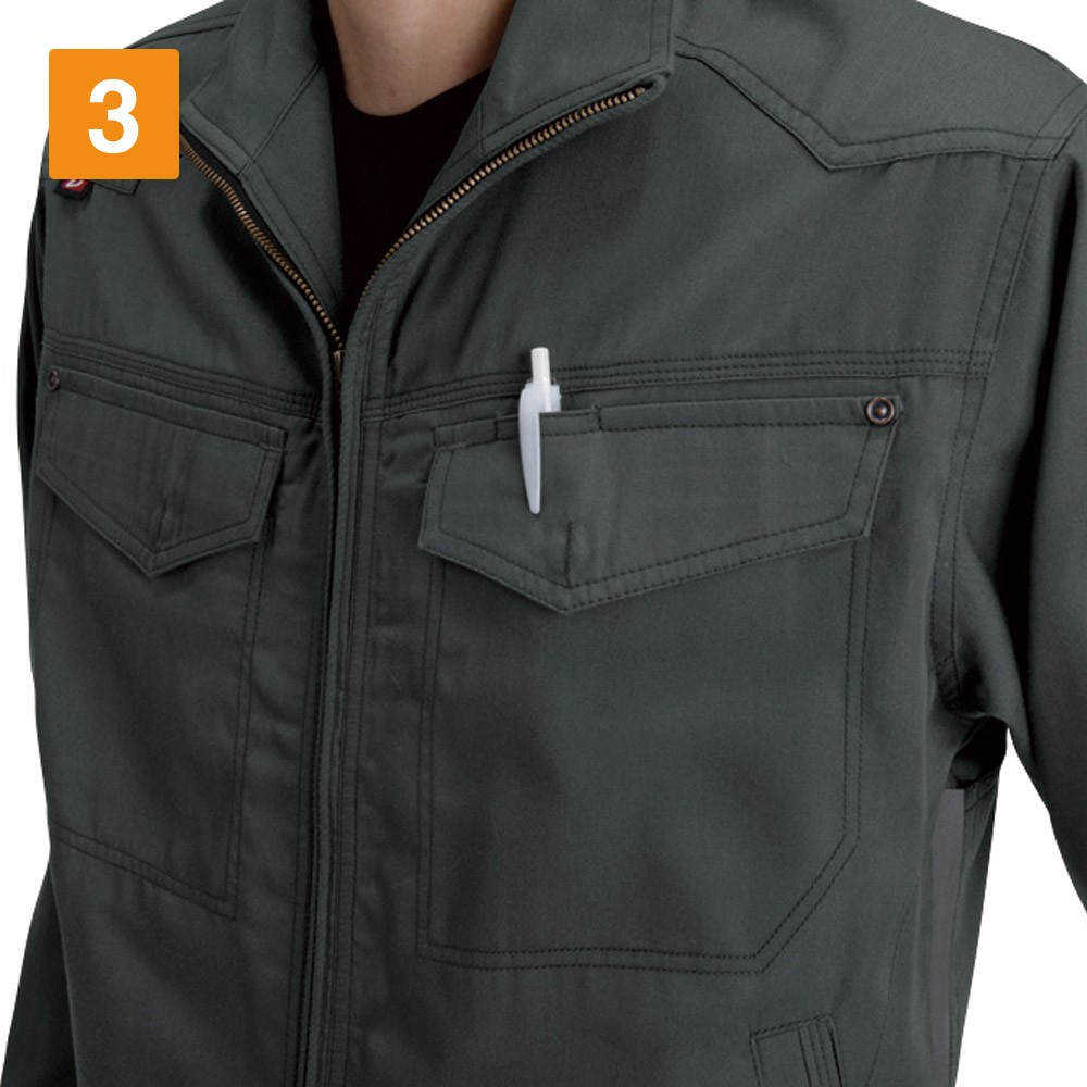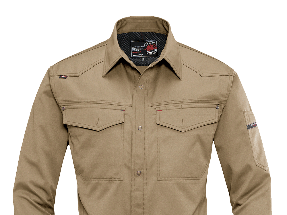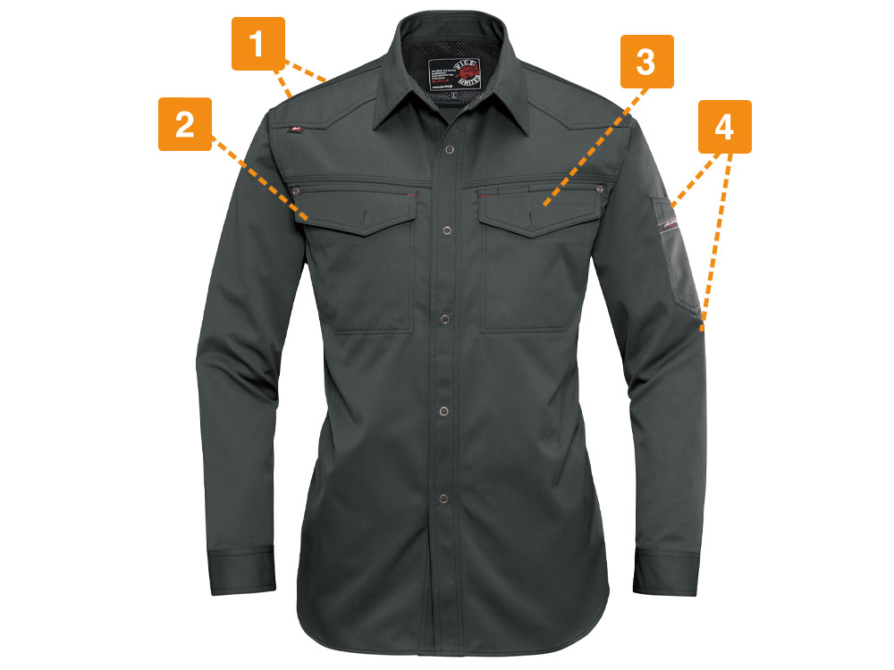 シーンを問わず、着る方をかっこよく演出してくれる一着。都会的なタイトめのシルエットが、作業姿を粋に見せてくれます。特長は動きやすさを格段に向上させる背中のアームノーフォークと袖のアームタック。腕の上げ下げや前屈、腕の曲げ伸ばしといった大きな動作も、全くストレスを感じさせない加工が施されています。かっこよさはもちろんのこと、シャツのもつ堅牢性と機動性が、安全かつ快適な作業をしっかりとアシストしてくれます。