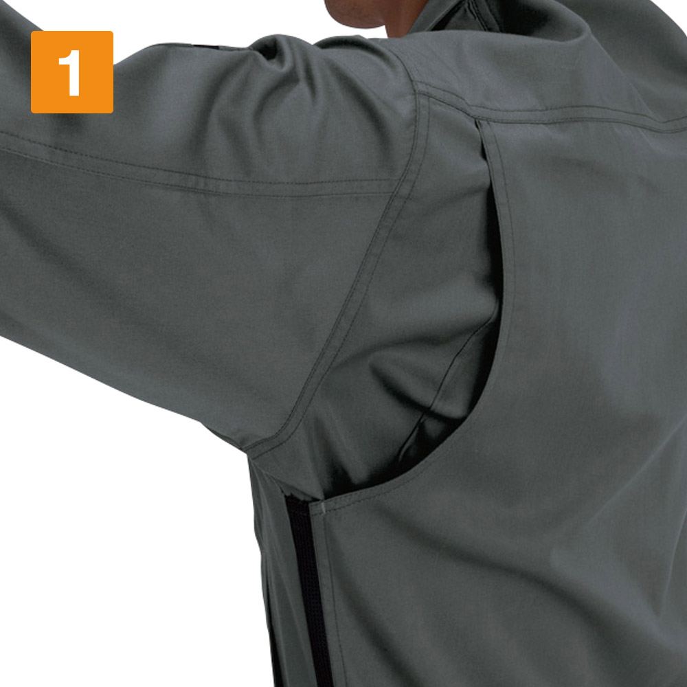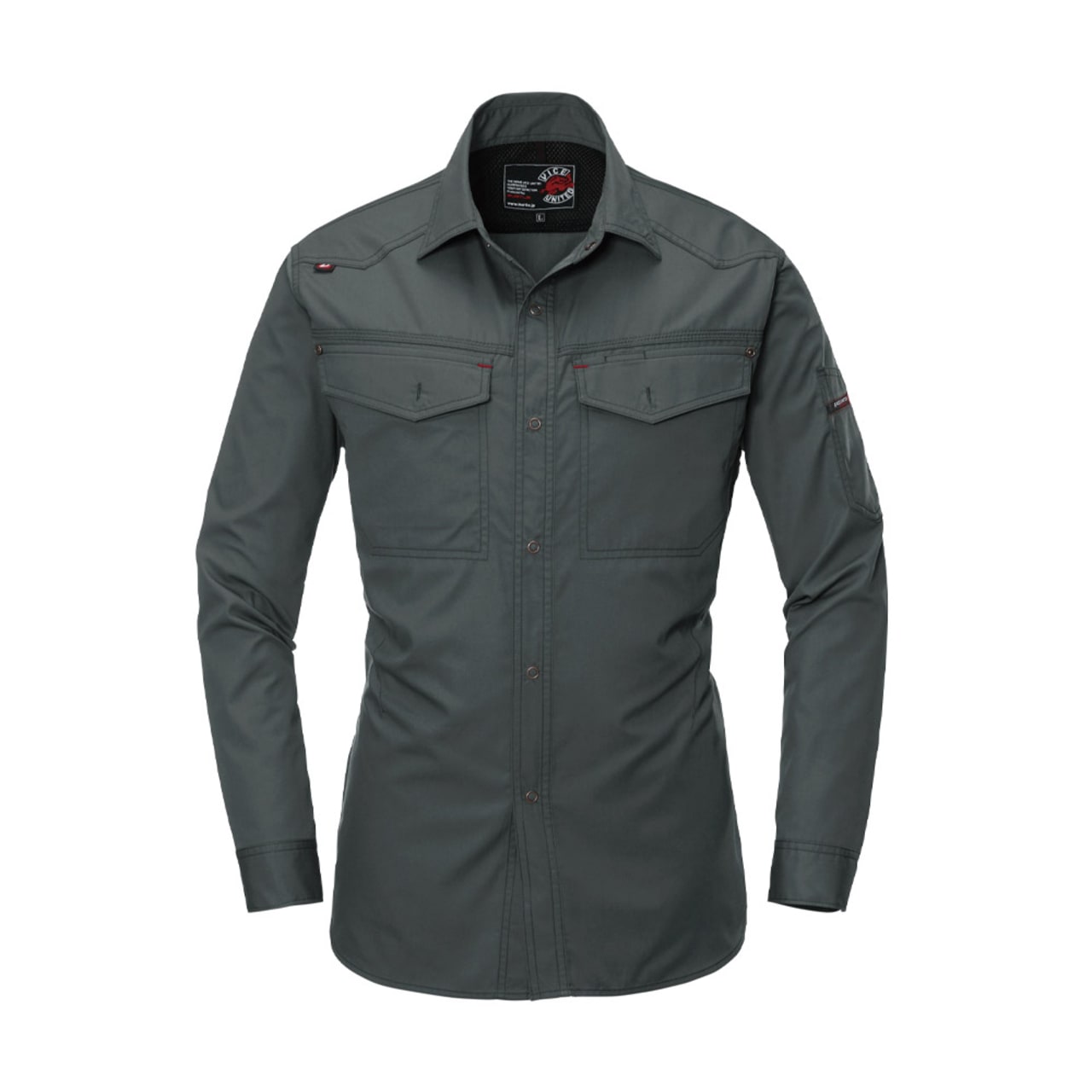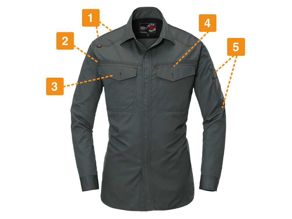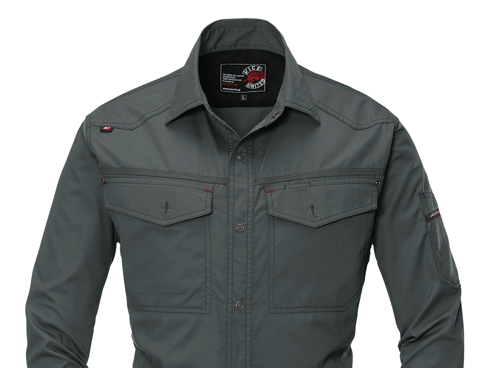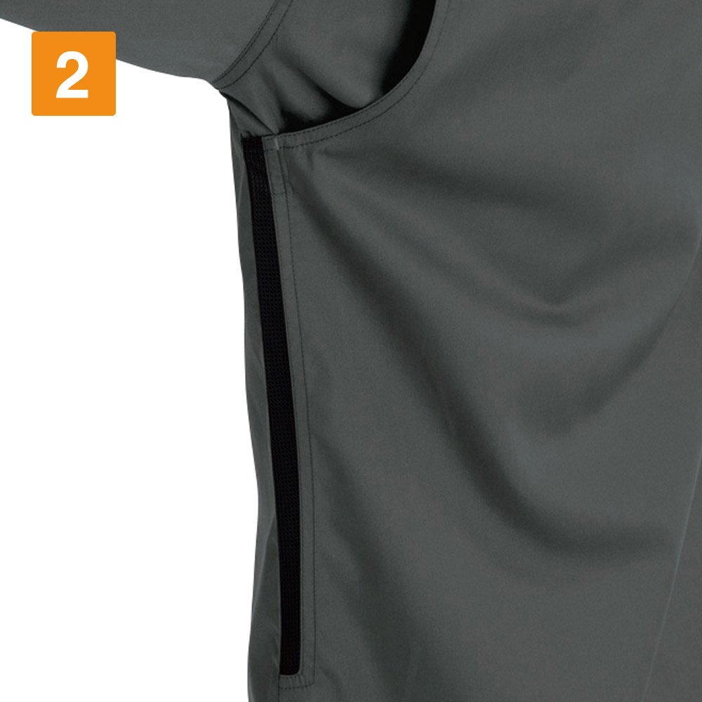 毎日着用するものこそ、かっこいい上質なものを選びたいですよね。このシャツはそんな要求にきっちり応えるクールな一着です。ボタンまでも同色で統一された、世界観すら感じるデザインに、さりげないロゴタグや別カラーのステッチがアクセントをプラス。こだわり抜かれたかっこよさをまとうことで、作業のテンションもアップ間違いなしです。また胴体の両サイドには、メッシュ素材をライン状に配置。通気性を高め服内部を快適に保ちつつ、ぐっと引き締めるアクセントとしても機能しています。