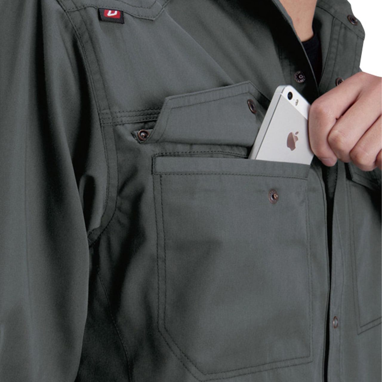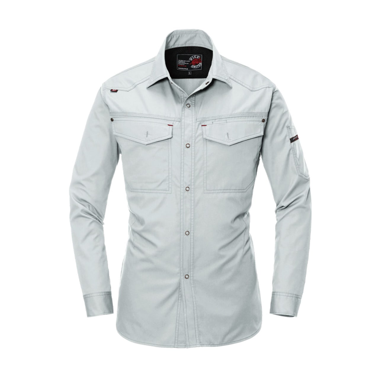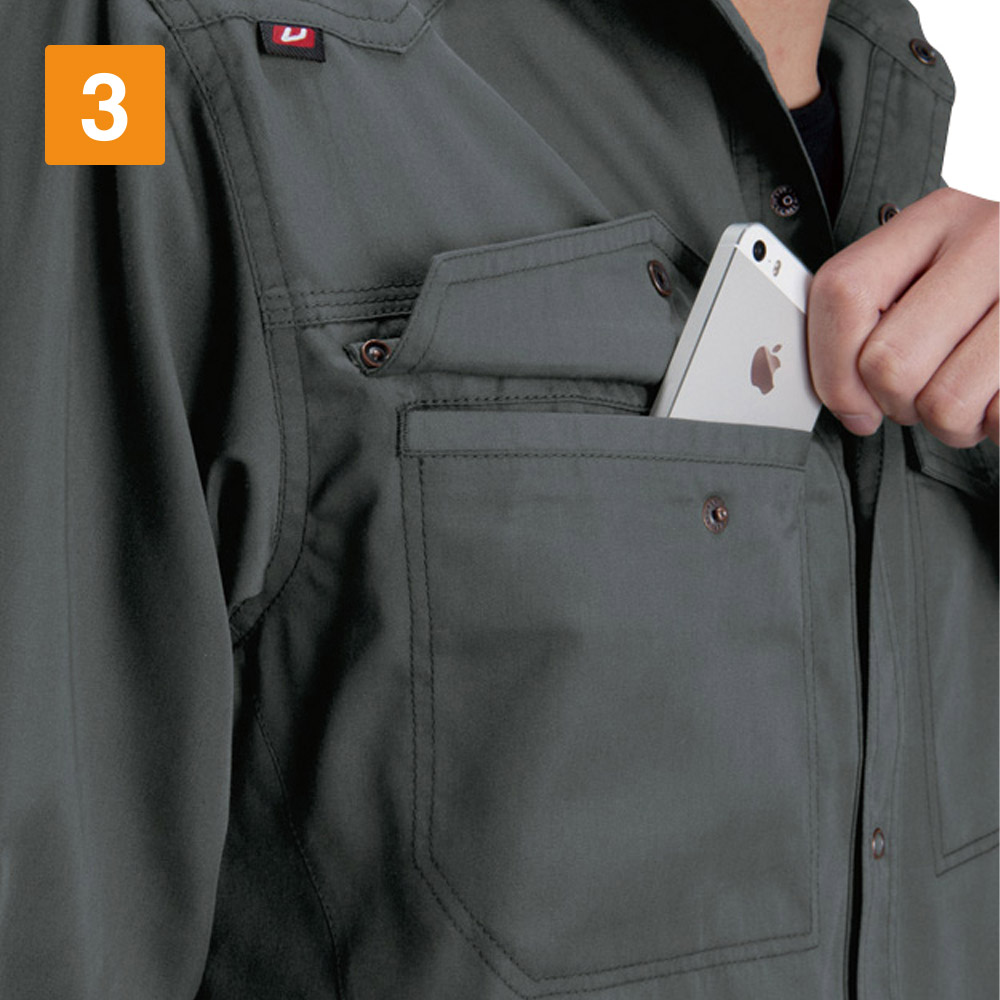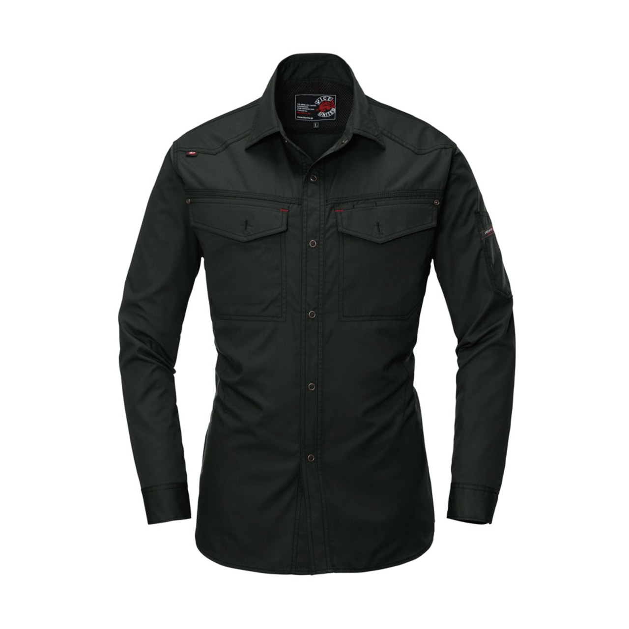 毎日着用するものこそ、かっこいい上質なものを選びたいですよね。このシャツはそんな要求にきっちり応えるクールな一着です。ボタンまでも同色で統一された、世界観すら感じるデザインに、さりげないロゴタグや別カラーのステッチがアクセントをプラス。こだわり抜かれたかっこよさをまとうことで、作業のテンションもアップ間違いなしです。また胴体の両サイドには、メッシュ素材をライン状に配置。通気性を高め服内部を快適に保ちつつ、ぐっと引き締めるアクセントとしても機能しています。