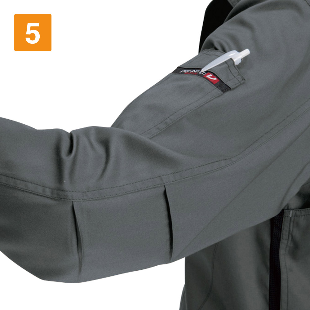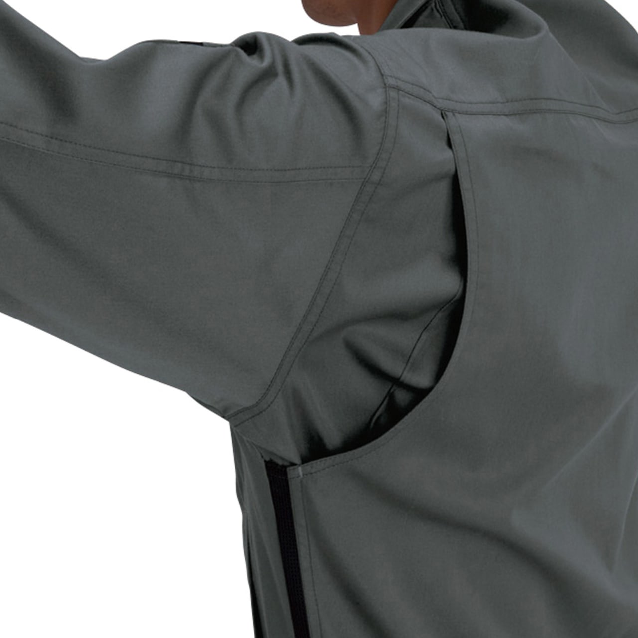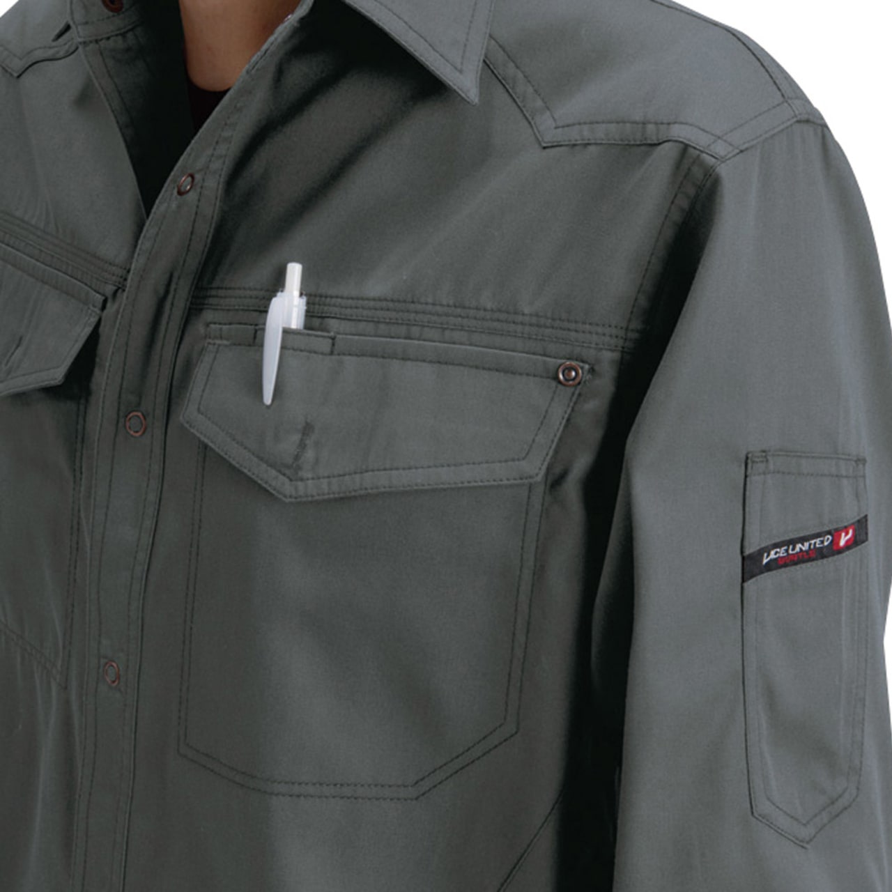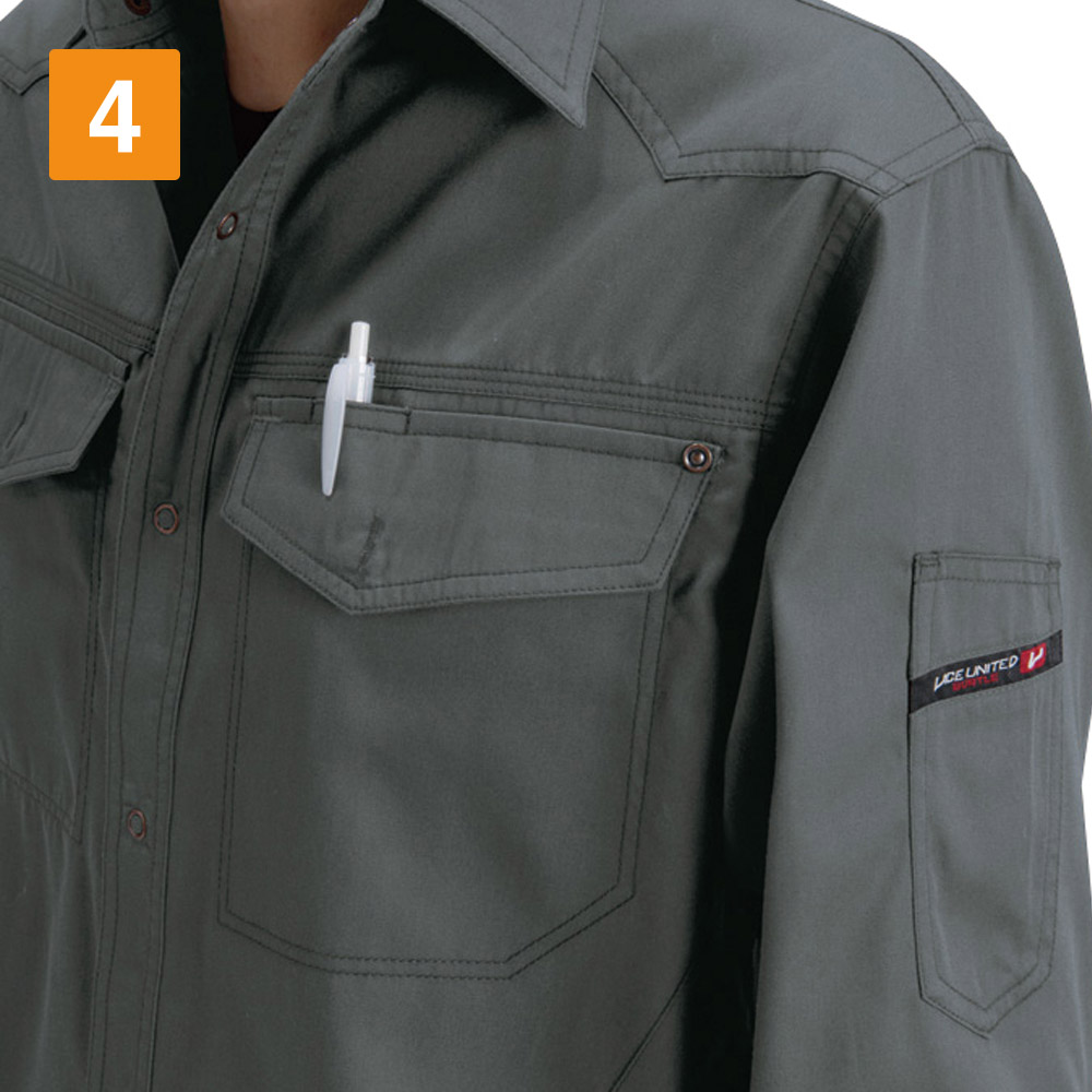 毎日着用するものこそ、かっこいい上質なものを選びたいですよね。このシャツはそんな要求にきっちり応えるクールな一着です。ボタンまでも同色で統一された、世界観すら感じるデザインに、さりげないロゴタグや別カラーのステッチがアクセントをプラス。こだわり抜かれたかっこよさをまとうことで、作業のテンションもアップ間違いなしです。また胴体の両サイドには、メッシュ素材をライン状に配置。通気性を高め服内部を快適に保ちつつ、ぐっと引き締めるアクセントとしても機能しています。