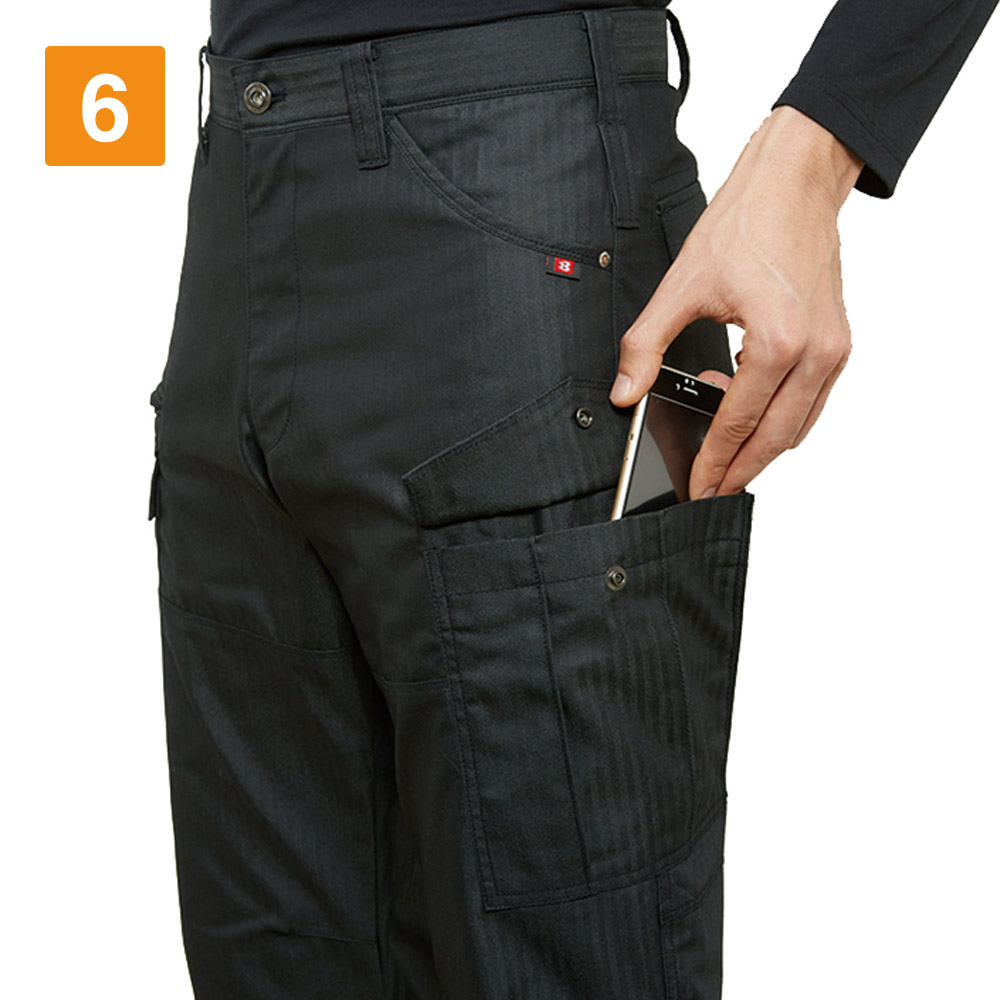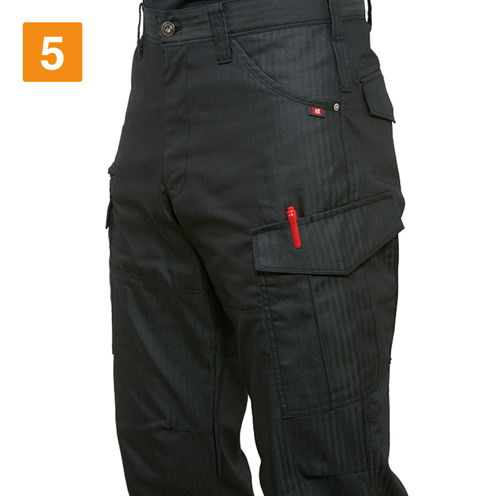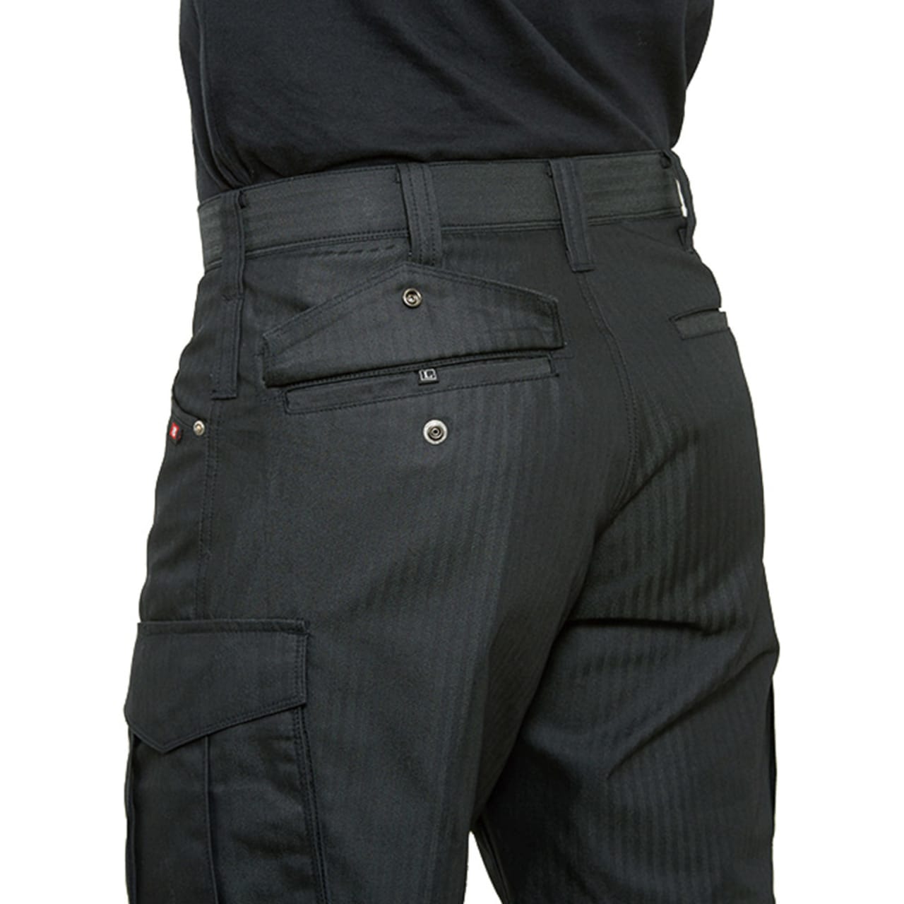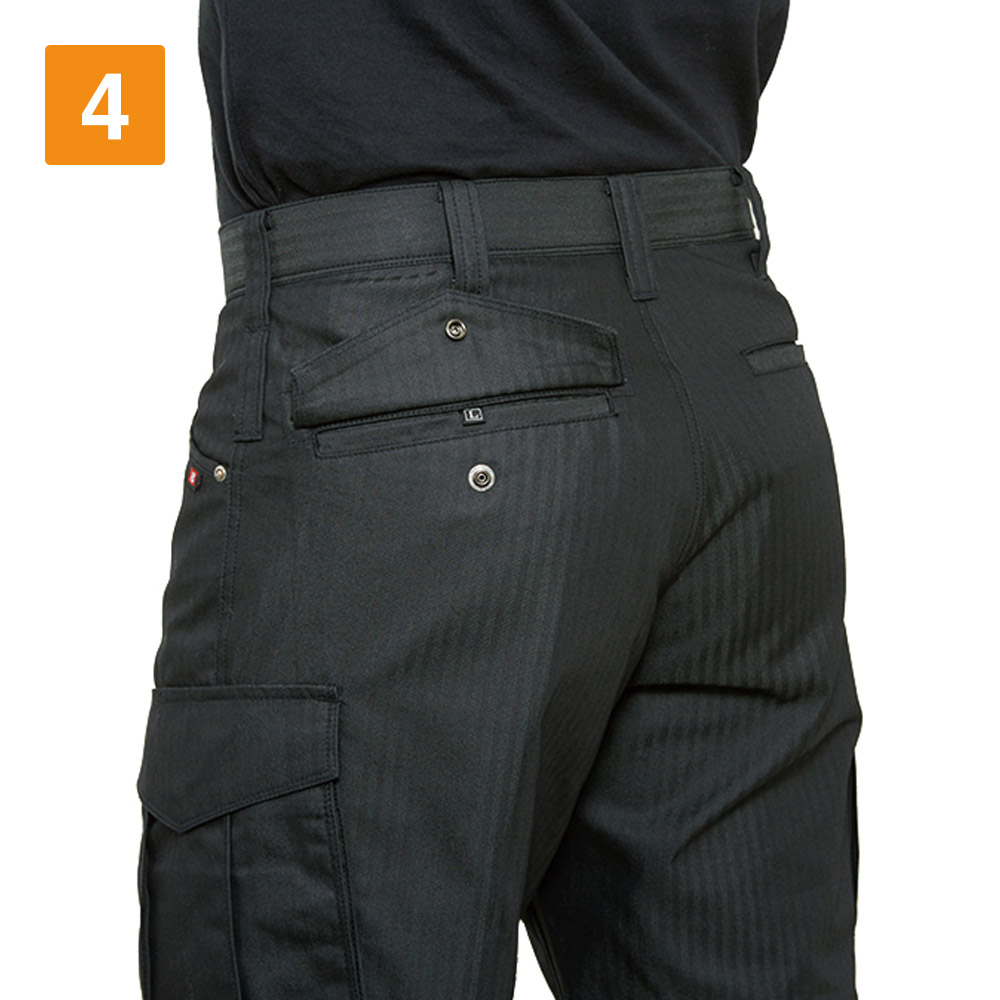 すらりとしたシルエットが人気のカーゴパンツ。ブラックヘリンボーン生地を使用することで、より一層引き締まった印象を与えてくれます。またカーゴポケットや生地切り替えなども全てブラックカラーで統一された、哲学を感じるデザインも魅力的。ヘリンボーンの柄とともに、パンツに唯一無二の存在感を与えます。フロントボタンのきらめきやウエストに配置されたタグなど、さりげないアクセントもポイント。一度は履きたい、まさにフラッグシップモデルらしい高級感にあふれたパンツです。