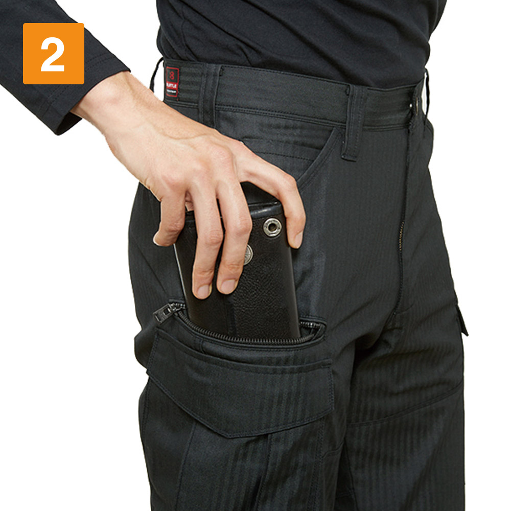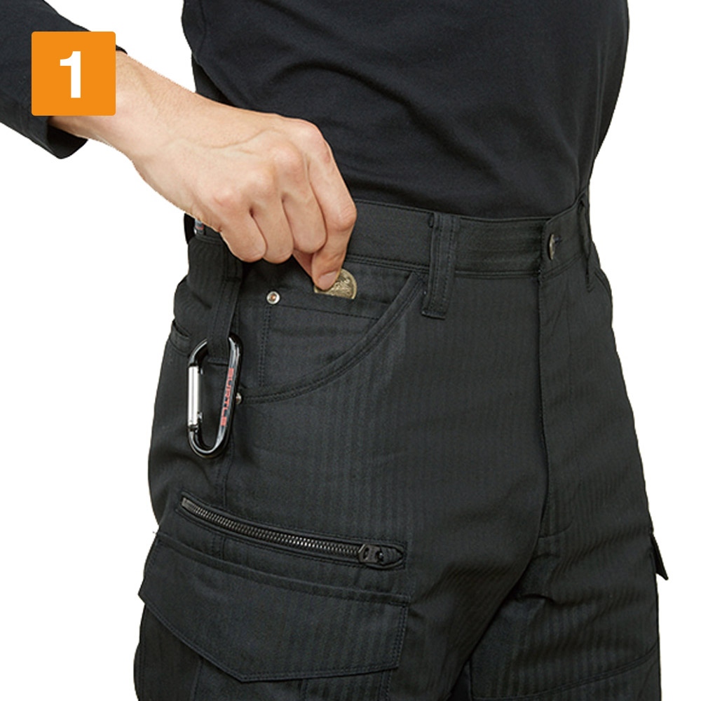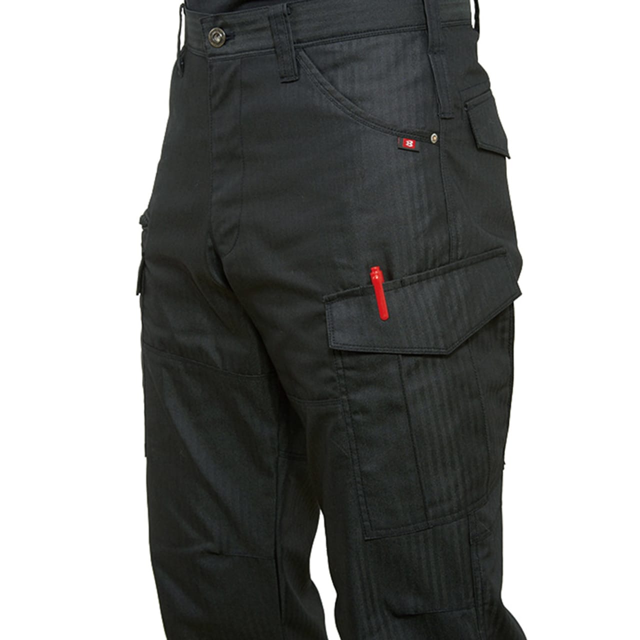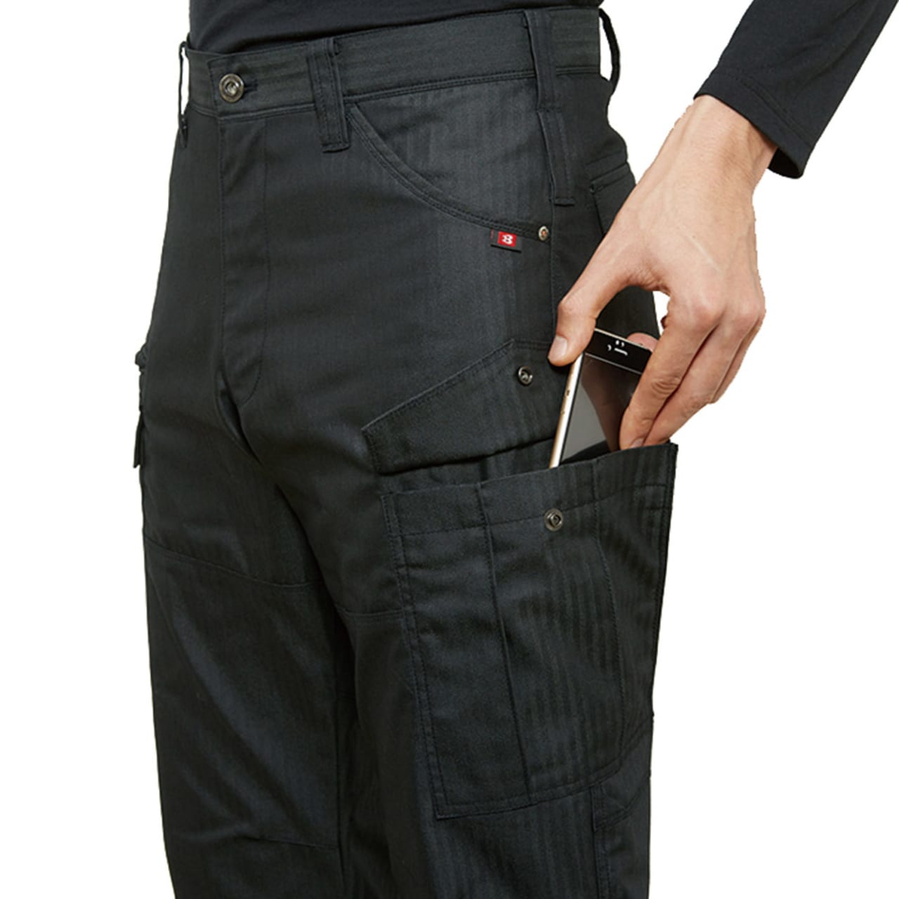 すらりとしたシルエットが人気のカーゴパンツ。ブラックヘリンボーン生地を使用することで、より一層引き締まった印象を与えてくれます。またカーゴポケットや生地切り替えなども全てブラックカラーで統一された、哲学を感じるデザインも魅力的。ヘリンボーンの柄とともに、パンツに唯一無二の存在感を与えます。フロントボタンのきらめきやウエストに配置されたタグなど、さりげないアクセントもポイント。一度は履きたい、まさにフラッグシップモデルらしい高級感にあふれたパンツです。