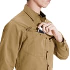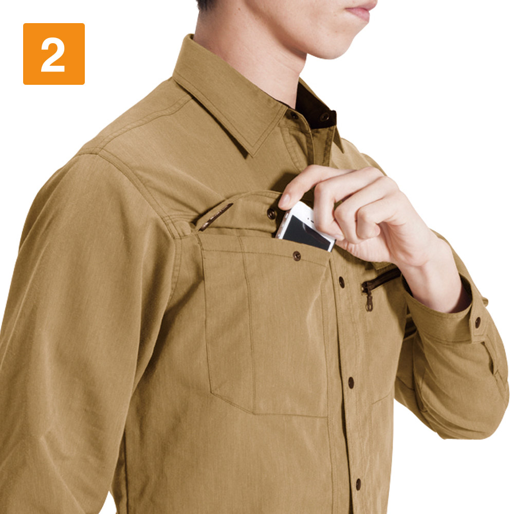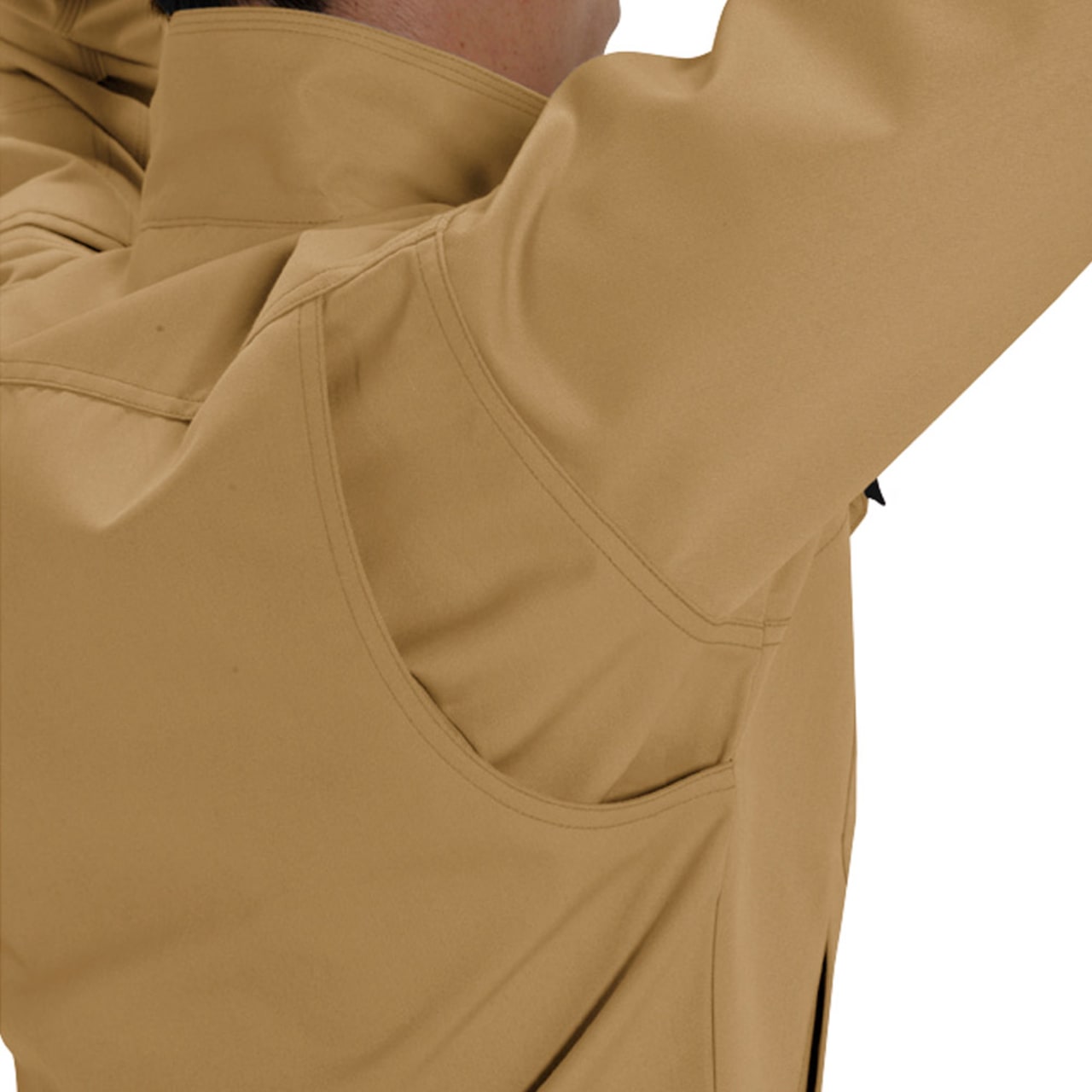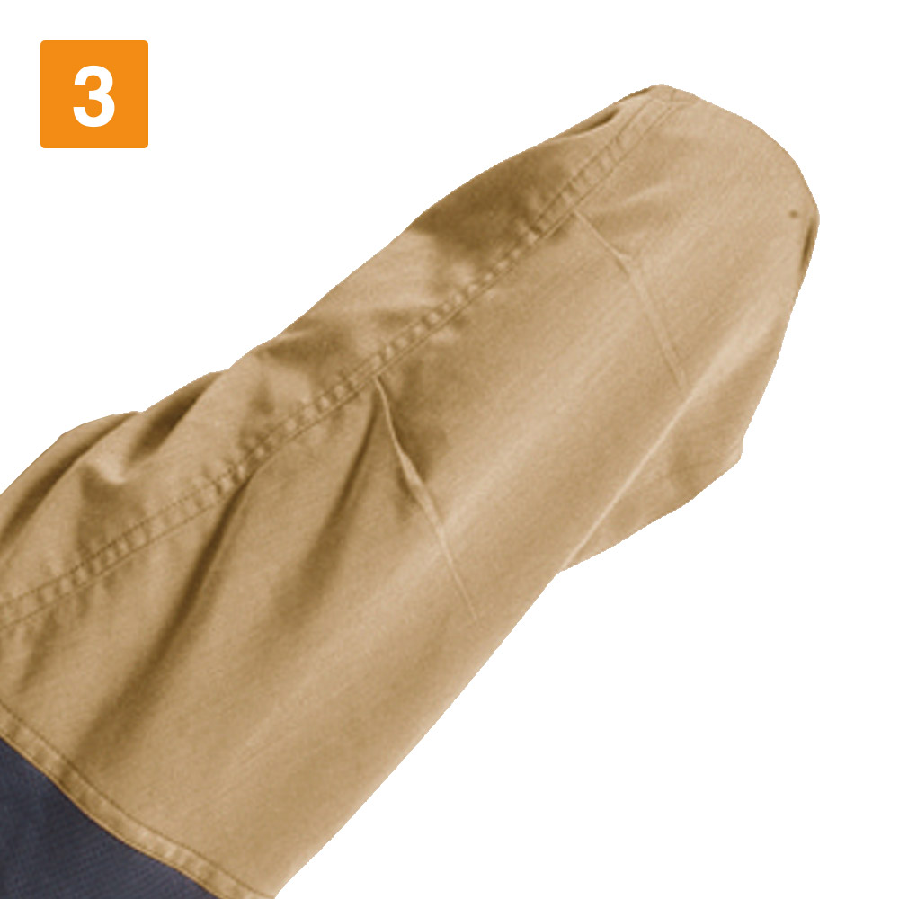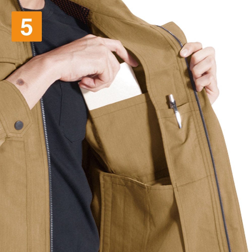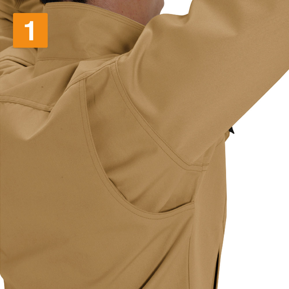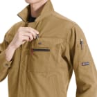 スマートシルエットがかっこいいジャケット。今回は実際にスタッフが着用してみました。着てみて驚いたのはその抜群の動きやすさ!肩や腕まわりの動きにほとんど制限を感じません。背中のアームノーフォークが前屈などの動きをとてもスムーズに。袖にはアームタックがとられており、腕の曲げ伸ばしも楽に行えます。シンプルデザインを邪魔することなく、機動性を支えるディテールによって作業性もアップする一着。体を大きく動かす現場作業におすすめの一着です。