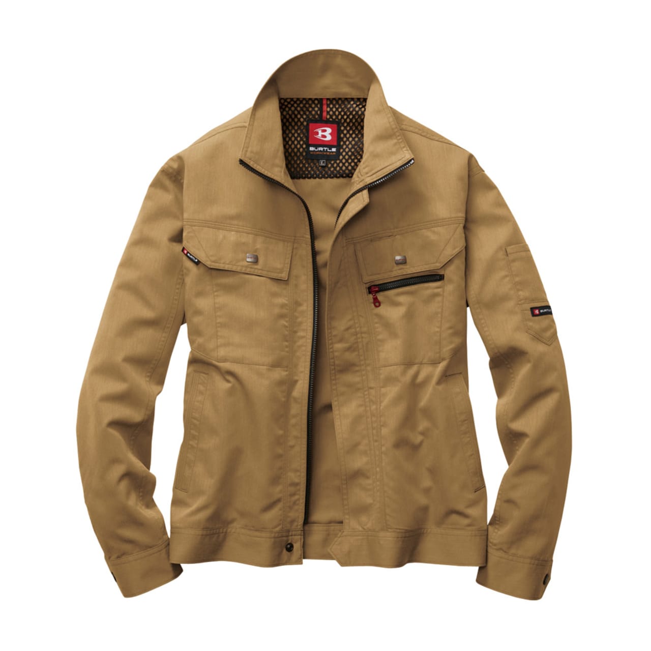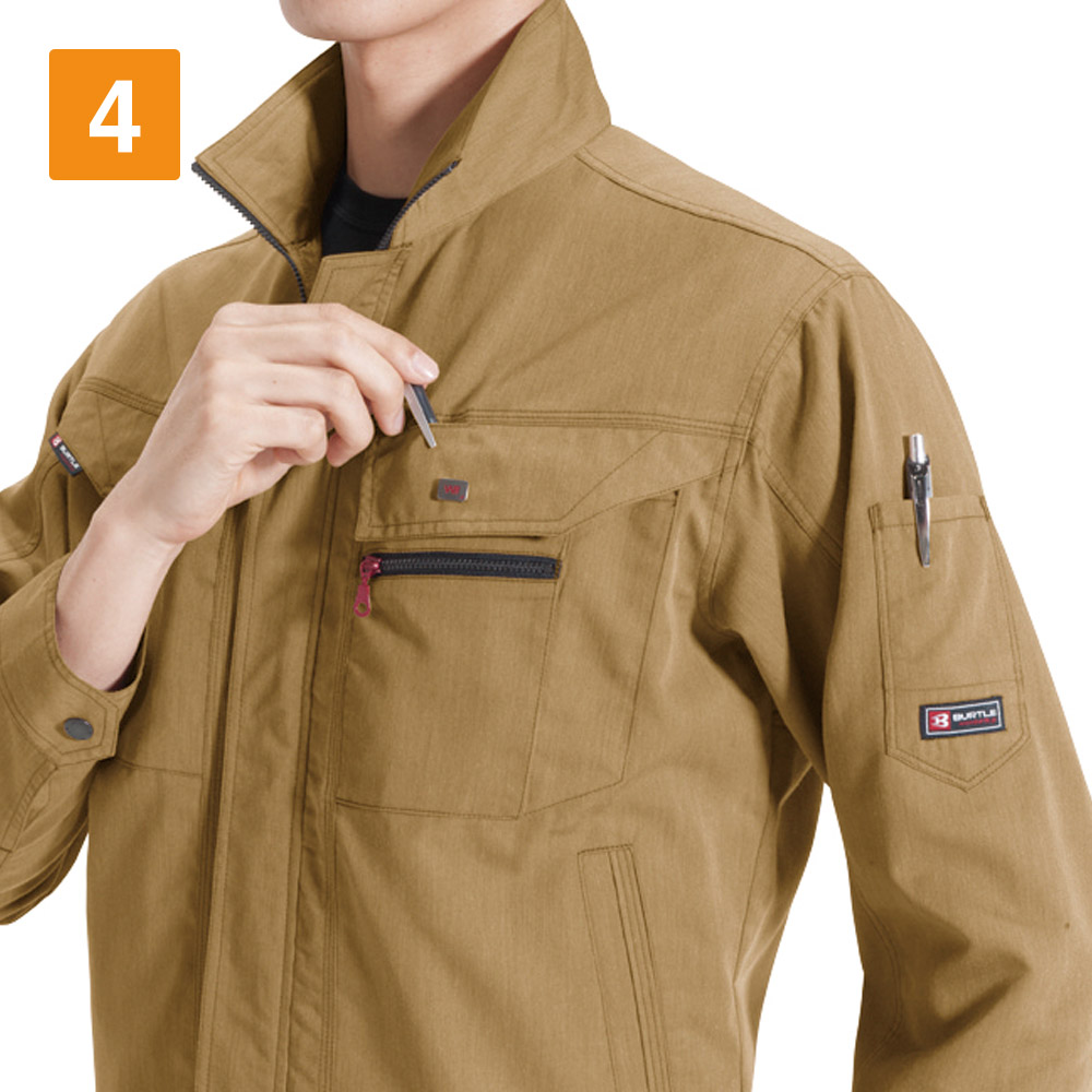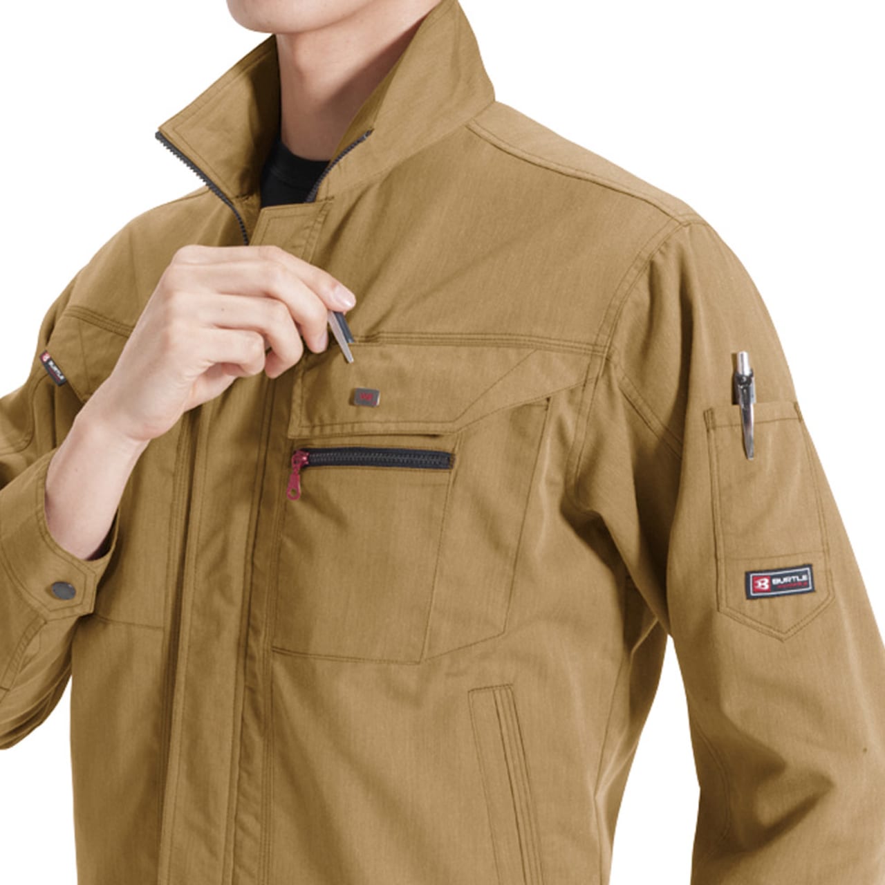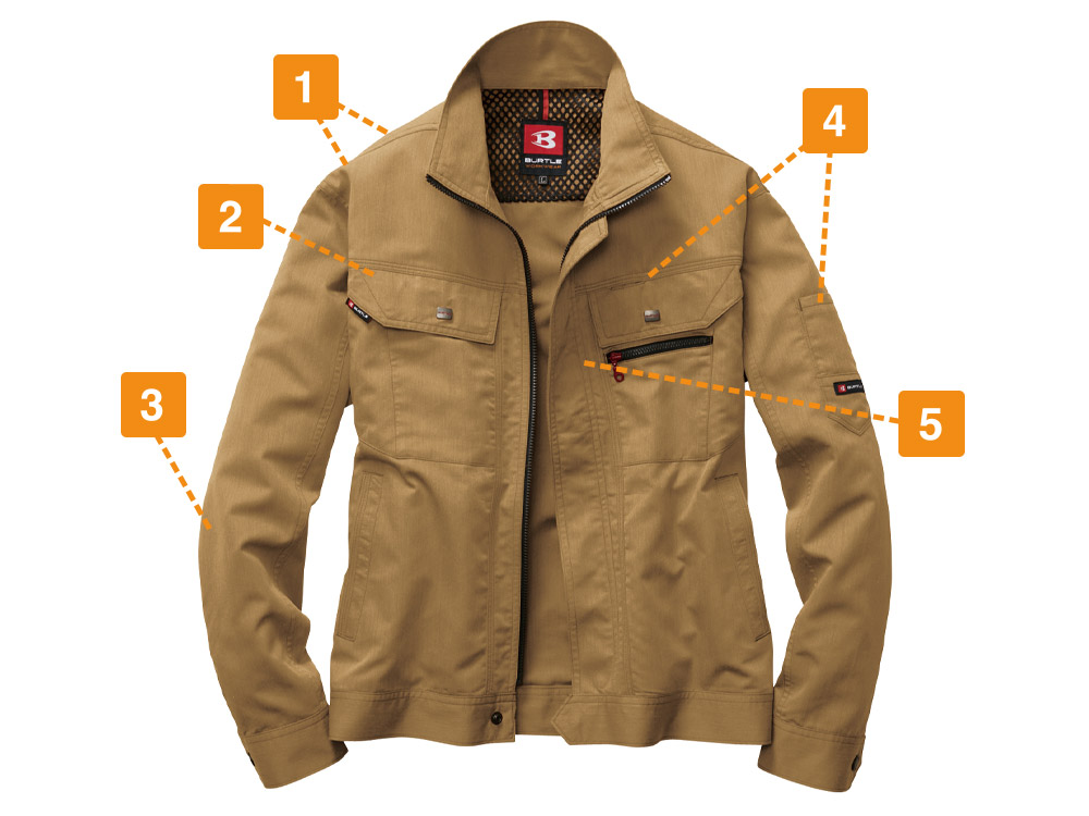 無駄のないシャープなシルエットが魅力の一着。スタンドカラーやステッチラインなど、縦を強調するデザインが、スマートなルックスを実現するジャケットです。シルエット自体はとてもシンプルながら、抜群の存在感を備える理由はそのディテール。メタルのフラップボタンやレッドカラーのファスナーチャーム、バートルのロゴテープなど、全体の印象をきりりと引き締めるアクセントが散りばめられています。杢調素材の独特の質感も相まって、一枚羽織るだけでこなれた雰囲気にしてくれるウェア。他にないかっこいいスタイルが、お仕事姿をスタイリッシュにします。