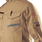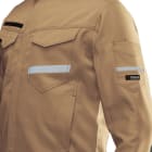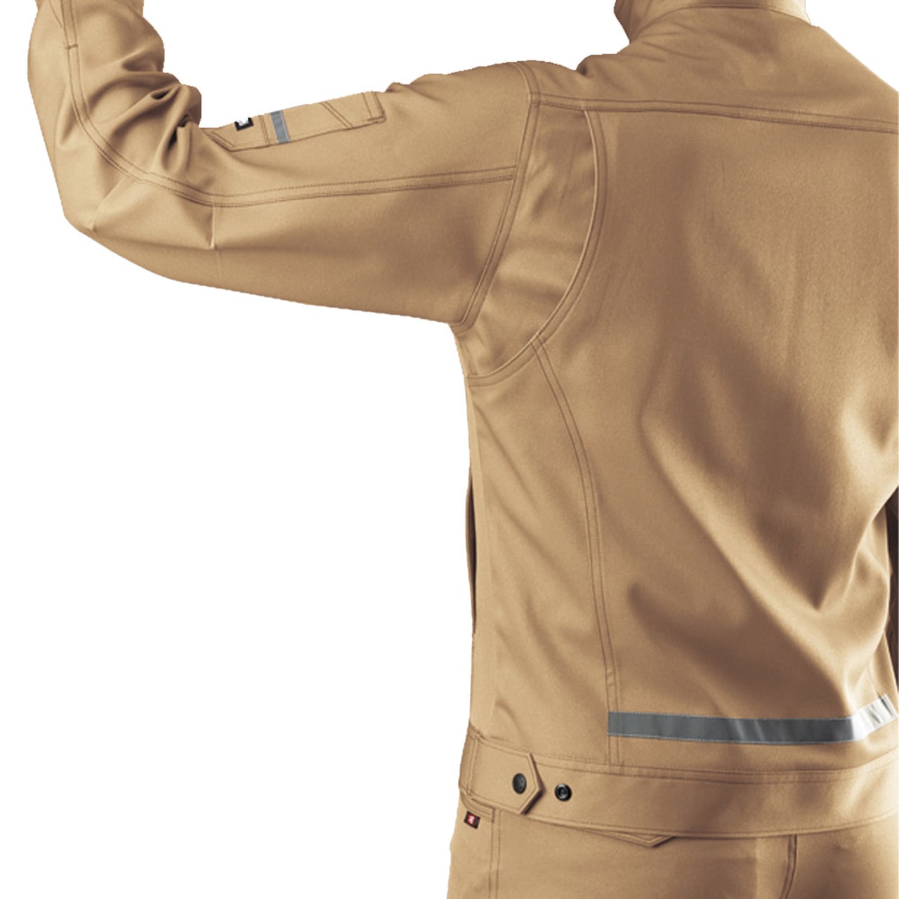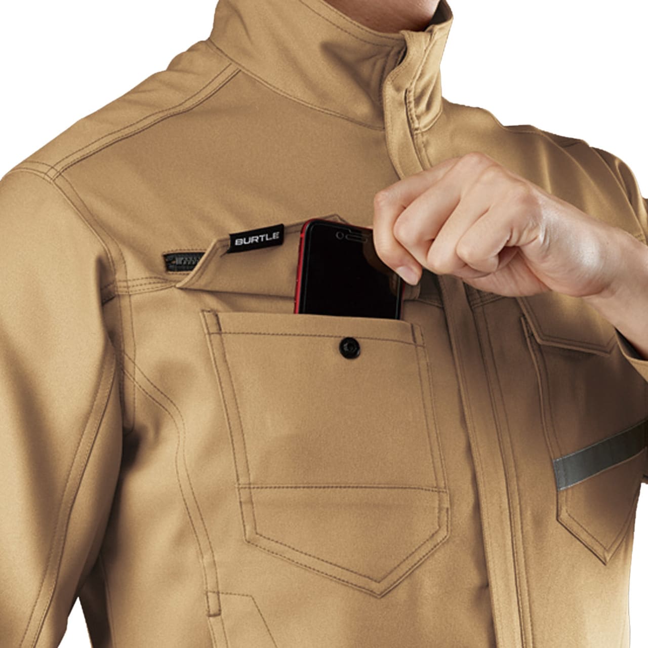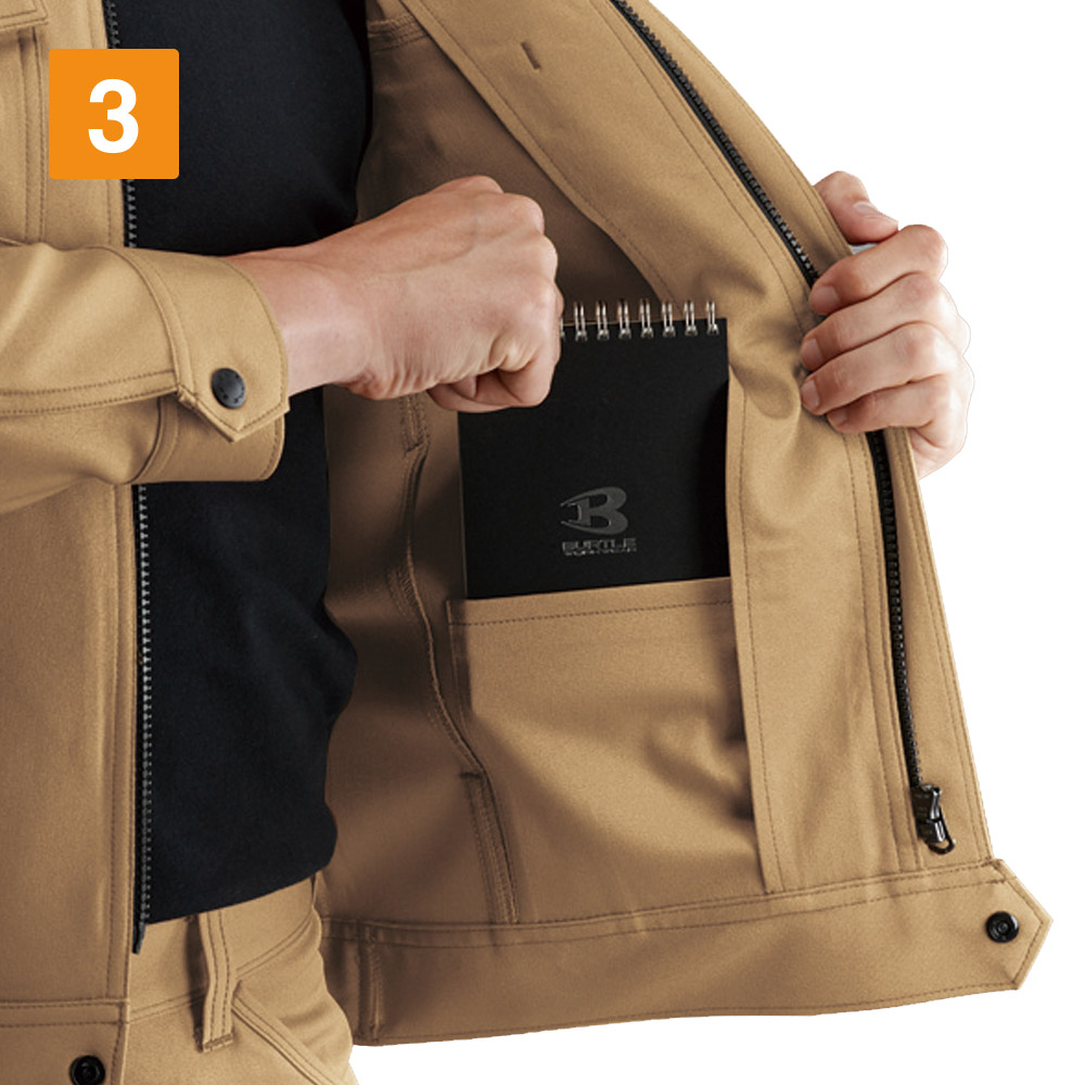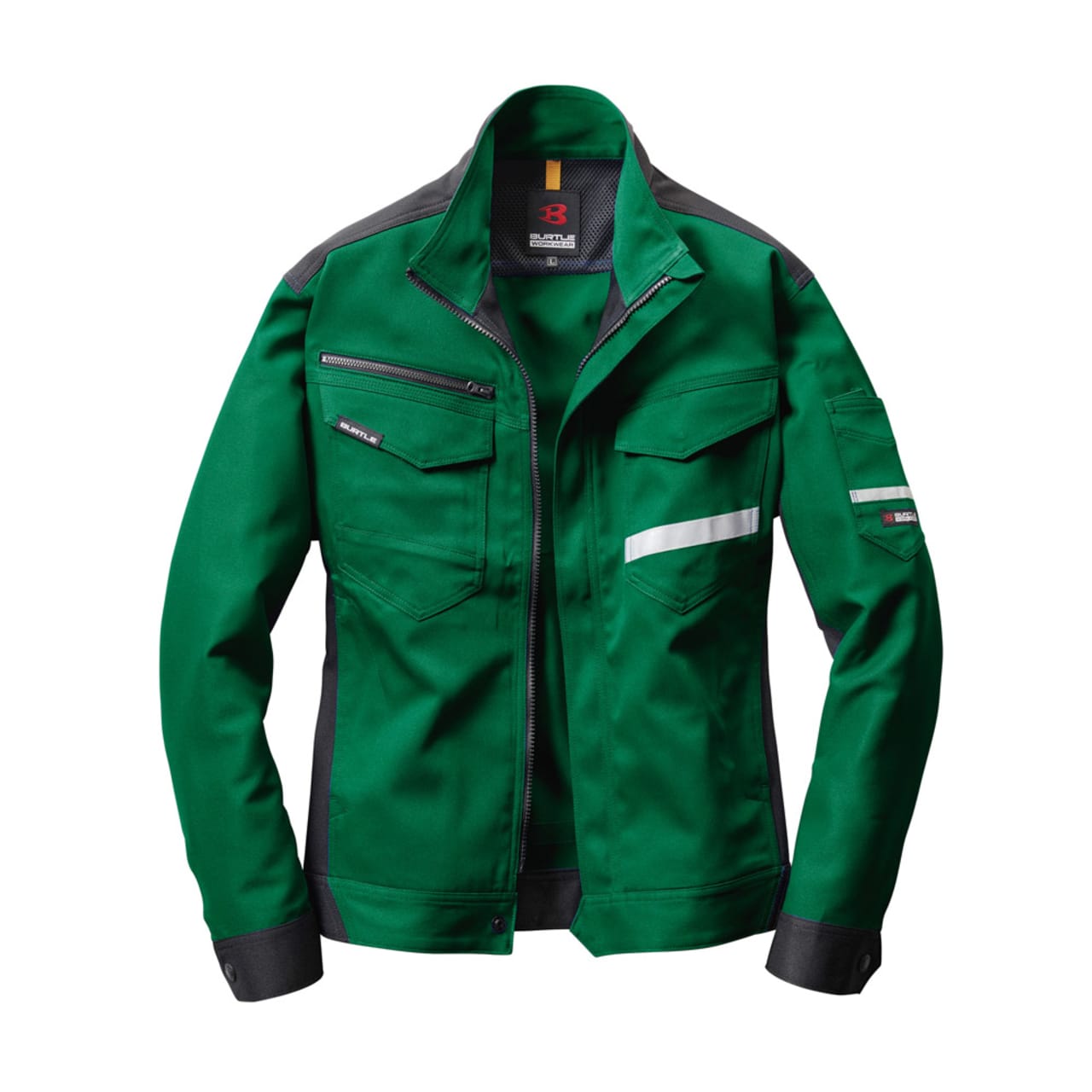 着用するだけで気持ちの引き締まるワークウェア、という印象です。ユニフォームはお仕事のモチベーションとも直結する部分なので、その点でも本当におすすめできる製品です。シャキッとした見た目なのに、抜群のストレッチ性能があるのも嬉しいポイント。いろいろな動きをして試してみましたが、肘の曲げ伸ばし、体のひねりなど様々な動きを妨げないので本当に快適でした。また、このジャケットはカラーによって随分印象が変わるので、貴社にベストな色合いをぜひ探してみてください。同シリーズのシャツやズボンとのコーディネートもおすすめです。また、刺繍を施すことによりワンランク上の作業服を演出することができます。