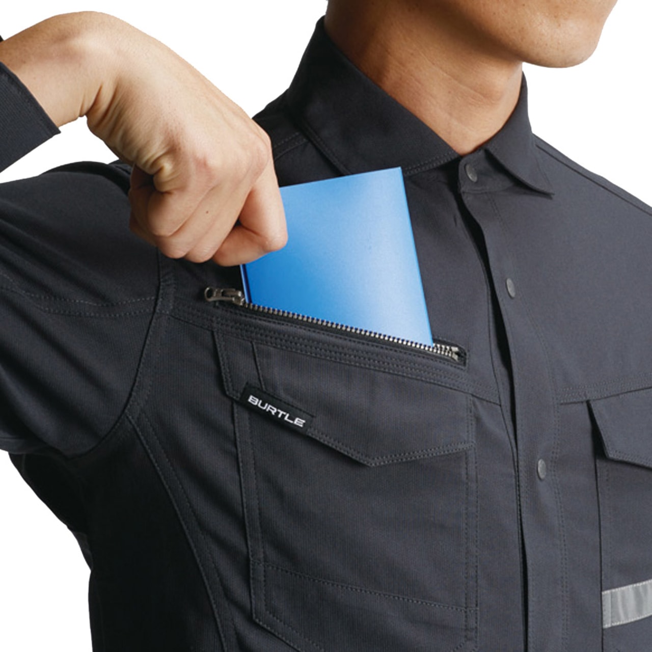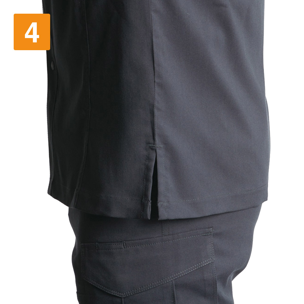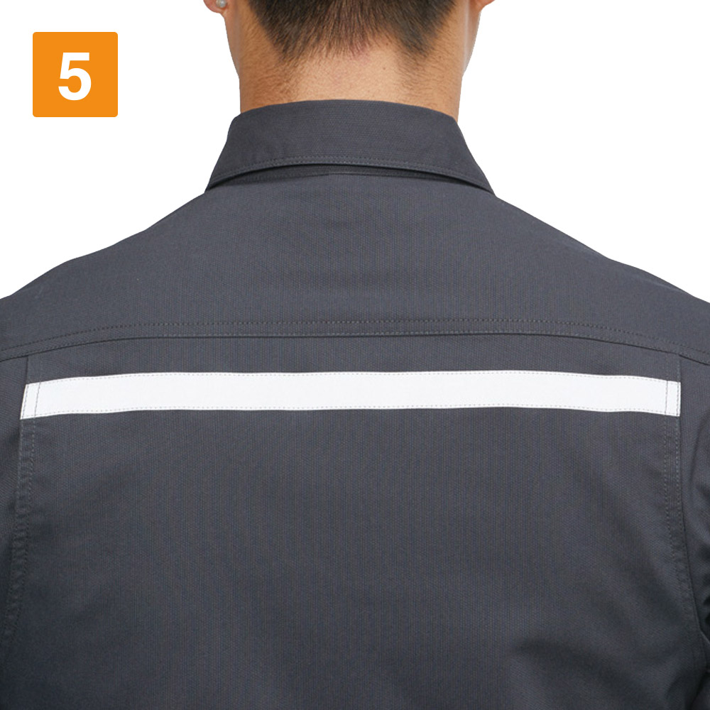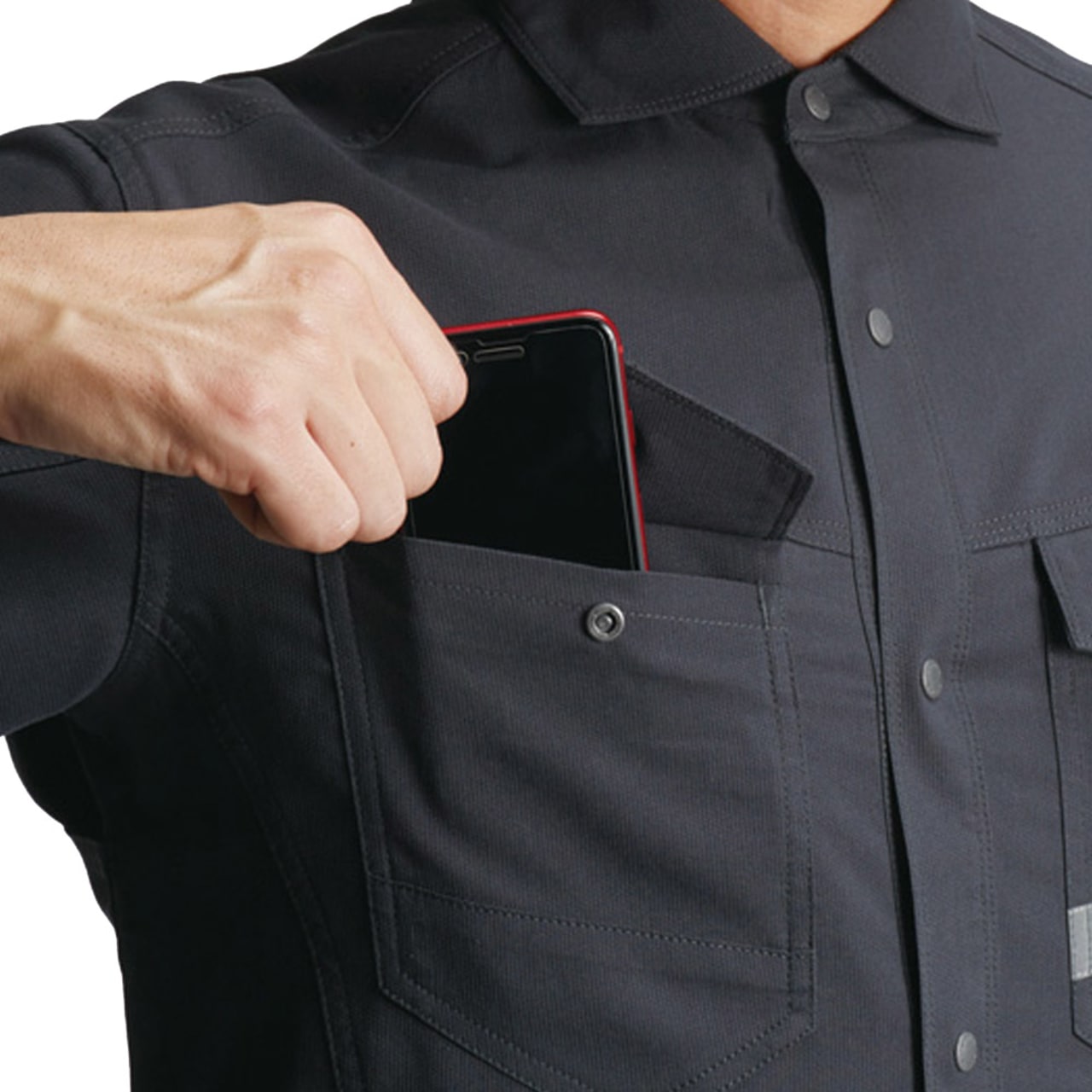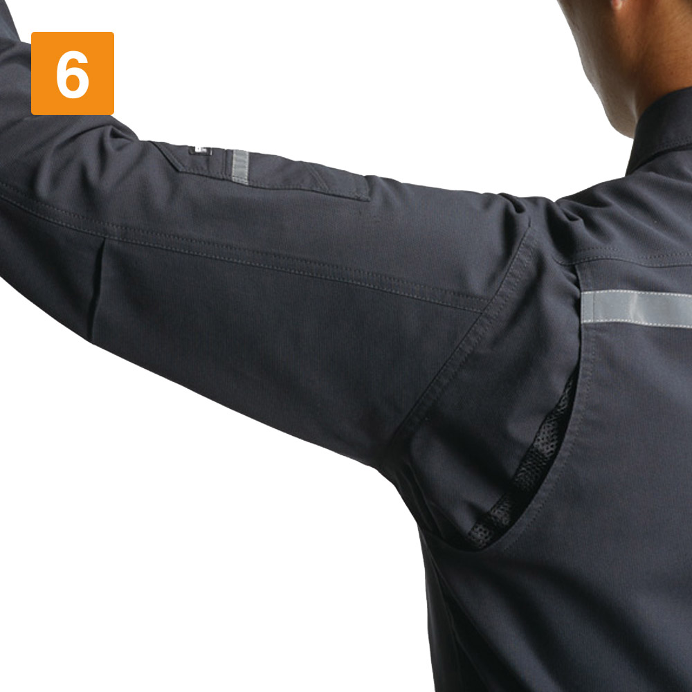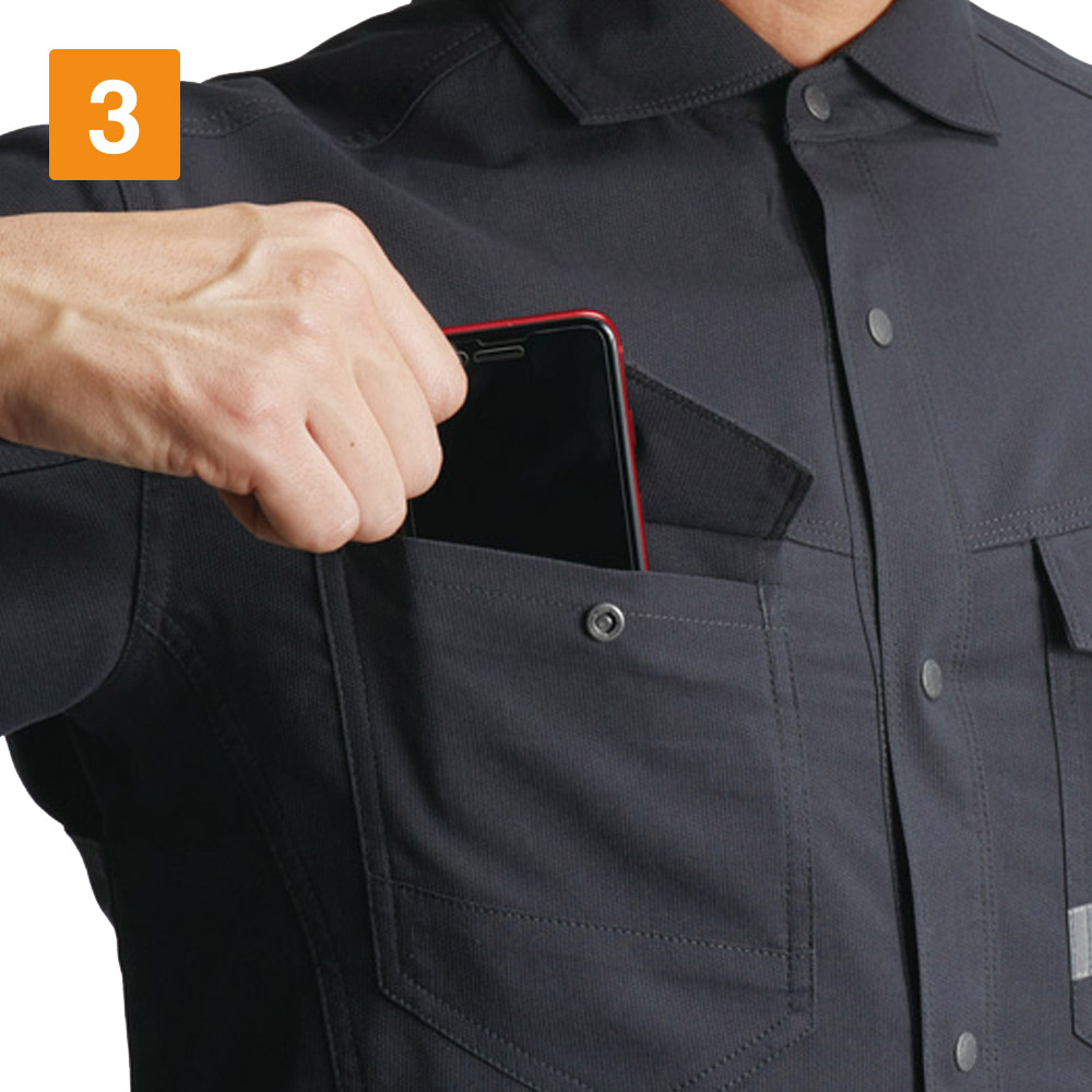 夏場の汗や蒸した空気は作業にとって大きな妨げです。このシャツはそんな環境下でも快適に作業いただけるよう生地に通気性・吸汗、速乾性を備えた生地を採用。汗のべたつきを抑え、汗をかいてもすぐにカラッとした着用感が復活します。ストレッチ素材が体にほどよくフィットする、スタイリッシュなシルエットに抜群の快適性をプラス。さらに袖や背中にメッシュ素材を使用することで、とことん涼やかな一着に。表面には多数のポケットを配置し、高い機能性を備えながらおしゃれと涼しさを叶えるワークウェアです。