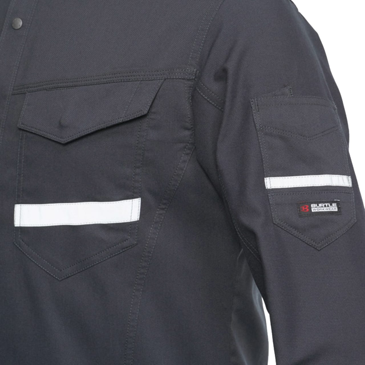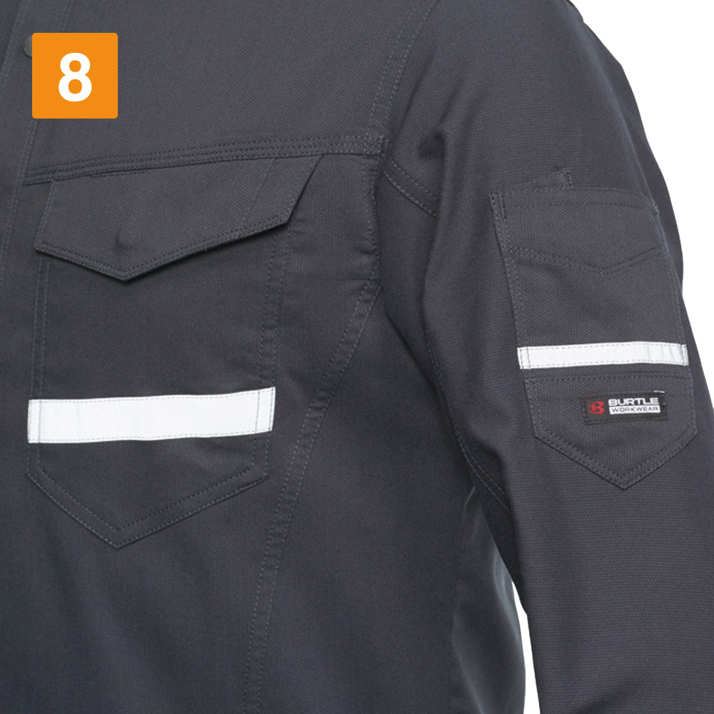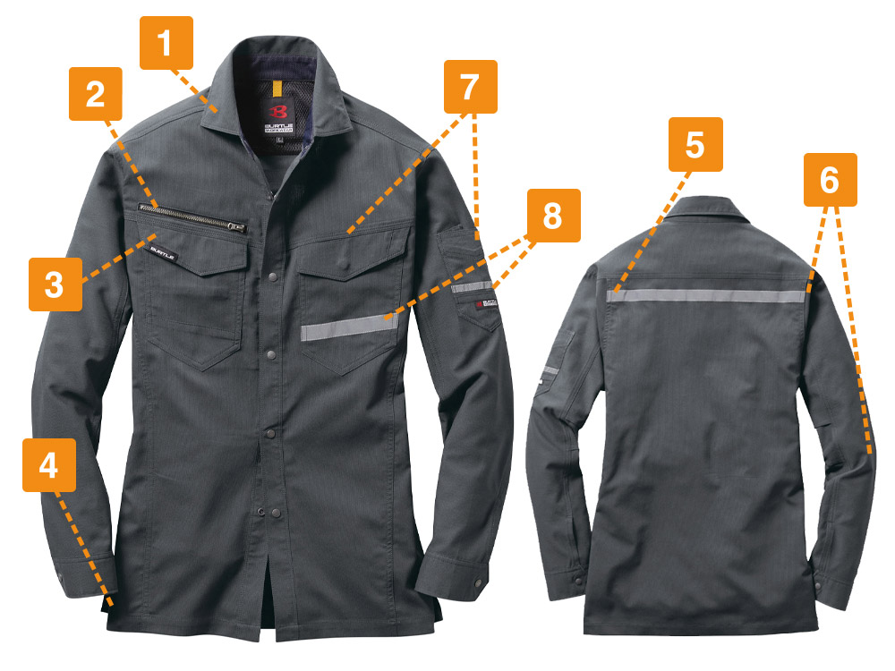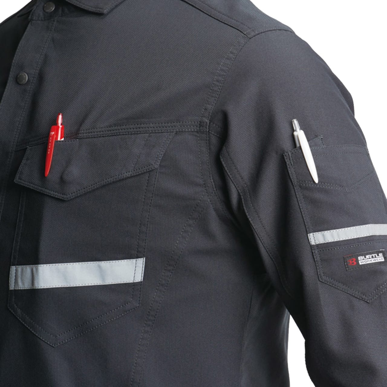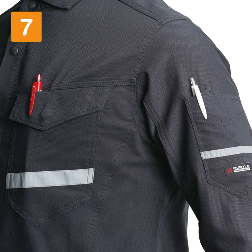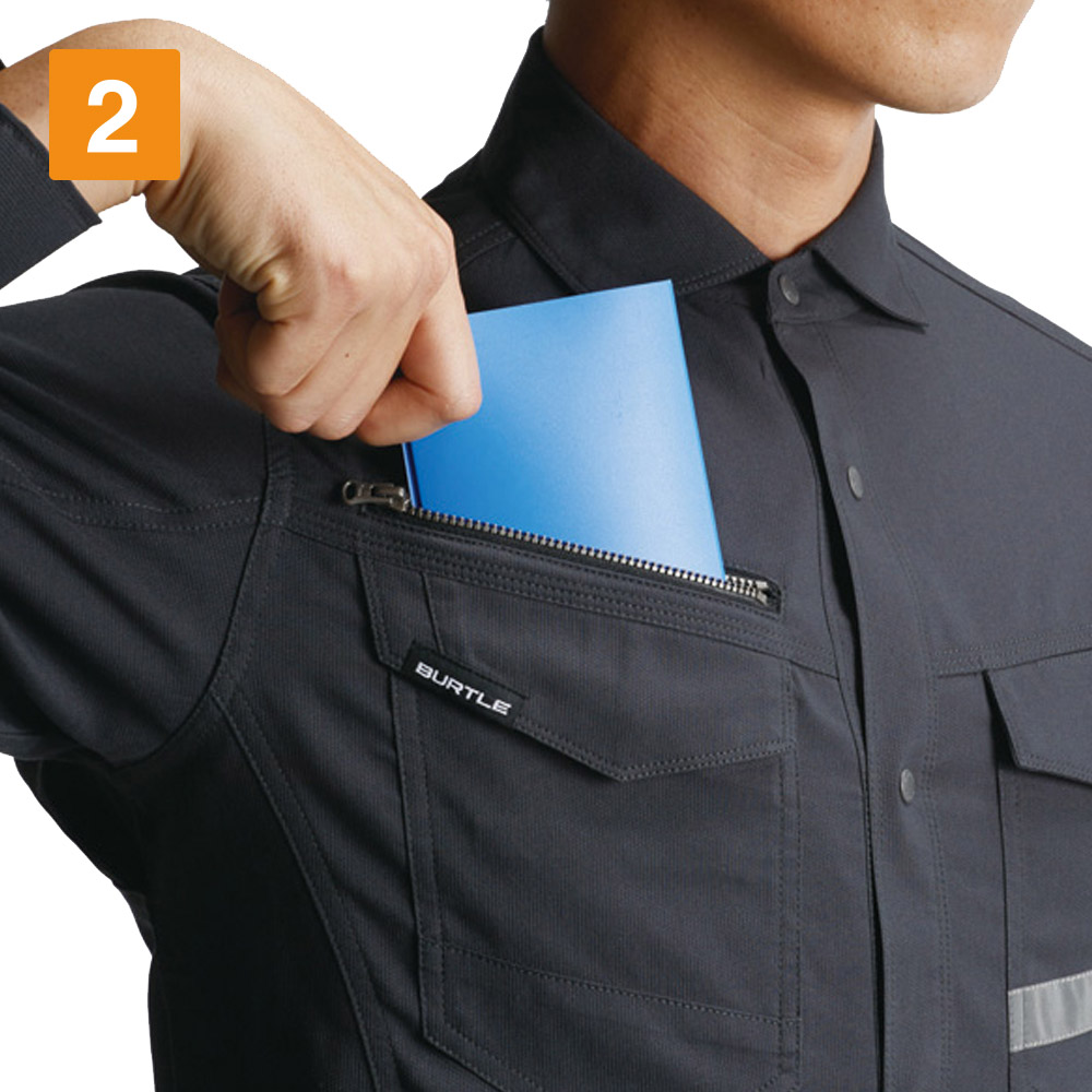 夏場の汗や蒸した空気は作業にとって大きな妨げです。このシャツはそんな環境下でも快適に作業いただけるよう生地に通気性・吸汗、速乾性を備えた生地を採用。汗のべたつきを抑え、汗をかいてもすぐにカラッとした着用感が復活します。ストレッチ素材が体にほどよくフィットする、スタイリッシュなシルエットに抜群の快適性をプラス。さらに袖や背中にメッシュ素材を使用することで、とことん涼やかな一着に。表面には多数のポケットを配置し、高い機能性を備えながらおしゃれと涼しさを叶えるワークウェアです。