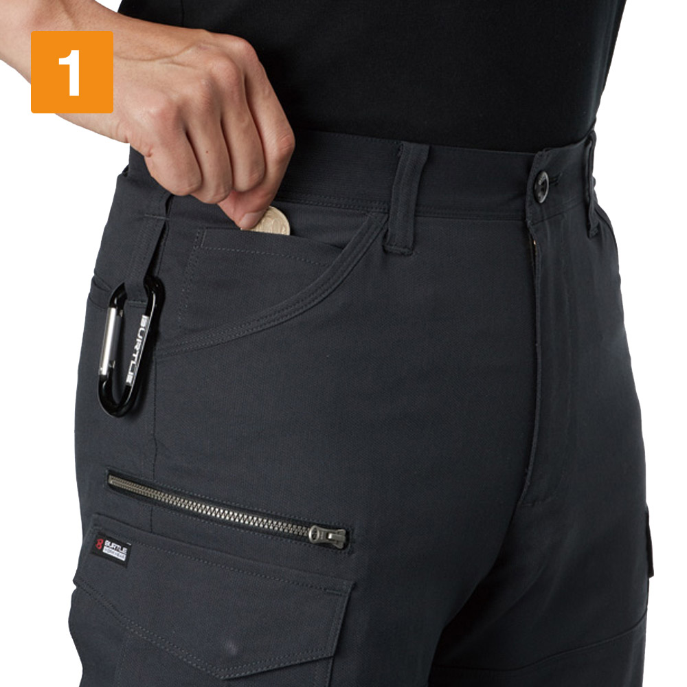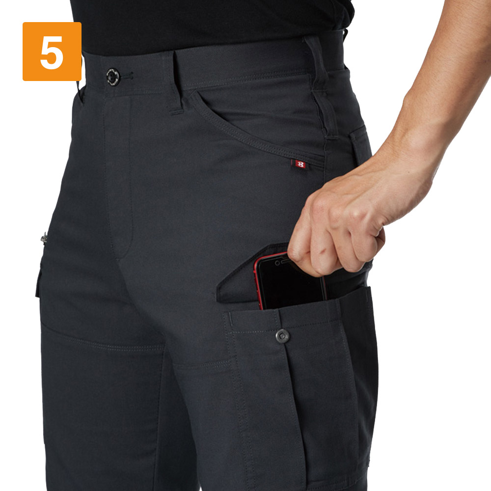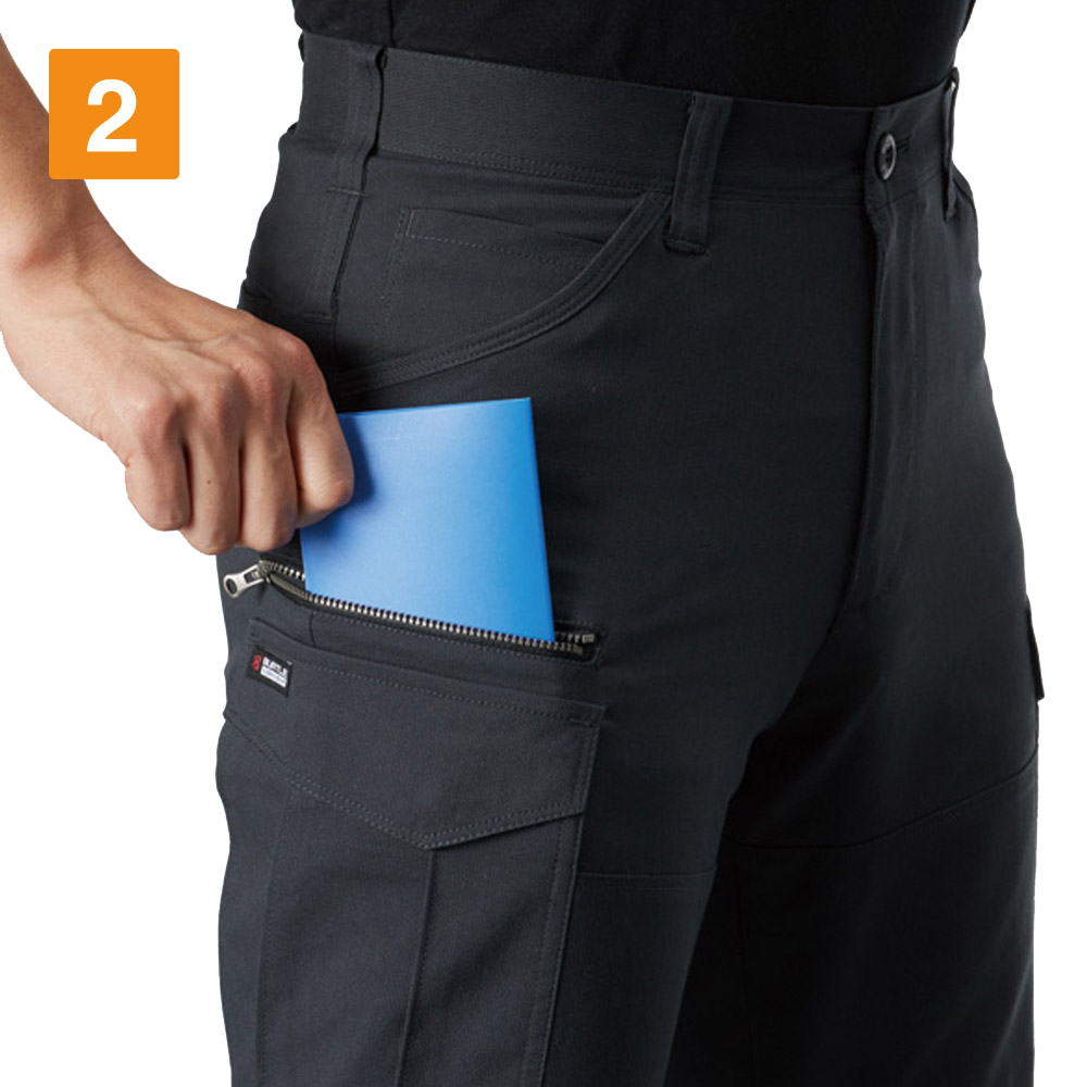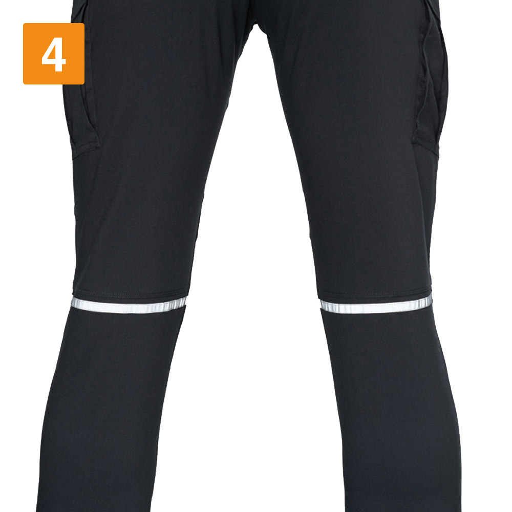 スムーズな動作を行うには、素材の伸長率が重要。こちらのカーゴパンツは、ストレッチドビークロスを使用することで、よく伸びて膝の曲げ伸ばしもしやすいです。見た目にもやや細身のデザインを採用しているため、作業着ながらも引き締まった印象に。スタイリッシュなユニフォームなので、若い人の多い職場にもおすすめです。リフレクターを膝の裏に付けることで、後方からの視認性も強化。機能的な収納ポケットを左右に搭載し、デザイン性のみならず使いやすさにも工夫の光るワークパンツです。