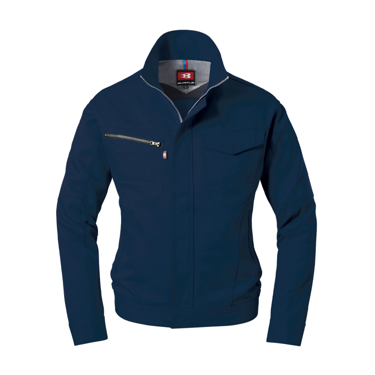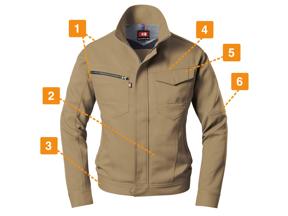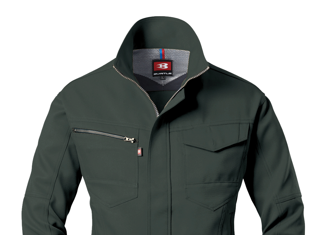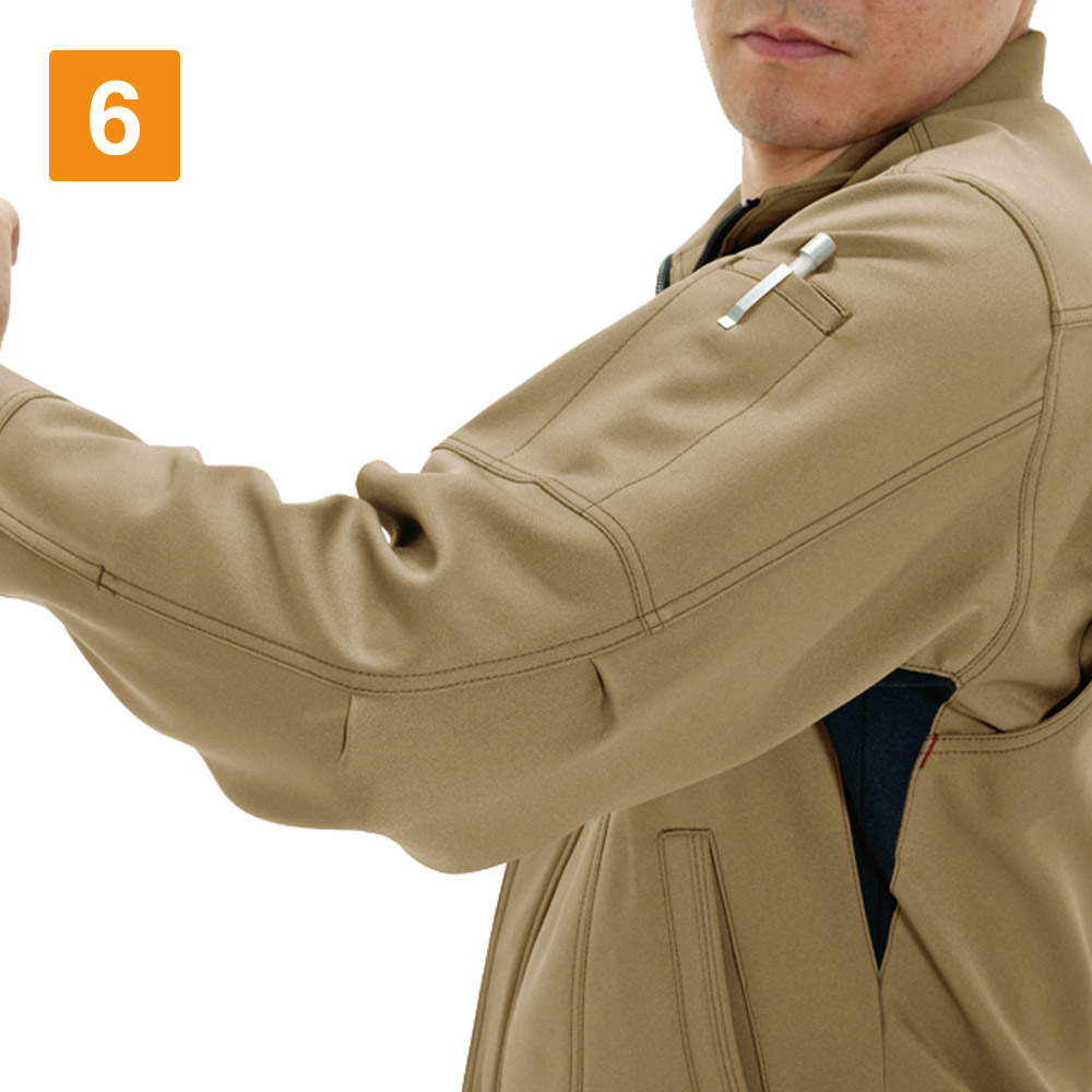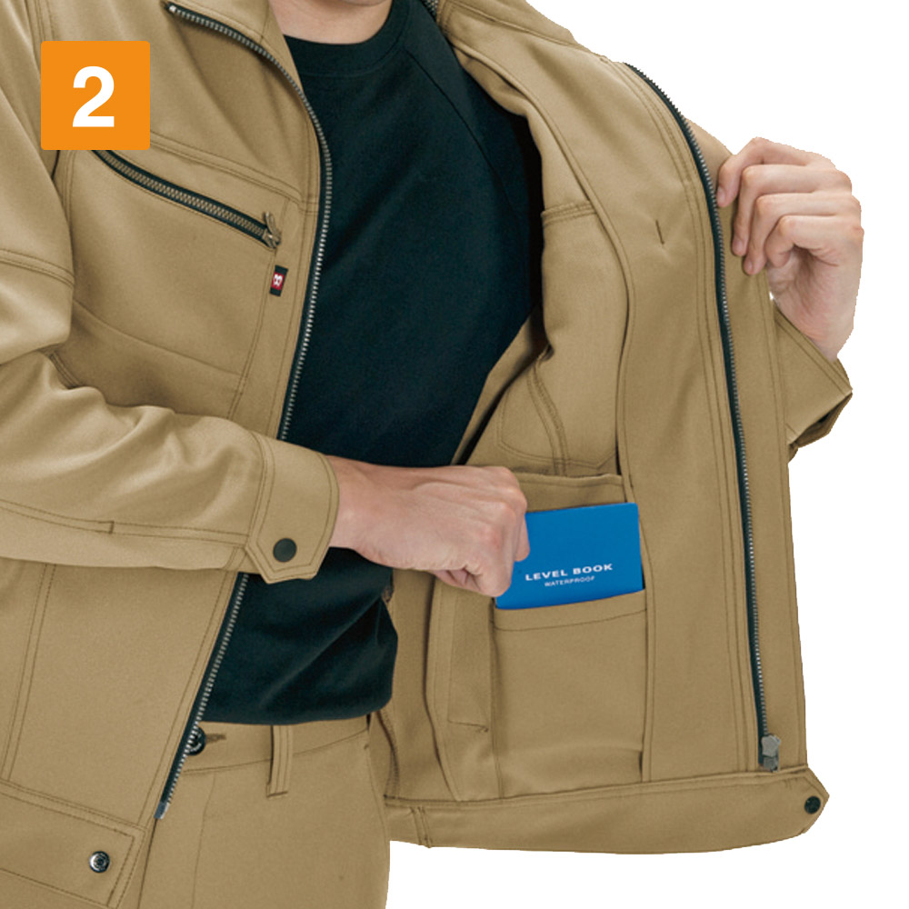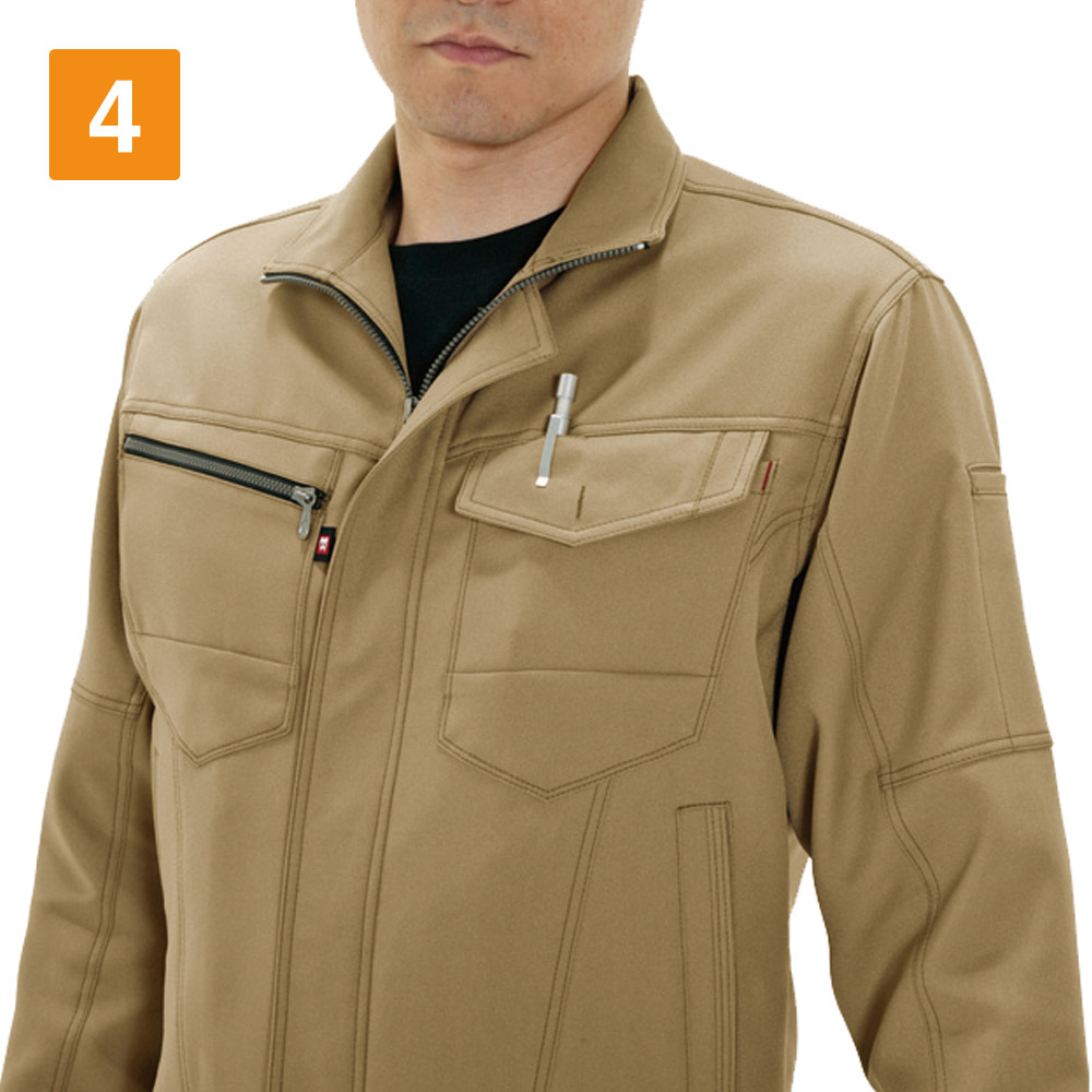 上半身を動かしやすいように工夫されたメカニカルストレッチ素材を使用したジャケット。さらに背の肩部分はノーフォーク、45ダイアカットで、肩周りの可動性をアップ。荷物の運搬や機械操作など、上半身をよく使う動作の多い職場にもピッタリ。袖ペンポケットは左に設置。胸のペン差しも左側についており、お好きな位置にペンを常備することが可能です。ウエストはドットアジャスターで、裾が作業を邪魔しません。