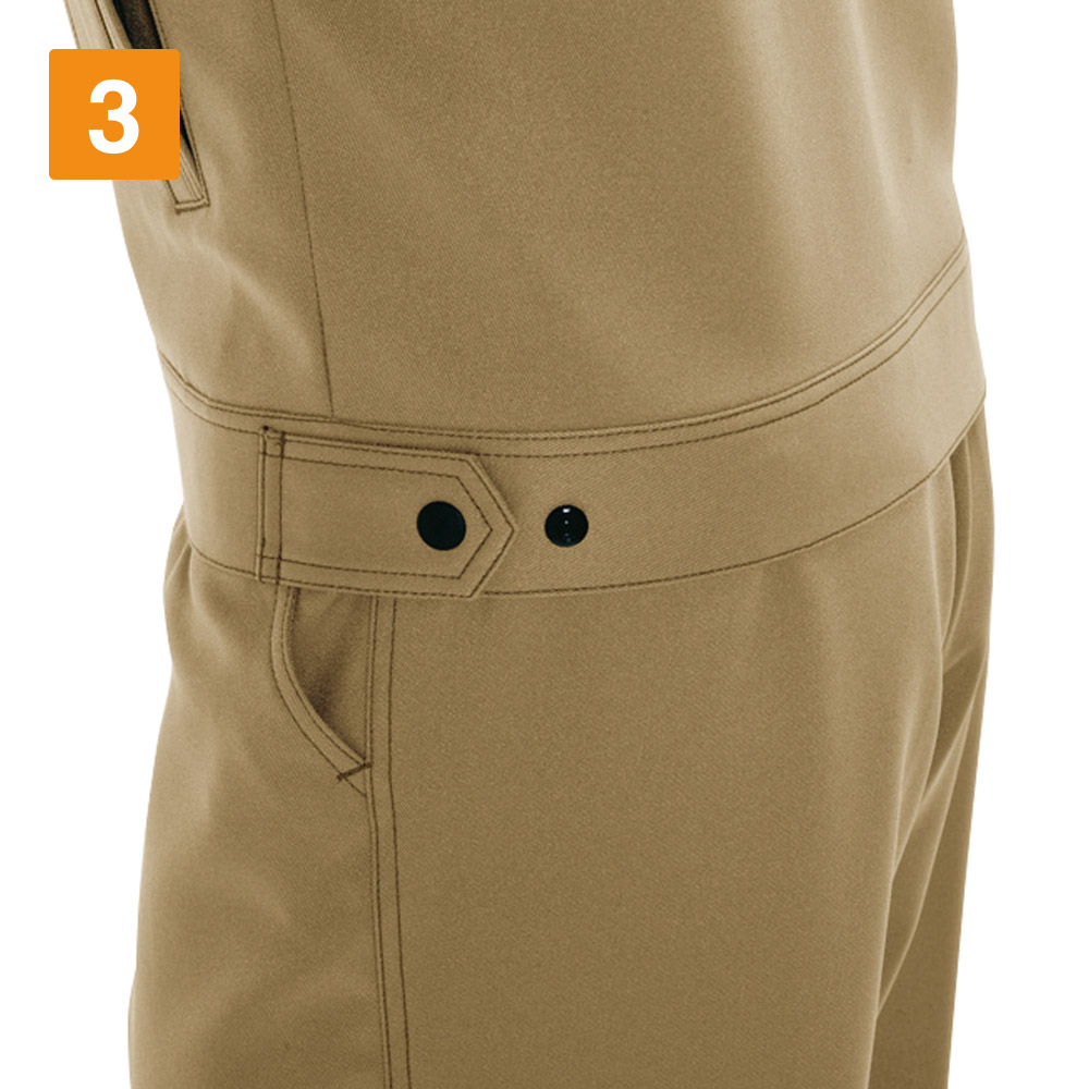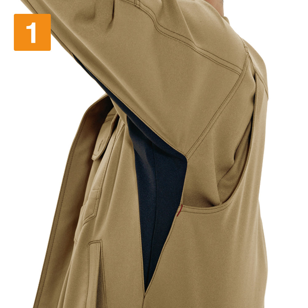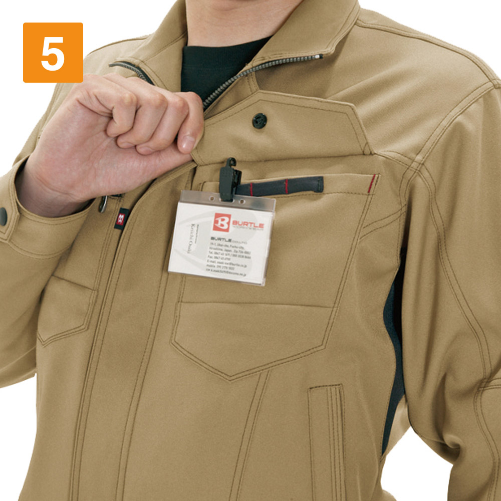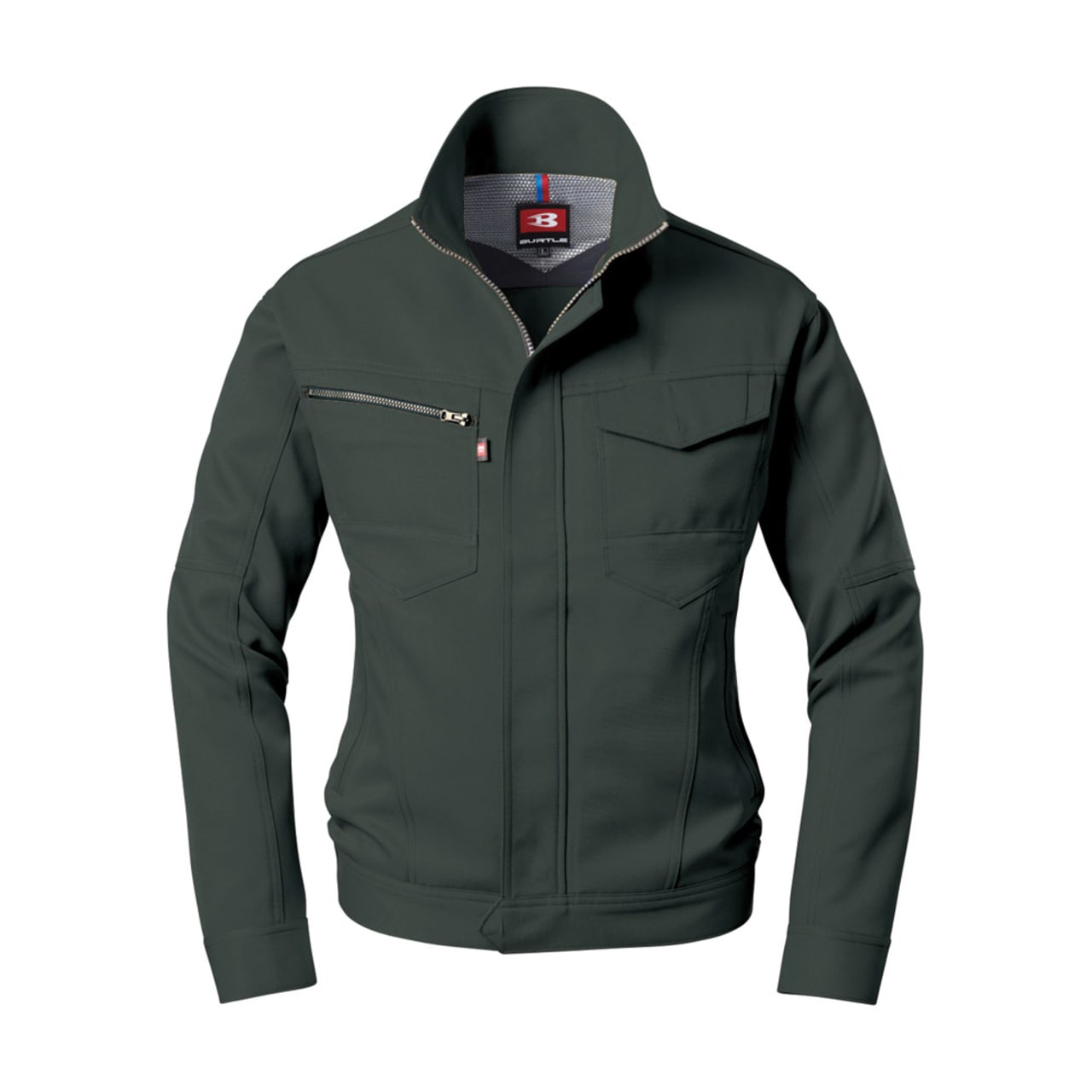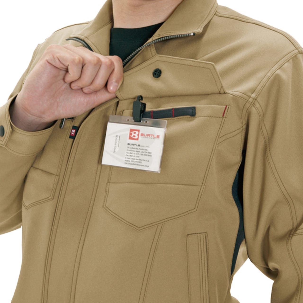 上半身を動かしやすいように工夫されたメカニカルストレッチ素材を使用したジャケット。さらに背の肩部分はノーフォーク、45ダイアカットで、肩周りの可動性をアップ。荷物の運搬や機械操作など、上半身をよく使う動作の多い職場にもピッタリ。袖ペンポケットは左に設置。胸のペン差しも左側についており、お好きな位置にペンを常備することが可能です。ウエストはドットアジャスターで、裾が作業を邪魔しません。