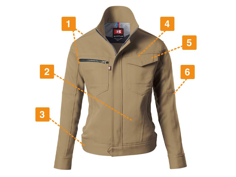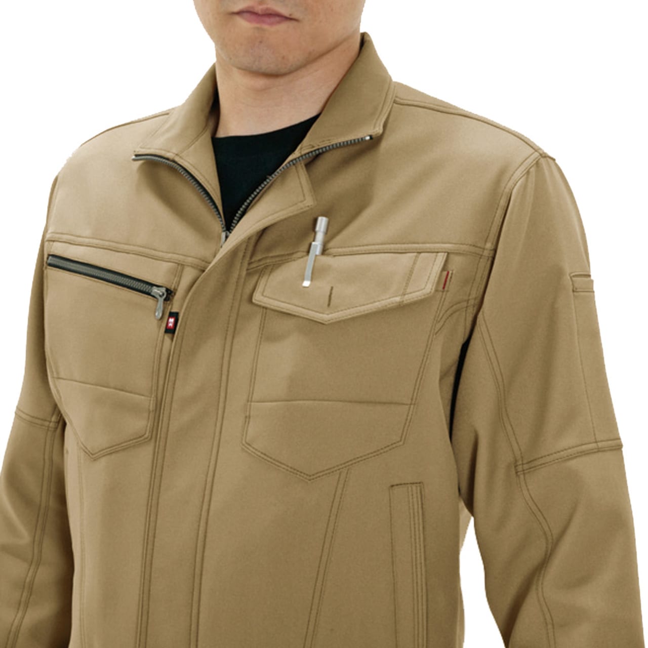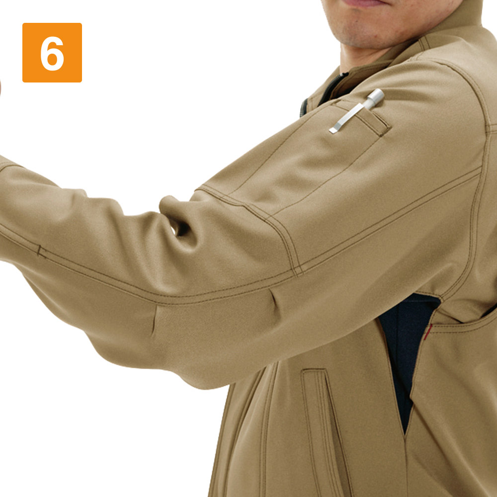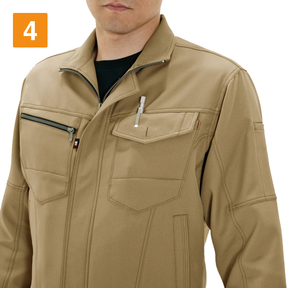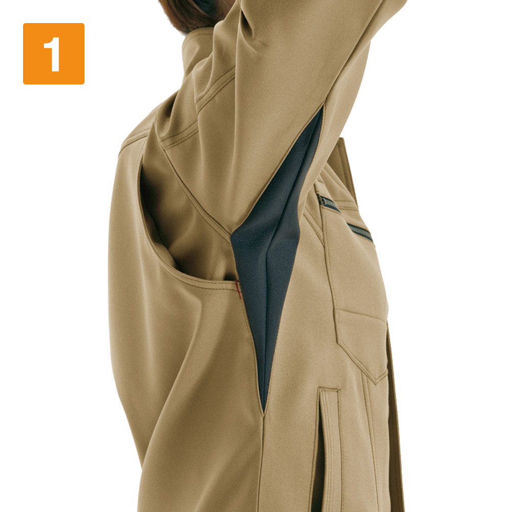上半身の動きをスムーズにサポートする、メカニカルストレッチ機能をもつジャケット。分厚く硬い素材の場合、上半身の動きを邪魔して肩の突っ張りなどを感じやすいもの。こちらのジャケットは、45ダイヤカットや背アームノーフォークが、腕や肩の動きをジャケットが邪魔しないように工夫。腕を上げ下げする動作や、荷物を持ち運びする動作、後方を振り返って確認する際など、さまざまな上半身の動きをサポート。全身を使う作業や敷地が広く移動の多い職場などでも活躍します。