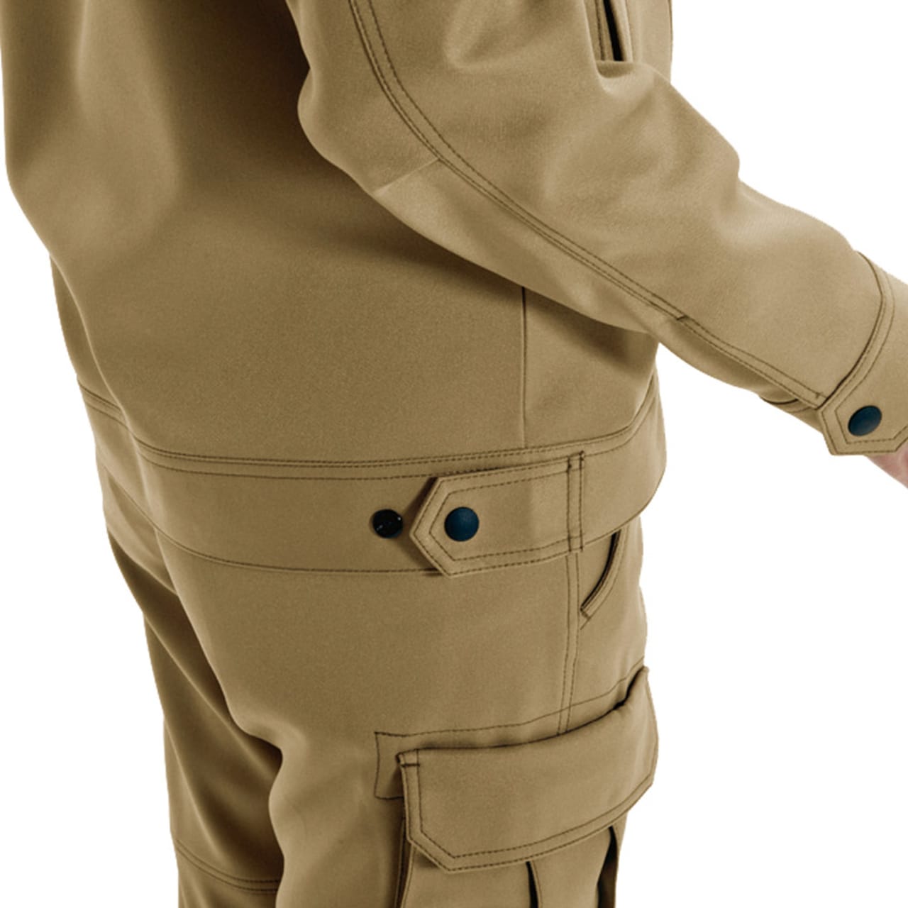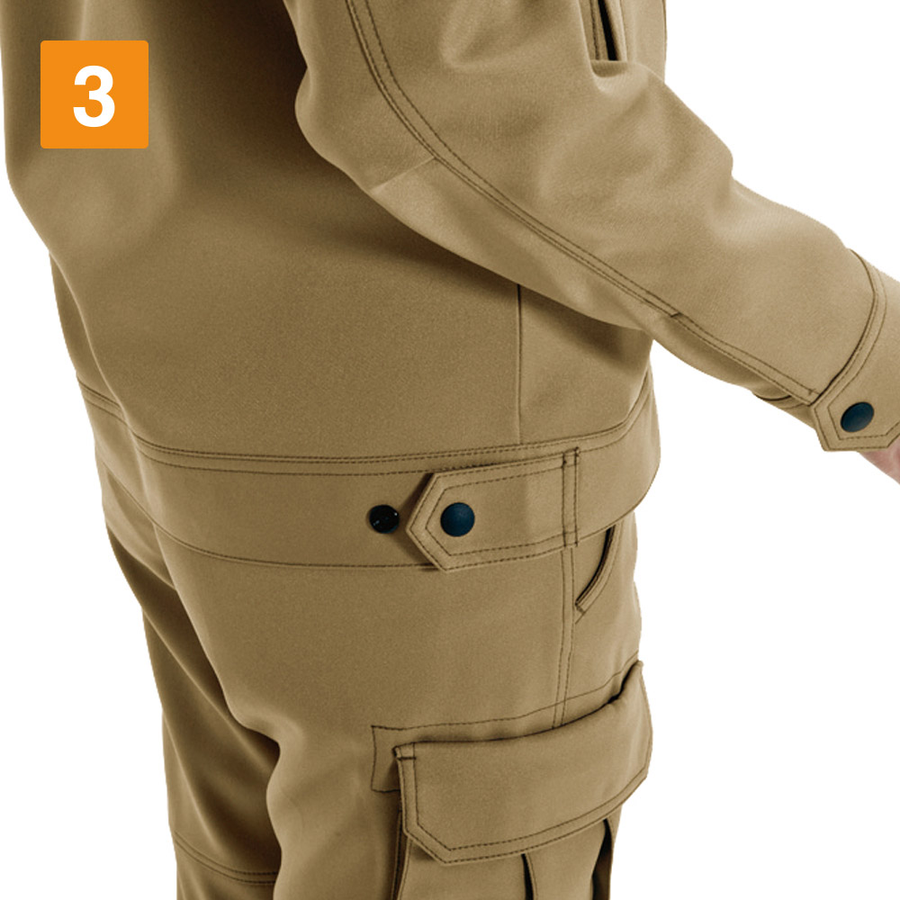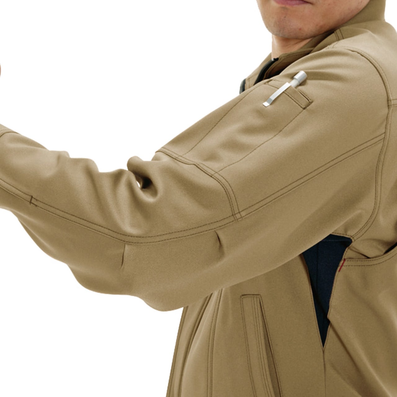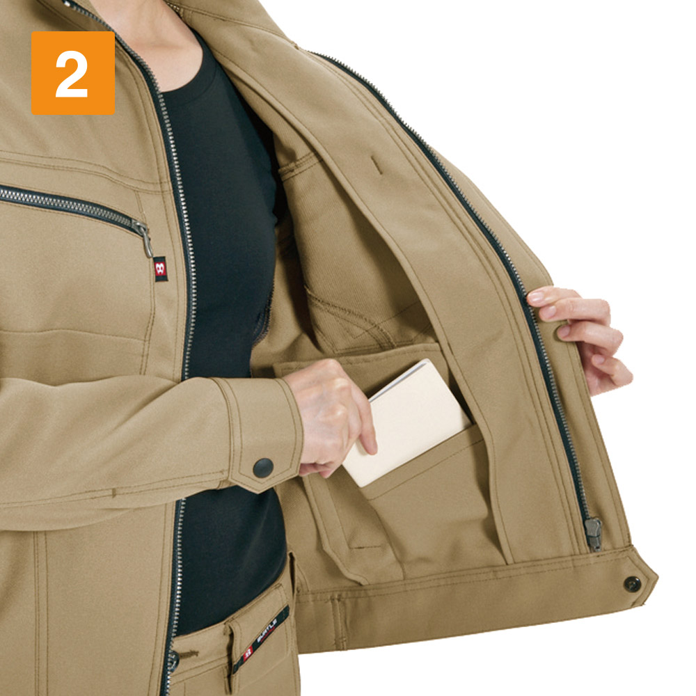 上半身の動きをスムーズにサポートする、メカニカルストレッチ機能をもつジャケット。分厚く硬い素材の場合、上半身の動きを邪魔して肩の突っ張りなどを感じやすいもの。こちらのジャケットは、45ダイヤカットや背アームノーフォークが、腕や肩の動きをジャケットが邪魔しないように工夫。腕を上げ下げする動作や、荷物を持ち運びする動作、後方を振り返って確認する際など、さまざまな上半身の動きをサポート。全身を使う作業や敷地が広く移動の多い職場などでも活躍します。