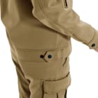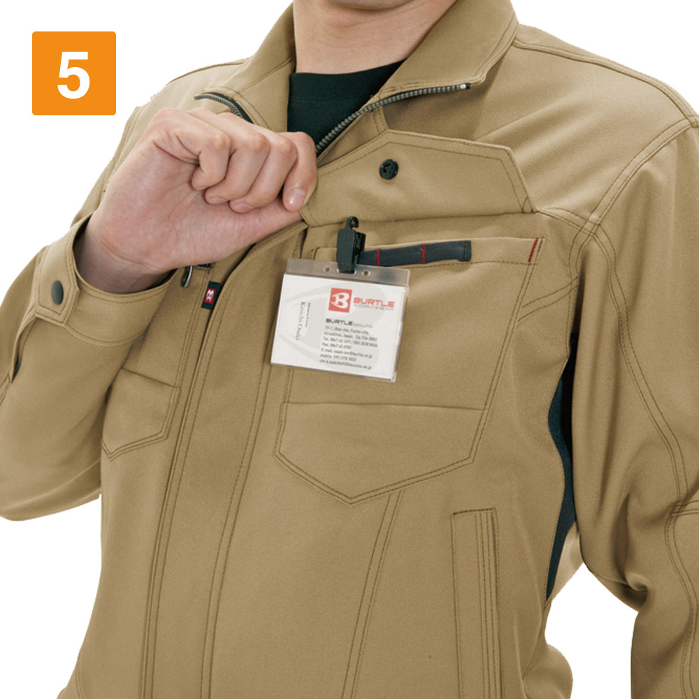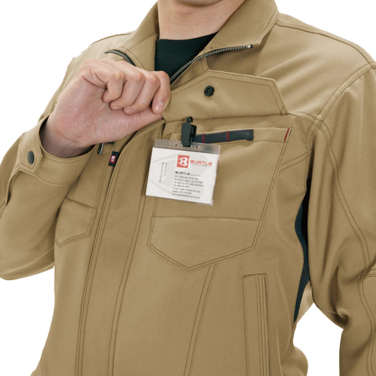 自分の好きなように使える多数ポケットは、業務内容や普段どんな体勢で作業するかによって自由にカスタマイズするのにもピッタリです。左右の胸ポケットはフラップ付きとジップ式の2種類なので、落としやすいカギなどはジップ式の右胸ポケットなどと使い分けることも。左胸ポケットはレベルブックが収まる深さ20cm。またフラップをめくると、ネームホルダーを収めておけるループが付いているのも特徴。作業員の多い職場でも、ネームホルダーでパッと人物の確認をとりたい場合におすすめです。