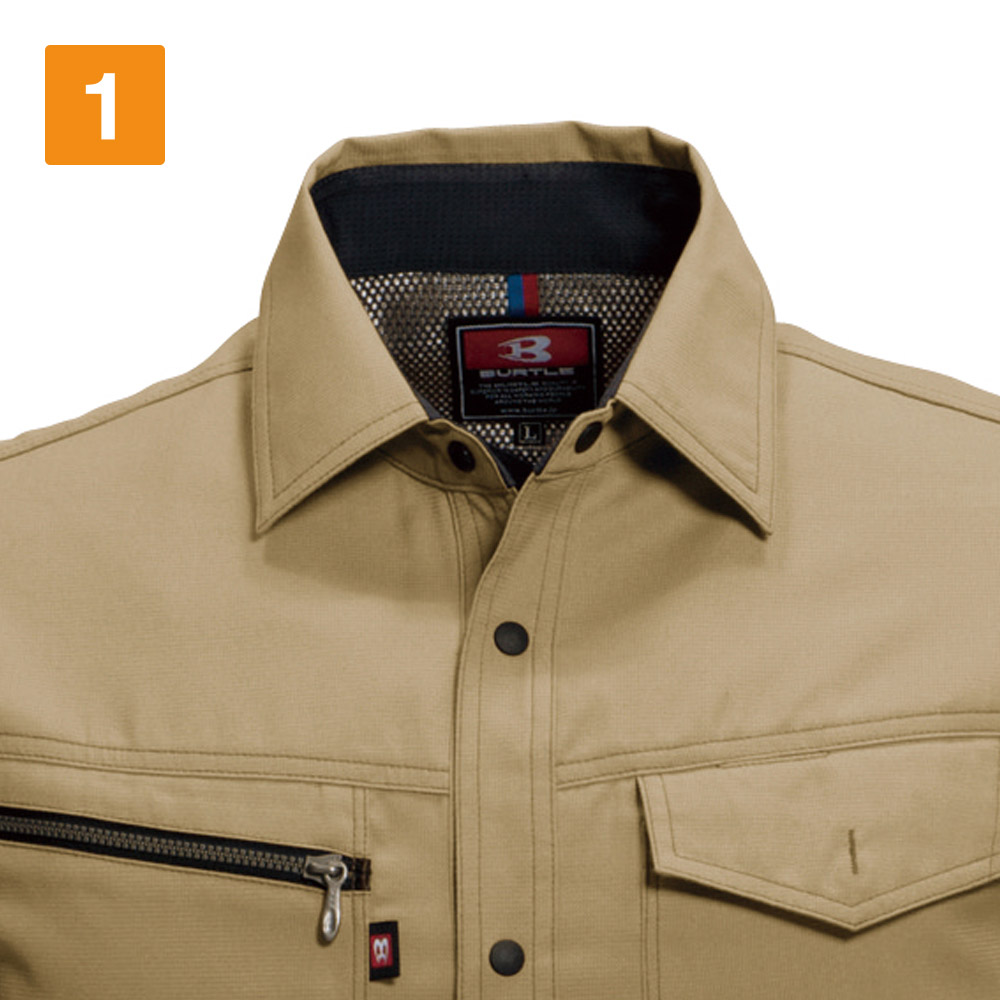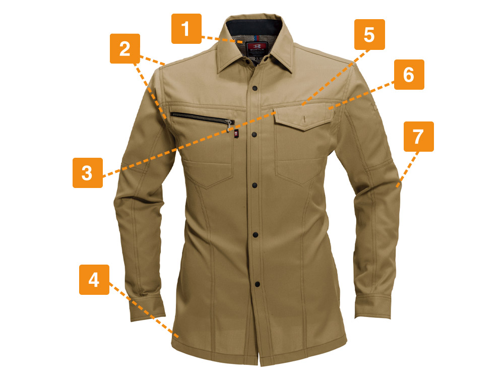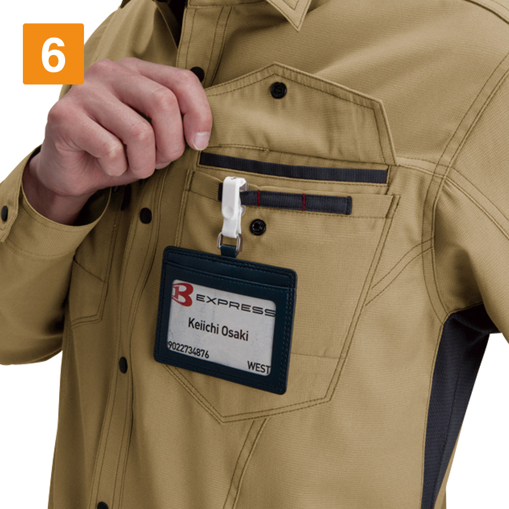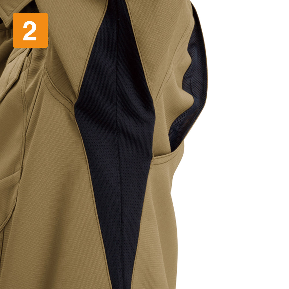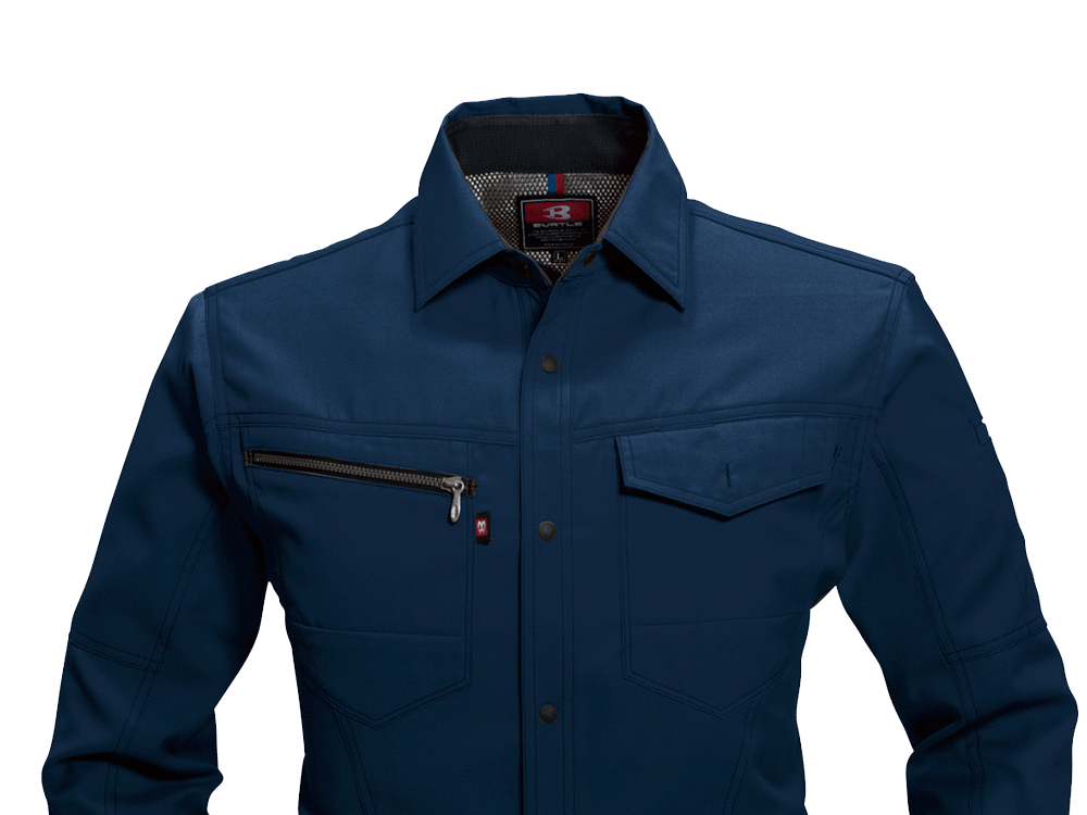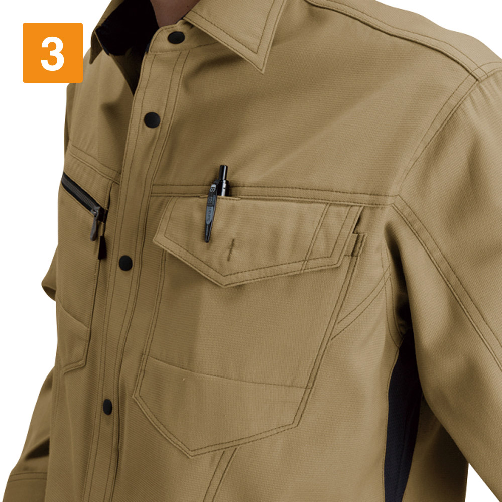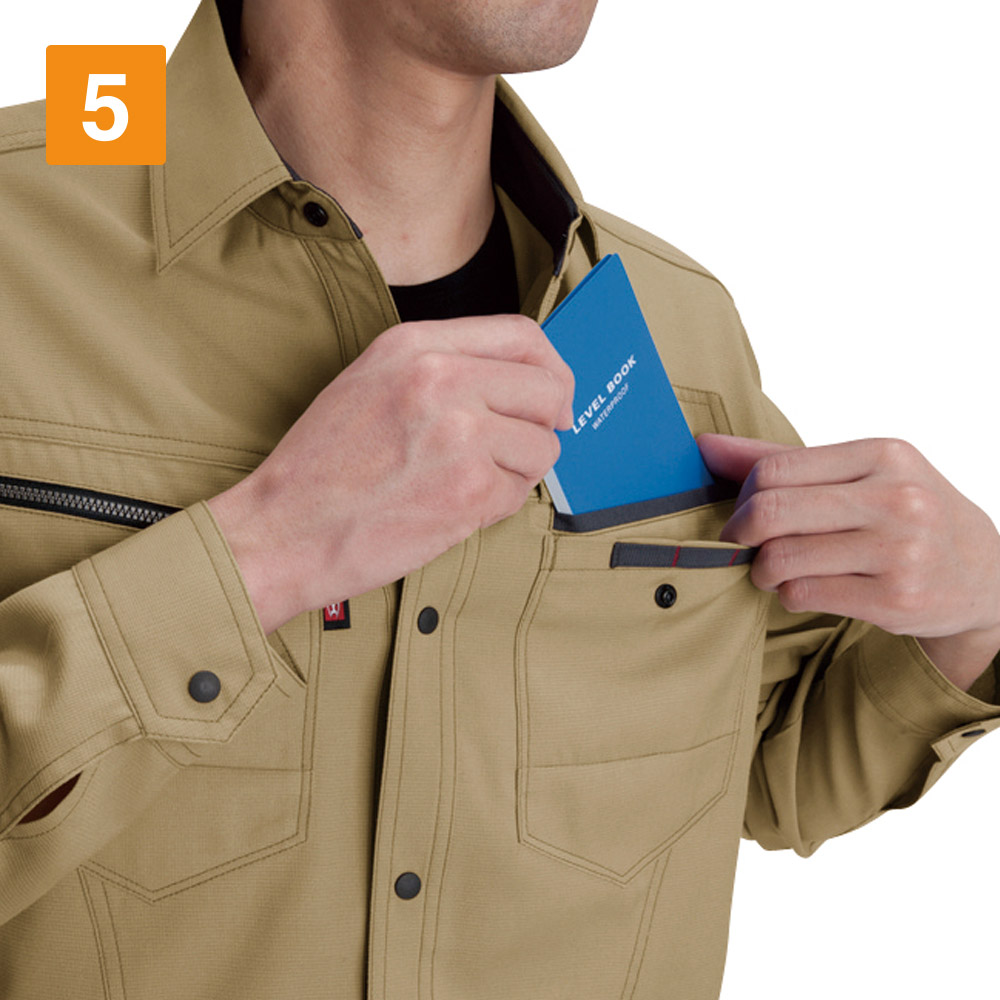 シャツを着る際、肩の張り感や腕の可動域がどれだけ自由にできるかはとても大切。実際のワークシーンでは、物を持ち上げたり、機械操作などで腕を上下させたりと、身動きがスムーズにできることが作業効率に直結します。こちらのシャツは脇を45ダイヤカットにすることで、腕を上げたり下げたりする動作をよりスムーズに助けます。背の部分もノーフォークだから肩周りの可動も円滑に。使い勝手の良い収納ポケットが左右の胸についており、レベルブックやメモ帳を入れておくのにもぴったりです。