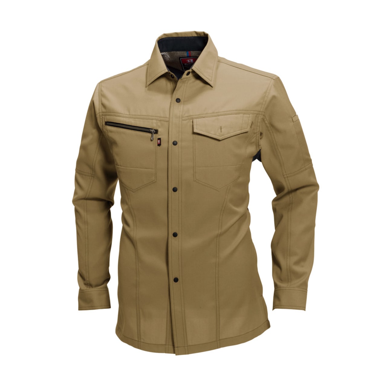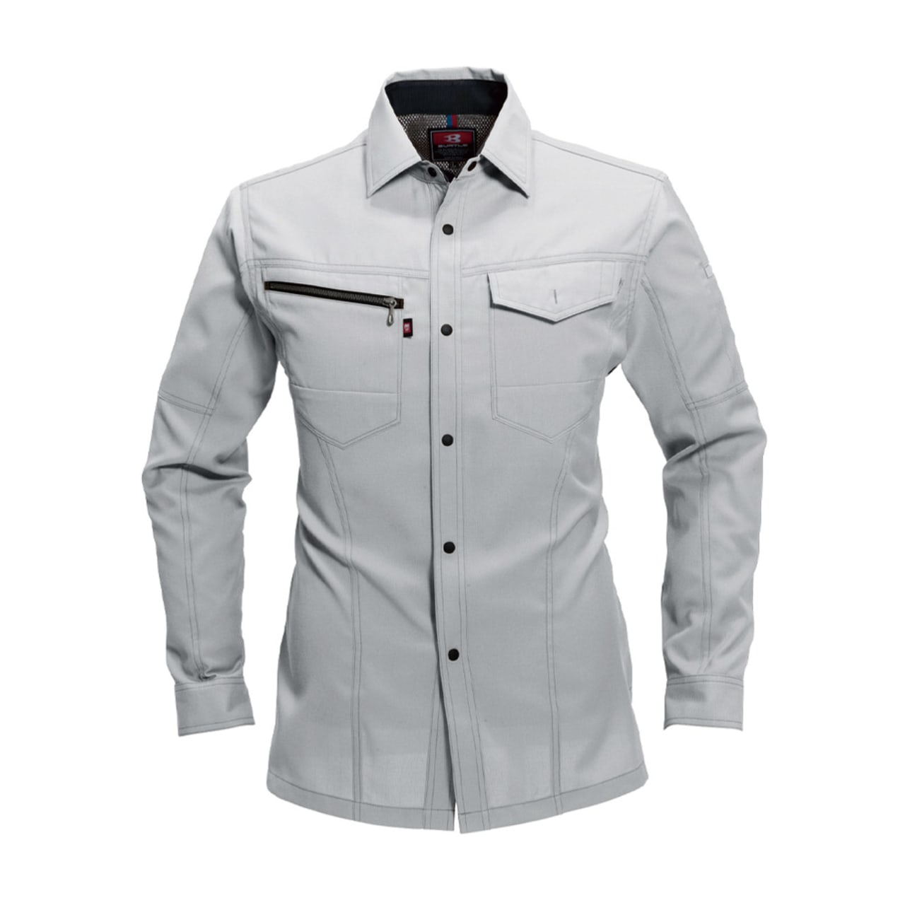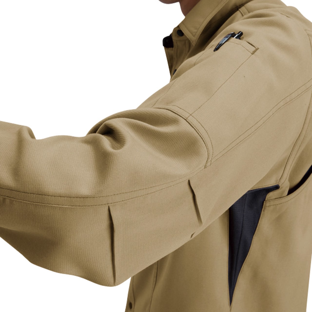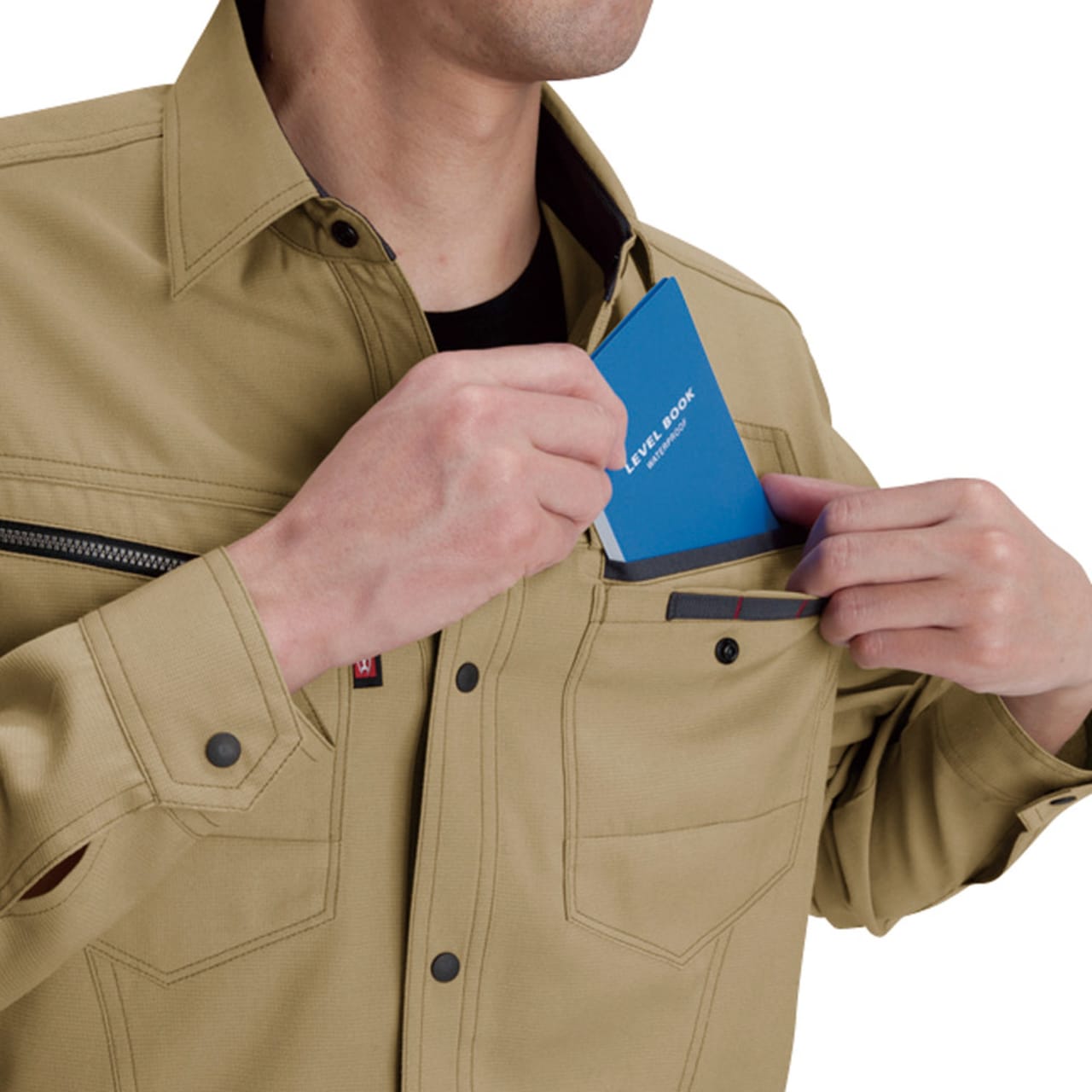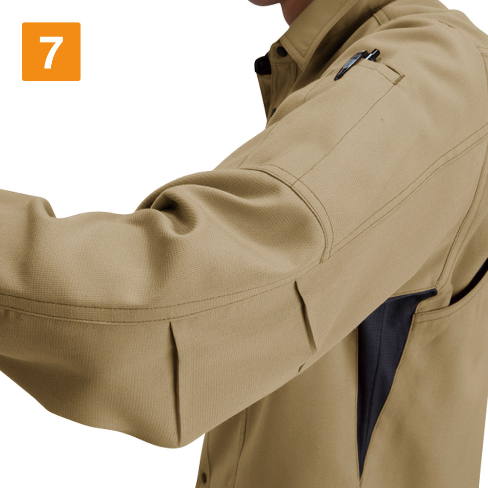 シャツを着る際、肩の張り感や腕の可動域がどれだけ自由にできるかはとても大切。実際のワークシーンでは、物を持ち上げたり、機械操作などで腕を上下させたりと、身動きがスムーズにできることが作業効率に直結します。こちらのシャツは脇を45ダイヤカットにすることで、腕を上げたり下げたりする動作をよりスムーズに助けます。背の部分もノーフォークだから肩周りの可動も円滑に。使い勝手の良い収納ポケットが左右の胸についており、レベルブックやメモ帳を入れておくのにもぴったりです。