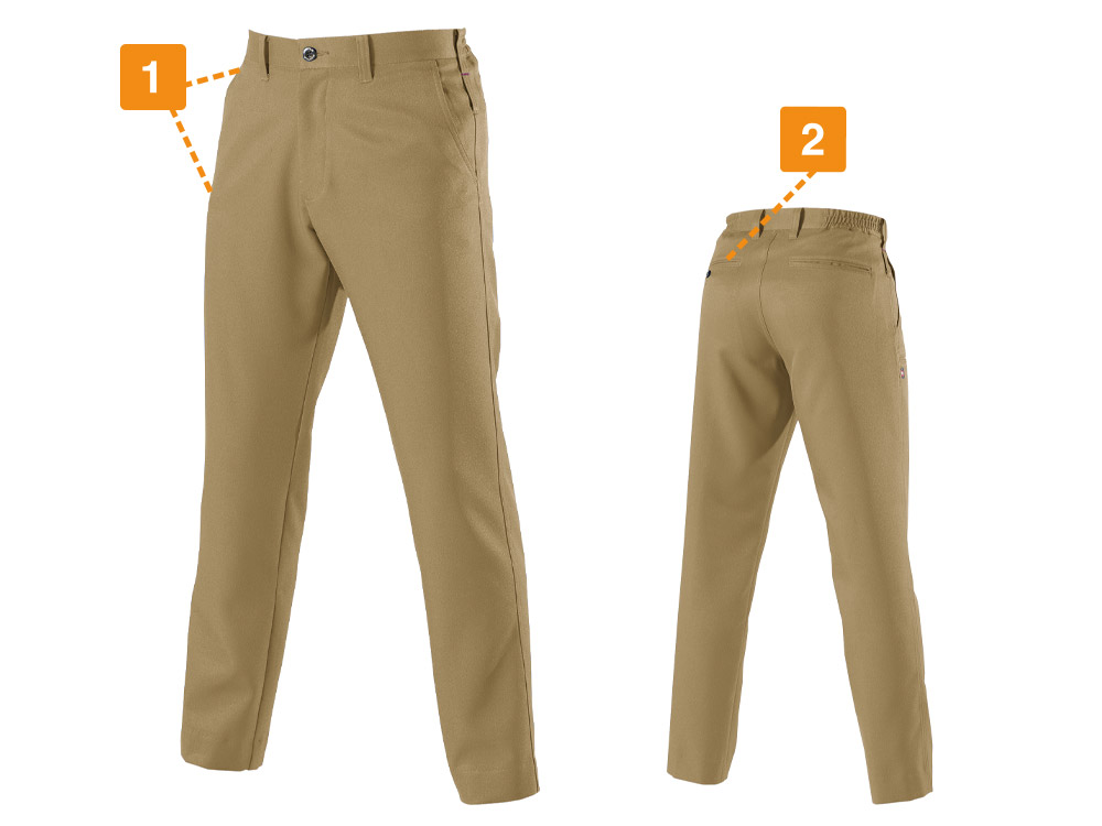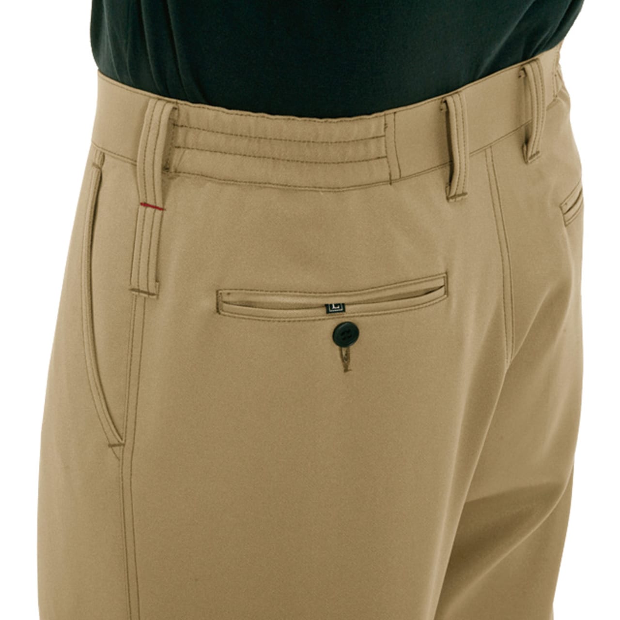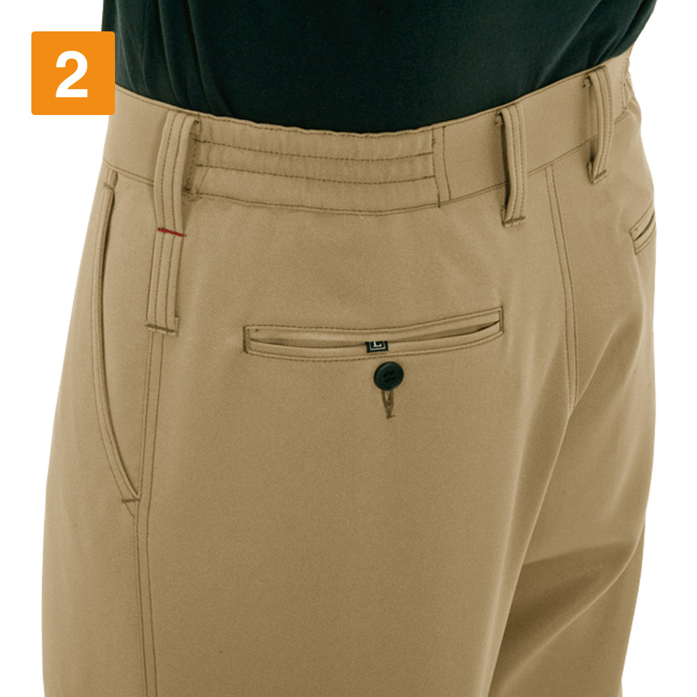 こちらのパンツは、ポケットは太ももに1つ、カラビナやポケットを付帯できるツインループは両脇に設置。後ろにも左右のポケットが付いていますが、必要最低限のポケットだから、下半身も身軽で動作に集中できるのが特徴。道具や小物はあまり使わない・持ち運ばないけれど、下半身を身軽に動きやすく作業したい職場にはピッタリのデザインです。後脇がシャーリングのゴム仕様になっているので腰回りを程よく引き締め、無駄なゆとりによる動きにくさを軽減します。