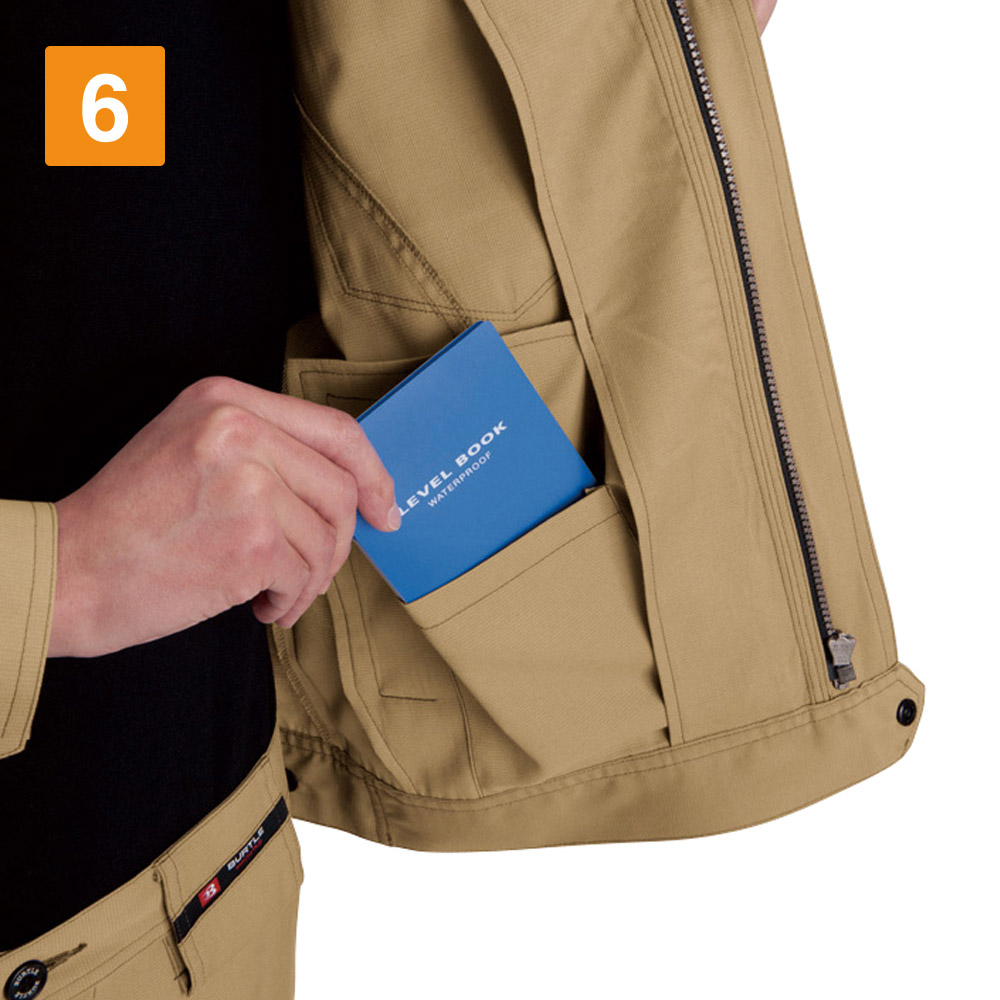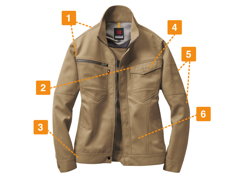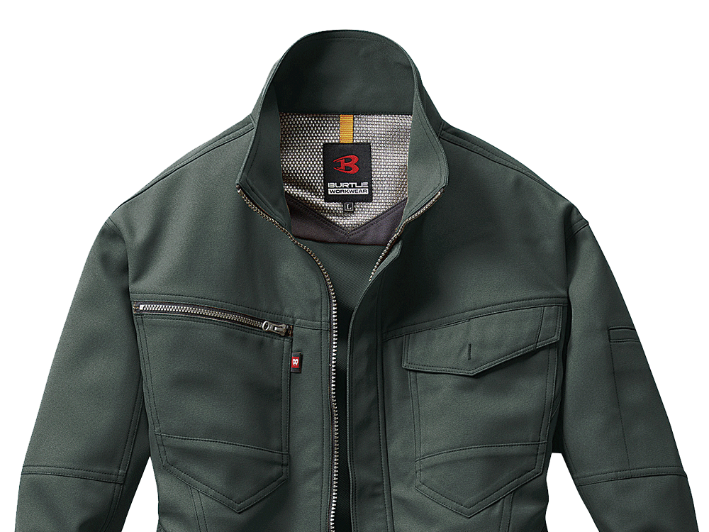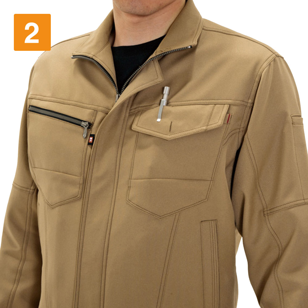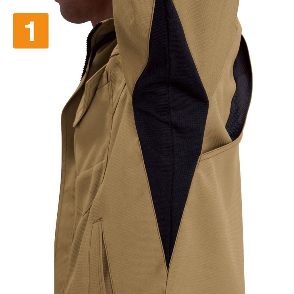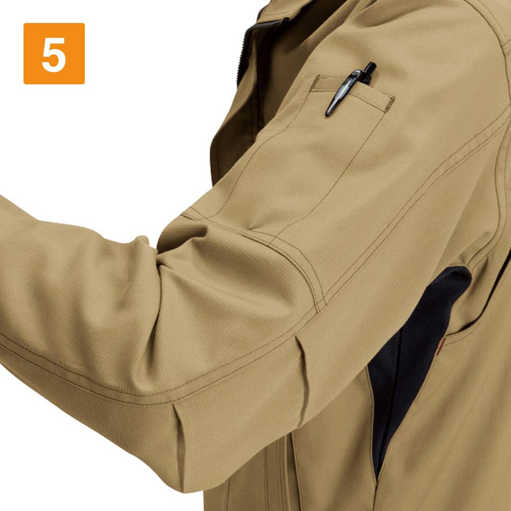 屋内・屋外ともに使えるオールラウンドなジャケット。しっかり首元までジップアップでき、脱ぎ着もしやすいため、屋内の空調や屋外での外気の温度からも適度に体温調節をしながら、作業に集中できます。動きやすさにも工夫をこらし、特に脇下には吸水ニットを使用した独自のダイヤカットを採用。腕の上げ下げの多い機械操作や運搬作業をする現場にも重宝します。多数のポケットを搭載し、胸ポケットや内ポケットなどから使いやすいポジションを選んで使うことが可能です。