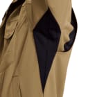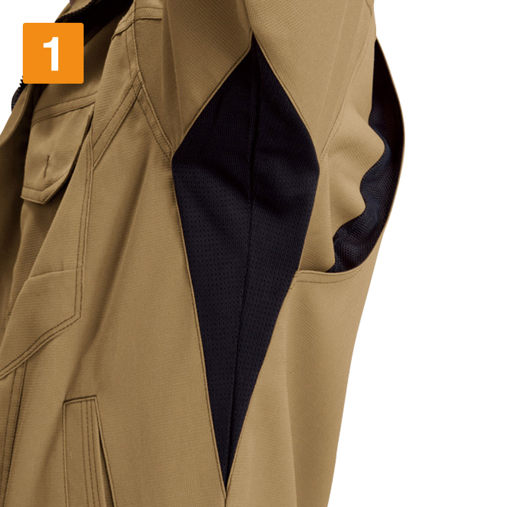 ドビークロス素材を使用することで、吸水性をアップ。汗をよく吸い込み、作業中の体温調節や汗による不快感を防ぎます。また、腕の動きが激しく蒸れやすい脇部分を、独自の吸水ニット素材にすることで、さらに吸水性を高めているのも特徴。ニット素材部分は、45ダイヤカットにすることで、腕を上げた際の突っ張り感も軽減。ポリエステルを85%使用しているため、洗濯しても比較的すぐに乾きやすいのも魅力です。