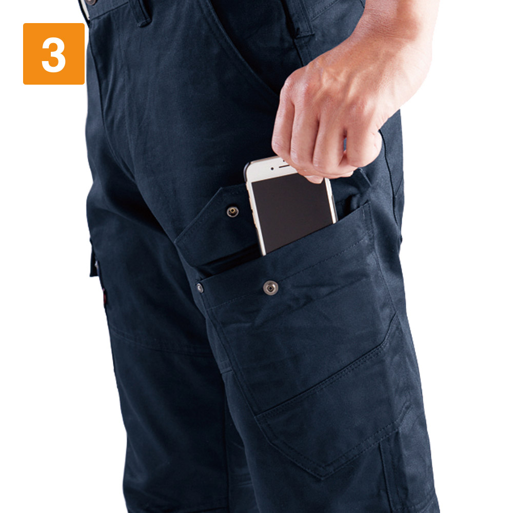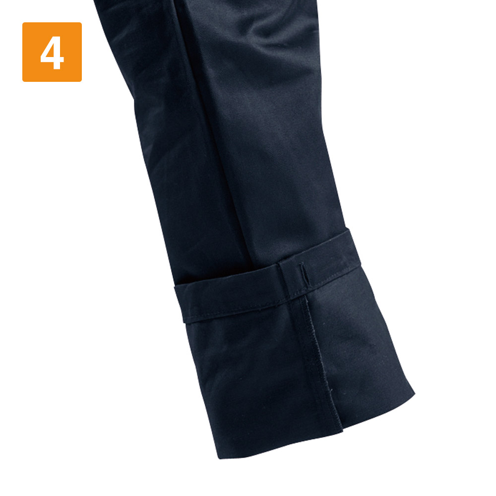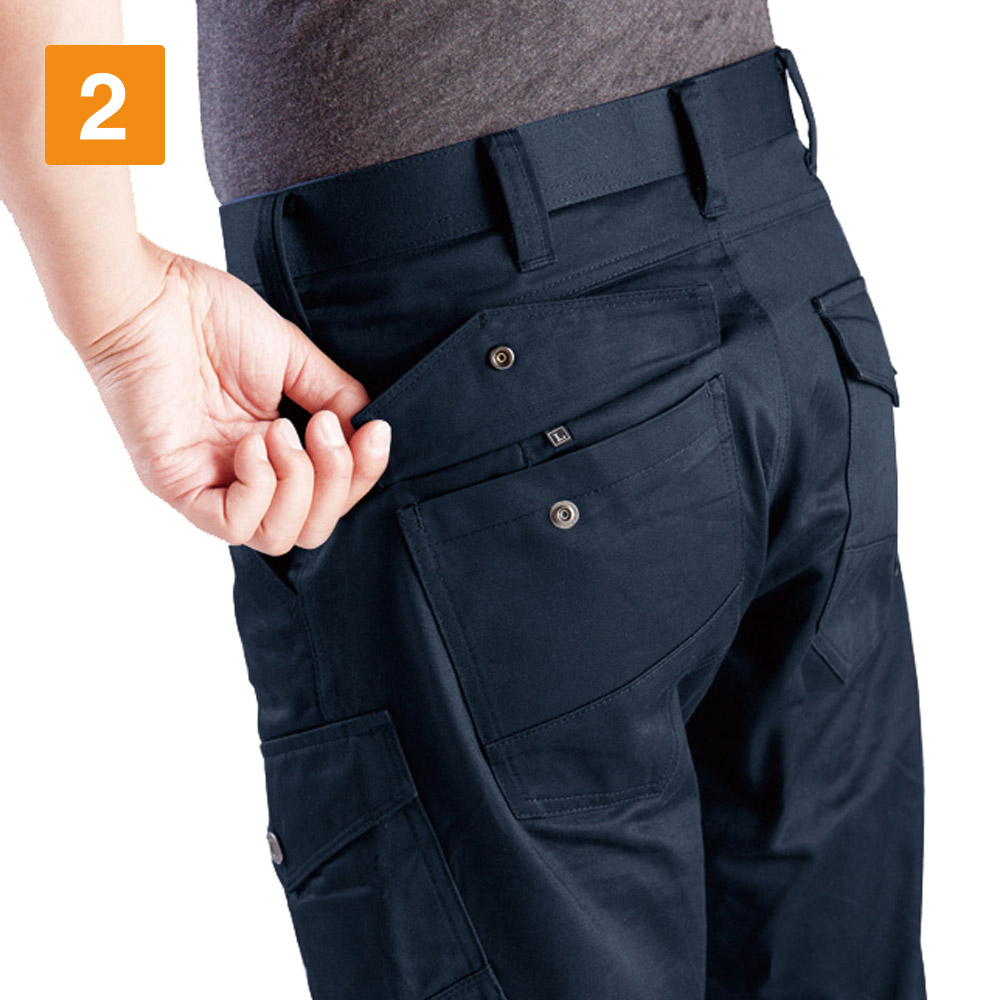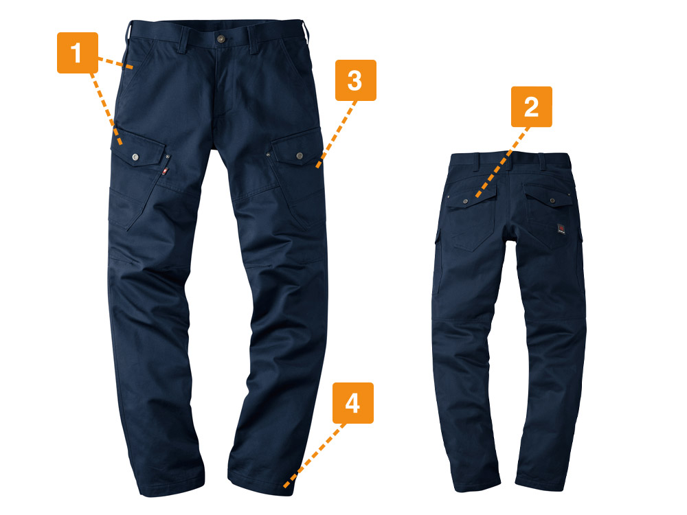 スリムなシルエットで作業の邪魔にならない綿100%素材のワークパンツ