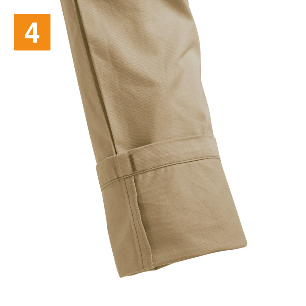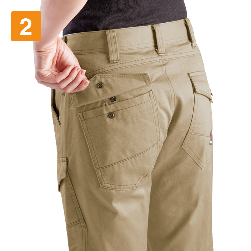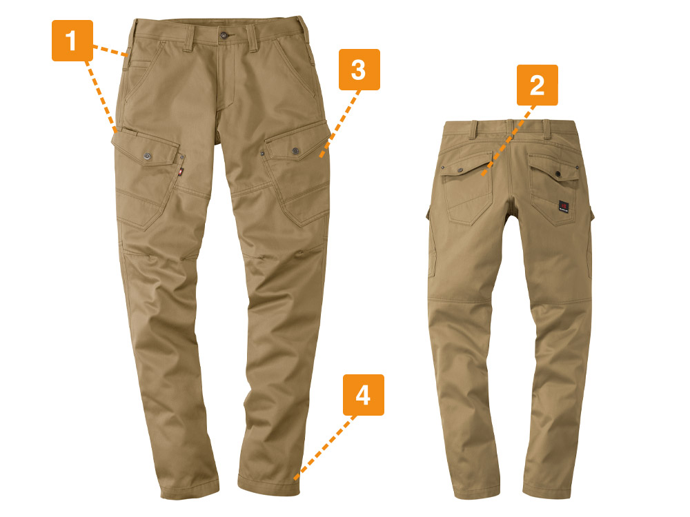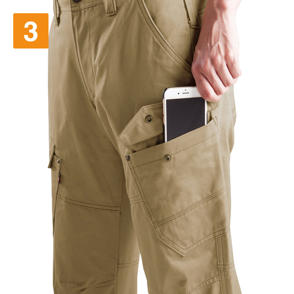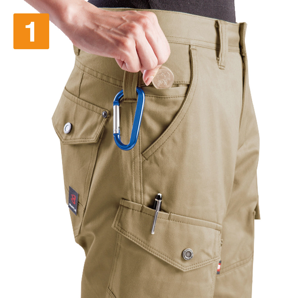 男性向けのワークパンツが多い中、こちらは現場で働く女性ワーカーのために開発されたアイテムです。女性らしいシルエットを残しつつ、スリムに履きこなせるため、多くの女性ワーカーから受け入れられやすいカーゴパンツに仕上がっています。素材として使用しているのは、綿100%の高密度肉厚綿ツイル生地となります。そのため冬あたたかく夏は涼しく過ごすことができます。吸水性や吸湿性にも優れており、汗をかいてもしっかりと吸収し快適さを長持ちさせてくれます。綿ならではのなめらかな手触りも特徴で、肌触りにもこだわる女性ワーカーから選ばれるだけの要素を兼ね備えたアイテムです。