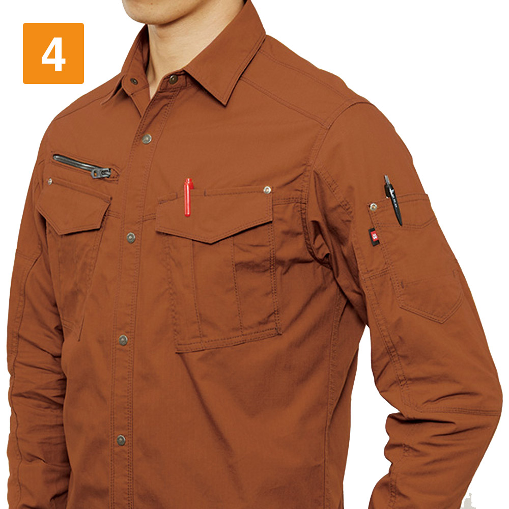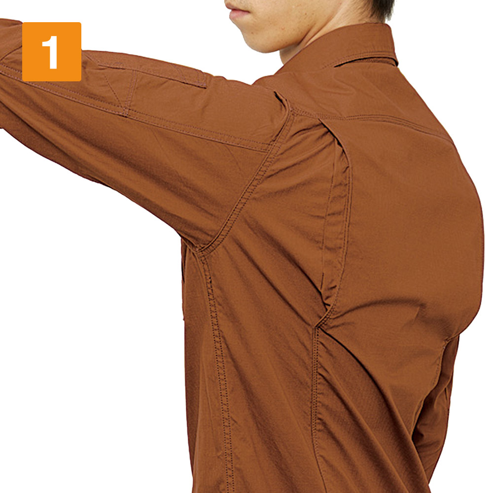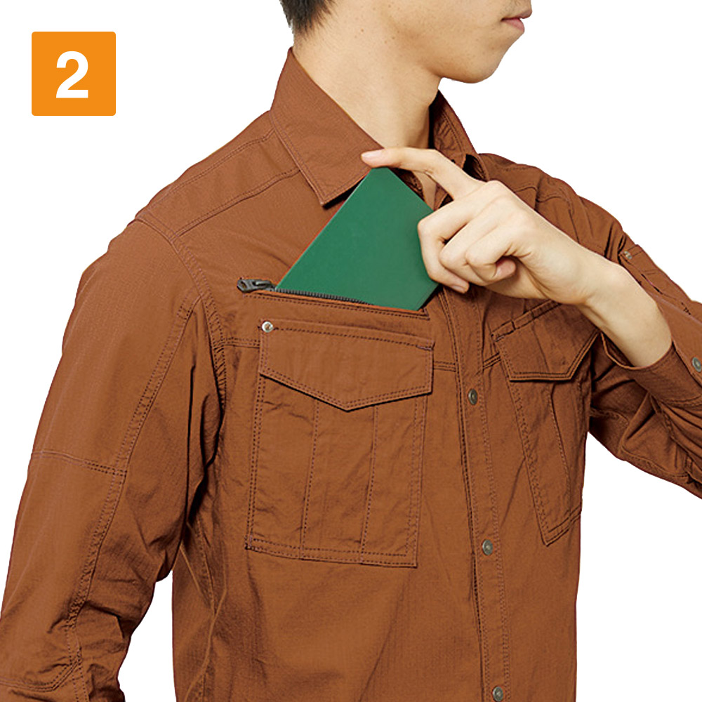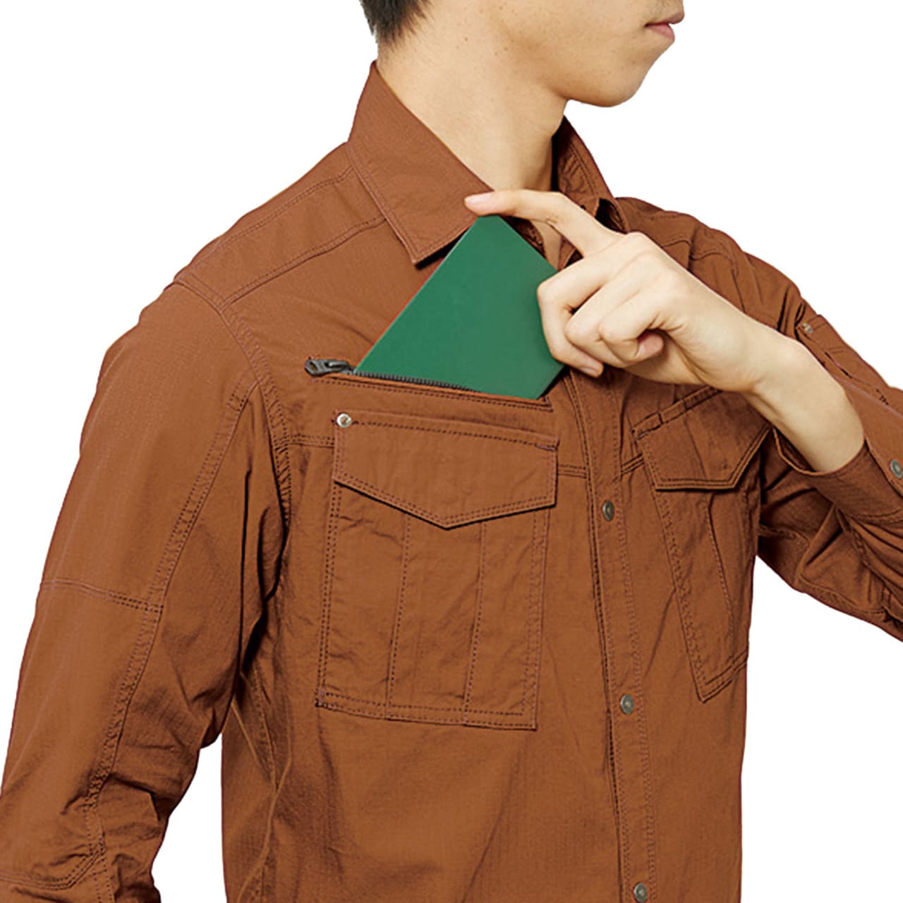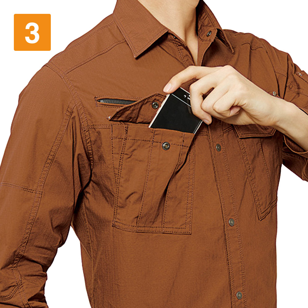 ワーカーのスムーズな動きをサポートするため、背アームノーフォーク加工を施しています。この加工により、腕を大きく動かしても抵抗になりにくく、さまざまなアクションが可能です。胸ポケットは20cmの深さがあり、メモ帳やスパナ、スケール、部品などの収納もできます。携帯電話専用の収納スペースも確保してあるほか、ペン挿し、ペンポケットも備わっています。ワーカーの機動性を向上させる工夫と、収納力を高めることに成功したアイテムです。