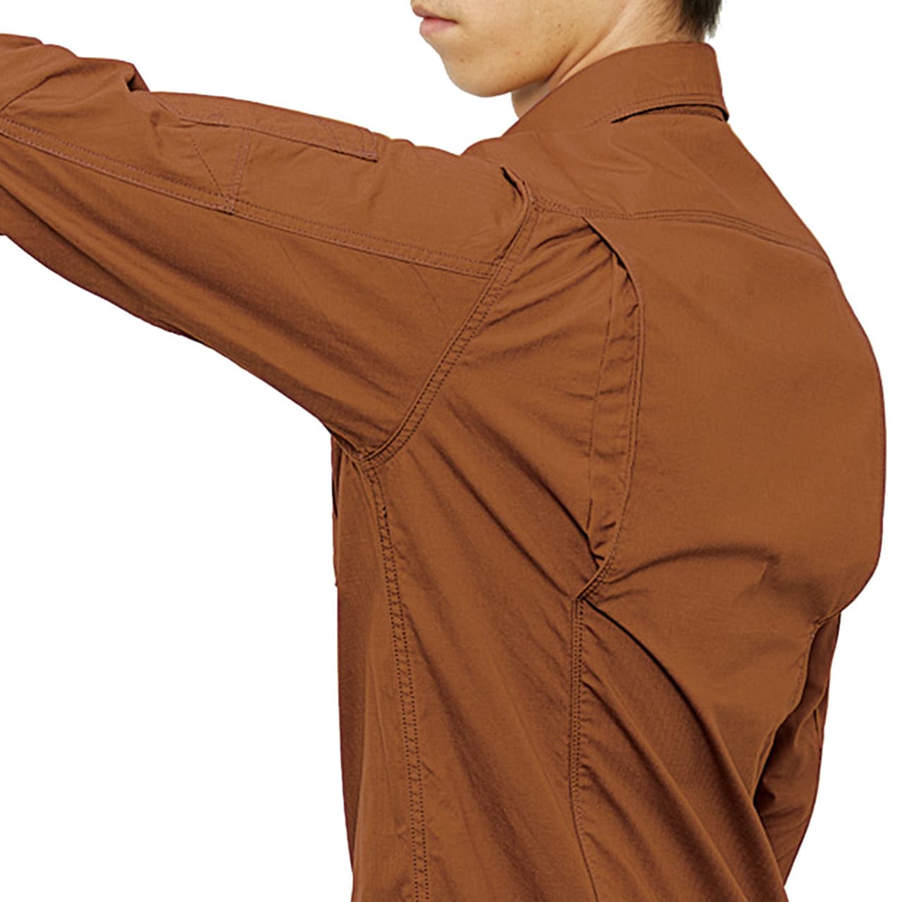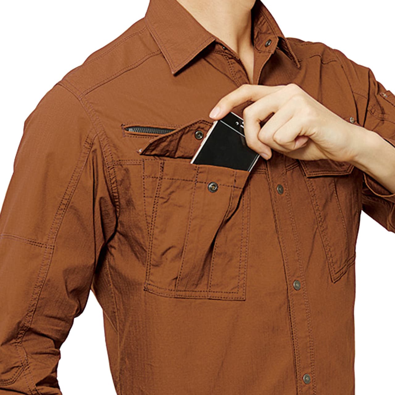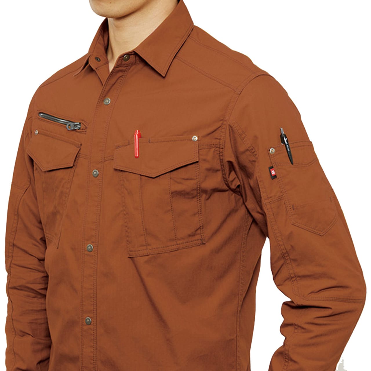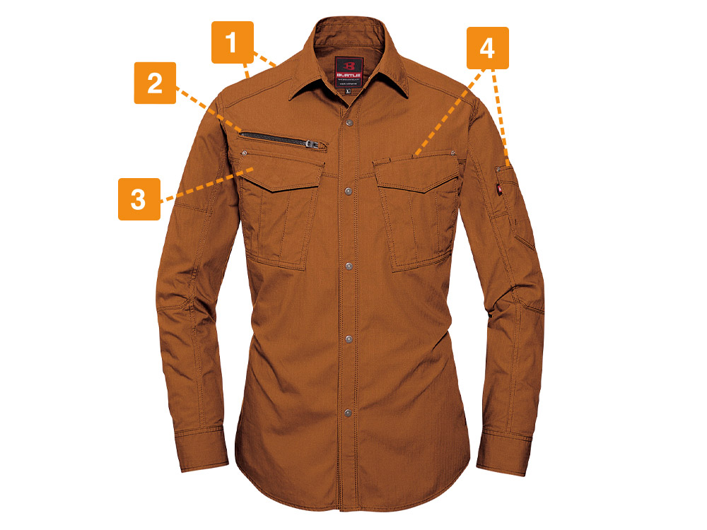 ワーカーのスムーズな動きをサポートするため、背アームノーフォーク加工を施しています。この加工により、腕を大きく動かしても抵抗になりにくく、さまざまなアクションが可能です。胸ポケットは20cmの深さがあり、メモ帳やスパナ、スケール、部品などの収納もできます。携帯電話専用の収納スペースも確保してあるほか、ペン挿し、ペンポケットも備わっています。ワーカーの機動性を向上させる工夫と、収納力を高めることに成功したアイテムです。