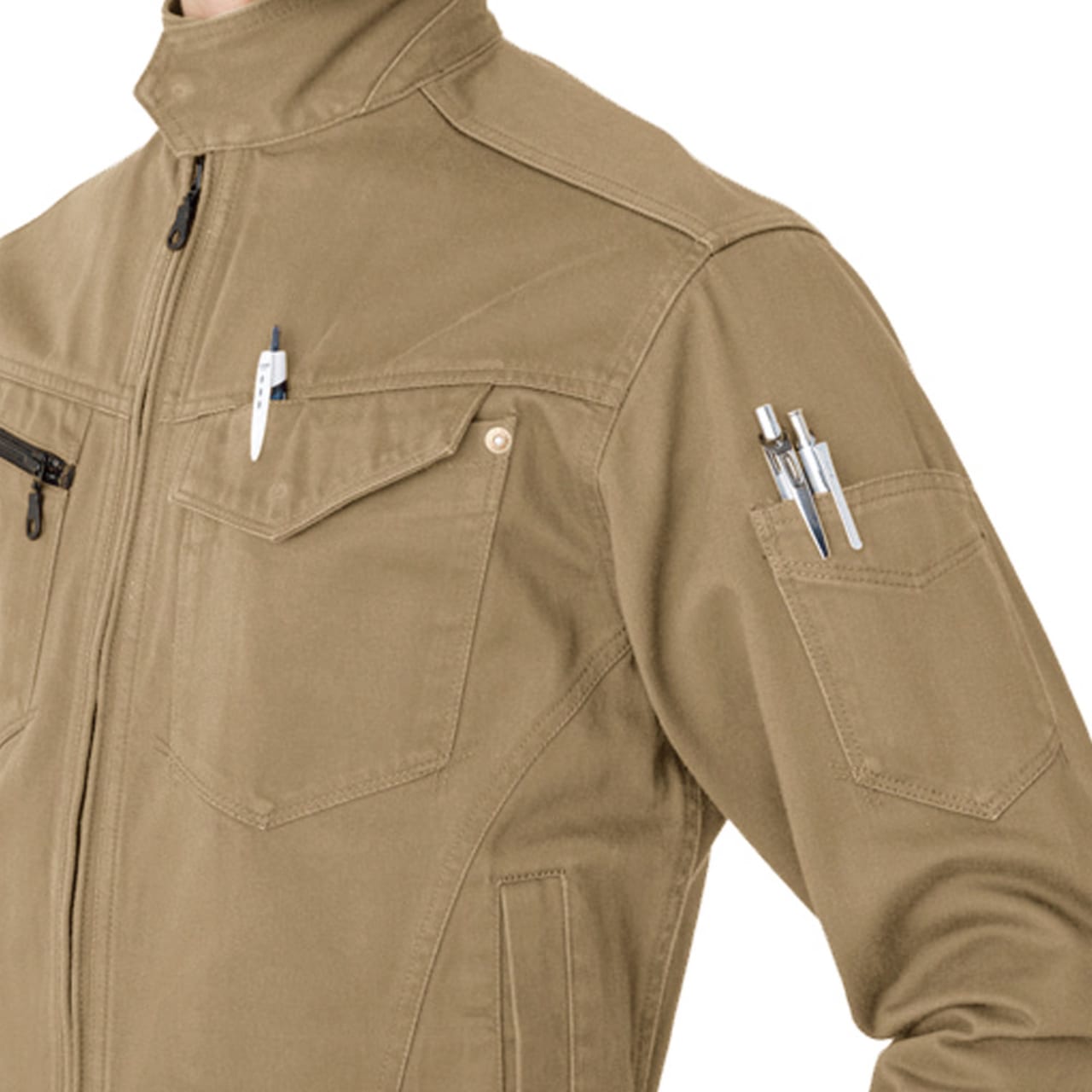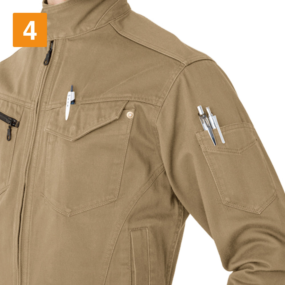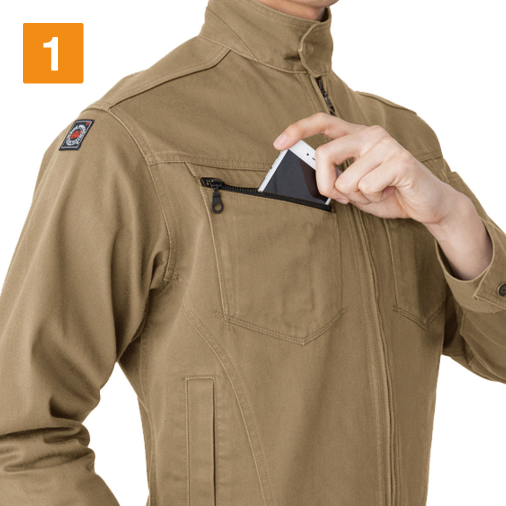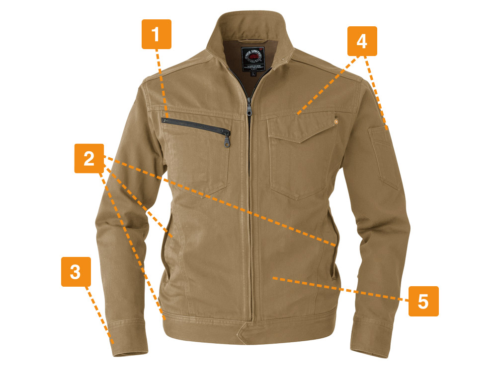 高品質な国産素材を使い、丁寧に作り上げたワークジャケットです。ヴィンテージサテン生地ならではの風合いが特徴的で、ワークウェアに必要な機能性もしっかり盛り込まれたアイテムとなります。現場や業種を問わず、オールマイティに着用できるのも、選ばれている理由です。保温性に優れる綿素材を使用しているため、秋冬シーズンにおいて快適に着用できるジャケットです。ワーカーの体を冷えから守り、パフォーマンスの低下を防ぎます。風の吹きすさぶ屋外で作業する方や、冷凍庫、暖房のない屋内で働くワーカーなどにおすすめのアイテムです。