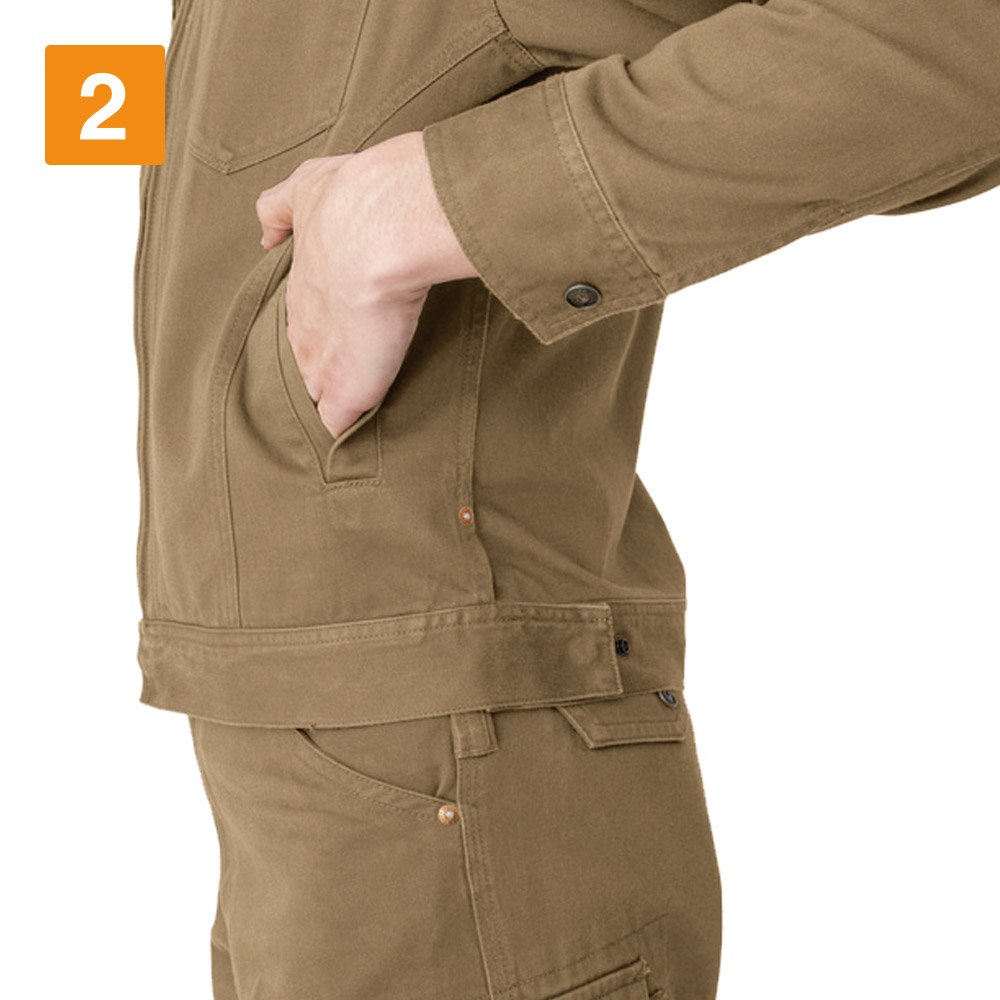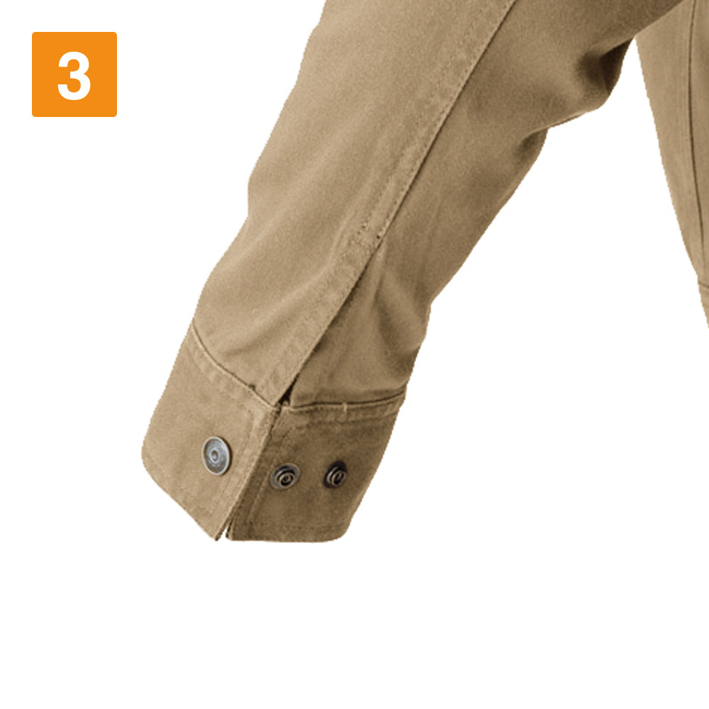 高密度織りを採用し、丈夫な生地に仕上げました。厚手の生地は強度があるため、過酷な現場でも問題なく着用できます。保型性も高いため型崩れを起こしにくく、日々のメンテナンスが容易なのも魅力的なポイントです。製品洗い加工により、ソフトな着心地も実現しました。ヴィンテージサテン生地は肌触りがよく、常に快適な状態で着用できます。綿は火や熱にも強い素材であるため、火気を取り扱う現場で働くワーカーにも適しています。