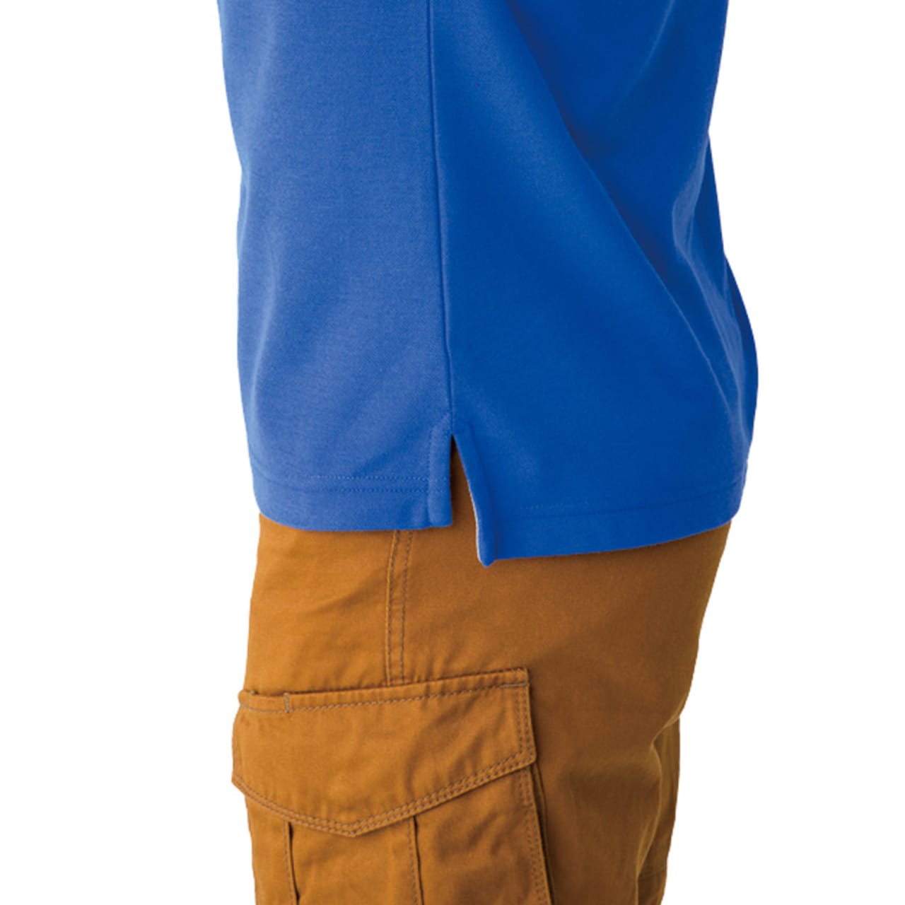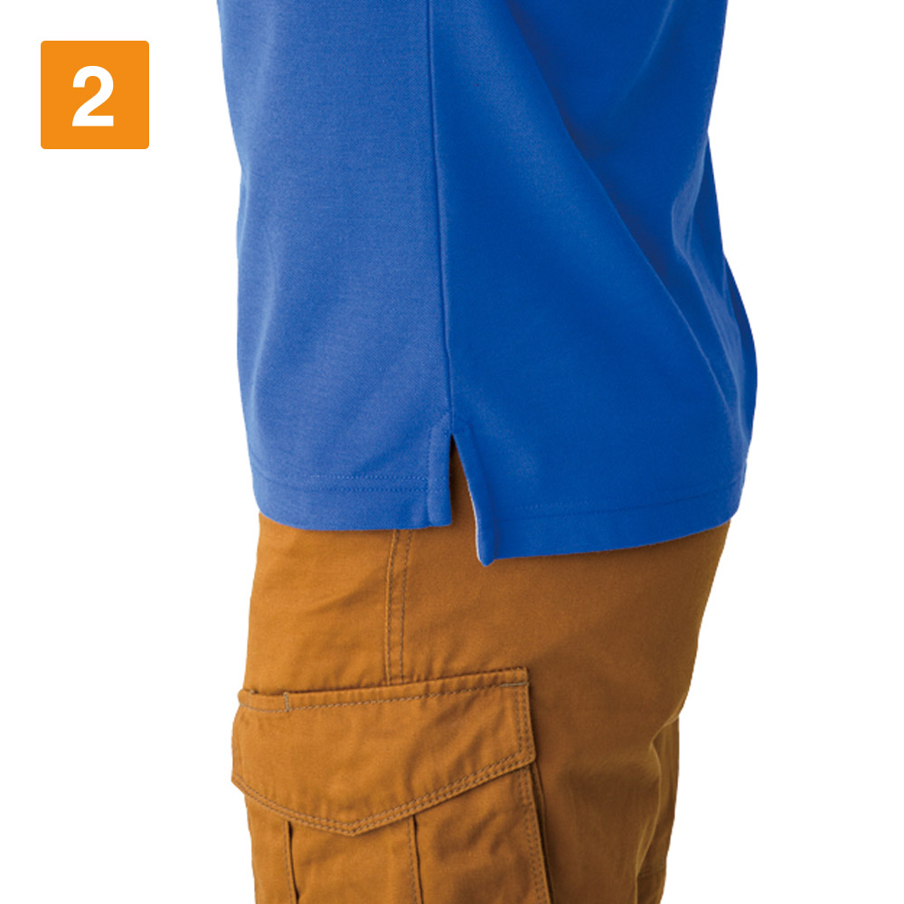 こちらのポロシャツは、鹿の子編みによって作られているところが大きなポイントです。表面に凹凸を作ることで、肌の接地面積を少なくしています。そのため、肌にできるだけ当たらないようになり、汗をかいた場合でもベタつきを感じることが少なく、快適な着心地を実現しました。また、通気性に優れているので、作業中多少汗をかいても熱気が内部にこもるような心配もありません。ポリエステルを主原料として使っているので、伸縮性に富んでいるのも特徴です。体を作業中ダイナミックに動かしたとしても、窮屈さを感じることもないでしょう。